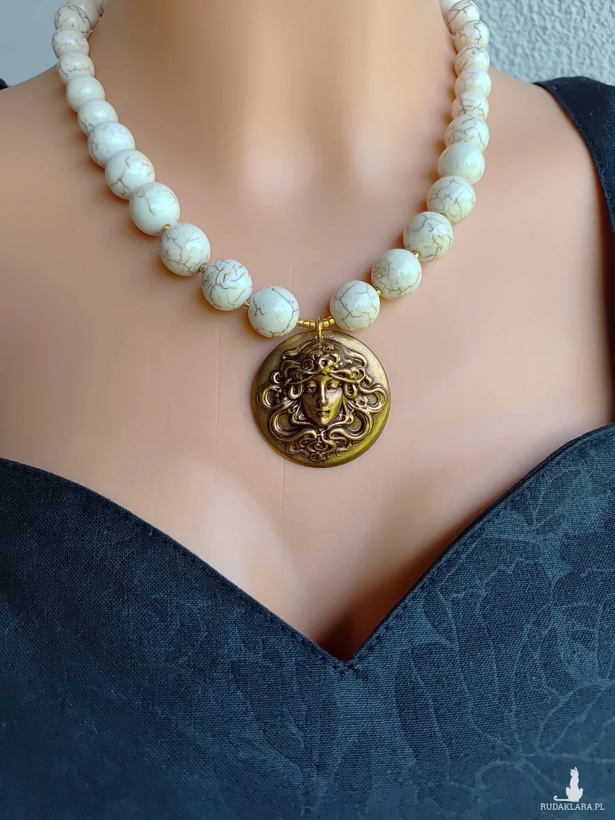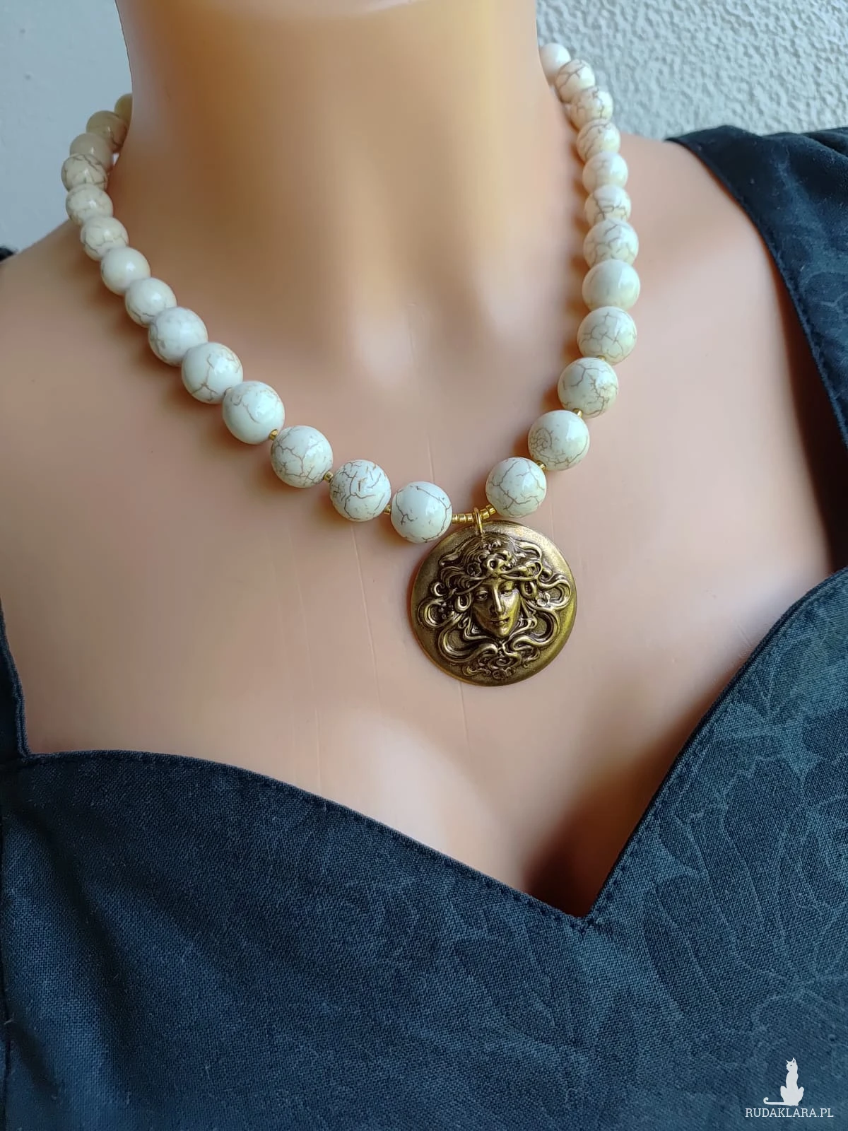Naszyjnik z dużych kul howlitu de lux. Kule 10 i 12 mm z przekładkami ze złotych japońskich koralików. Wisior duży 35 mm, piękna mosiężna wytłoczka meduzy. Objętość 44 cm plus łańcuszek 5 cm , zapięcie ze stali nierdzewnej. Naszyjnik z piękną cameą z czeskiego szkła, bogata w detale, w filigranowej oprawie , mosiężnej w kolorze starego złota. Korale kulki howlitu de lux, duże kulki howlitu 10 mm w kolorze kości słoniowej z delikatnymi żyłkami.Wykończenie ze stali w kolorze złotym. Objętość 42 cm plus łańcuszek 5 cm