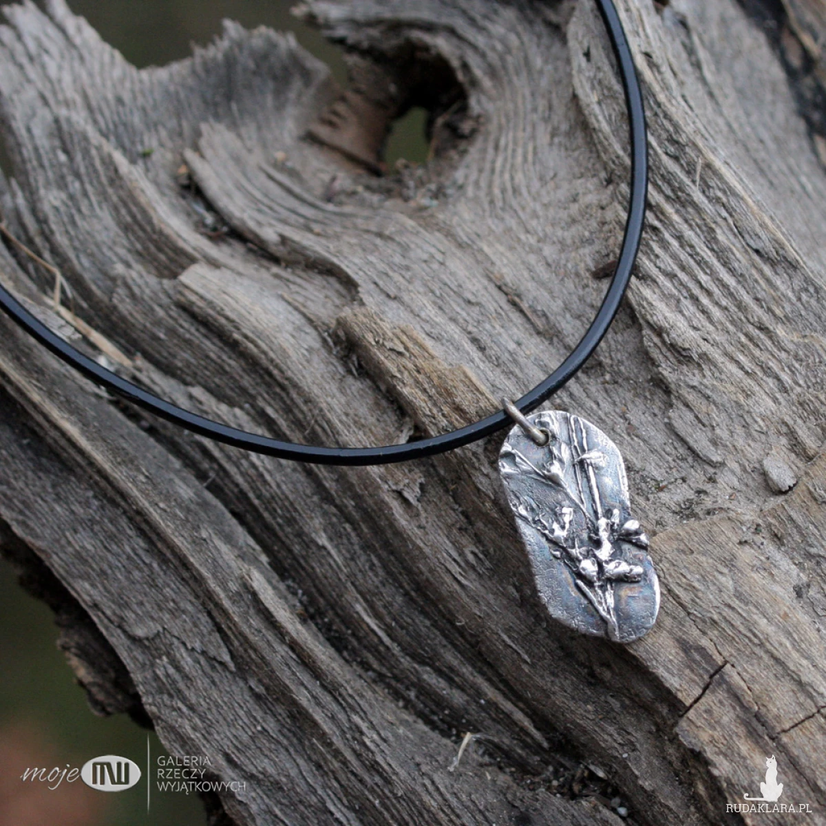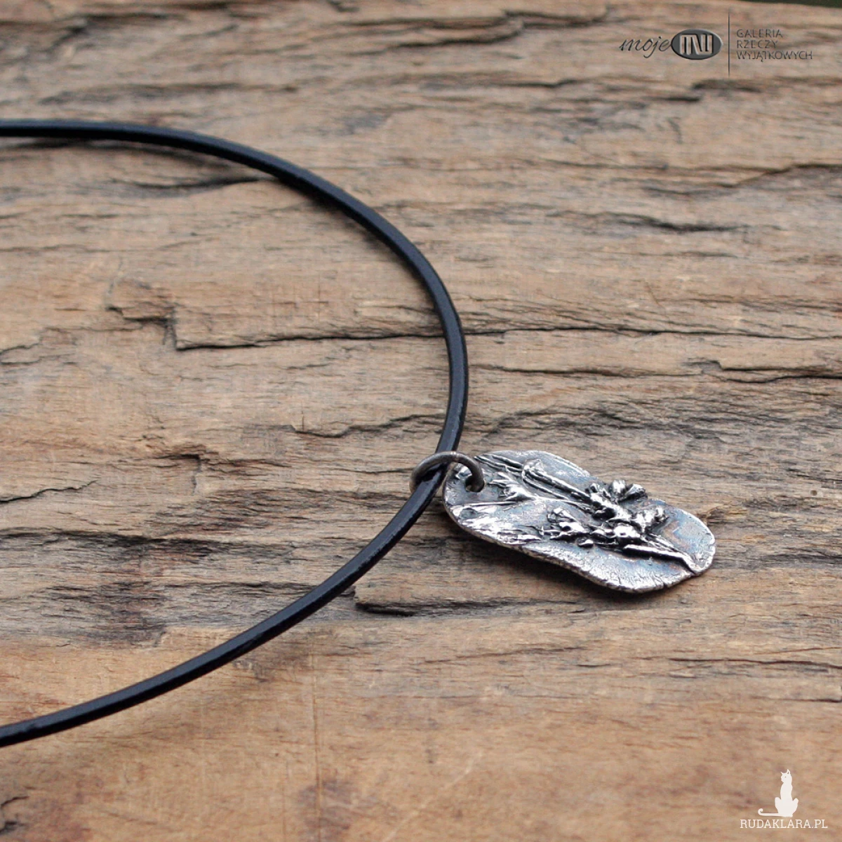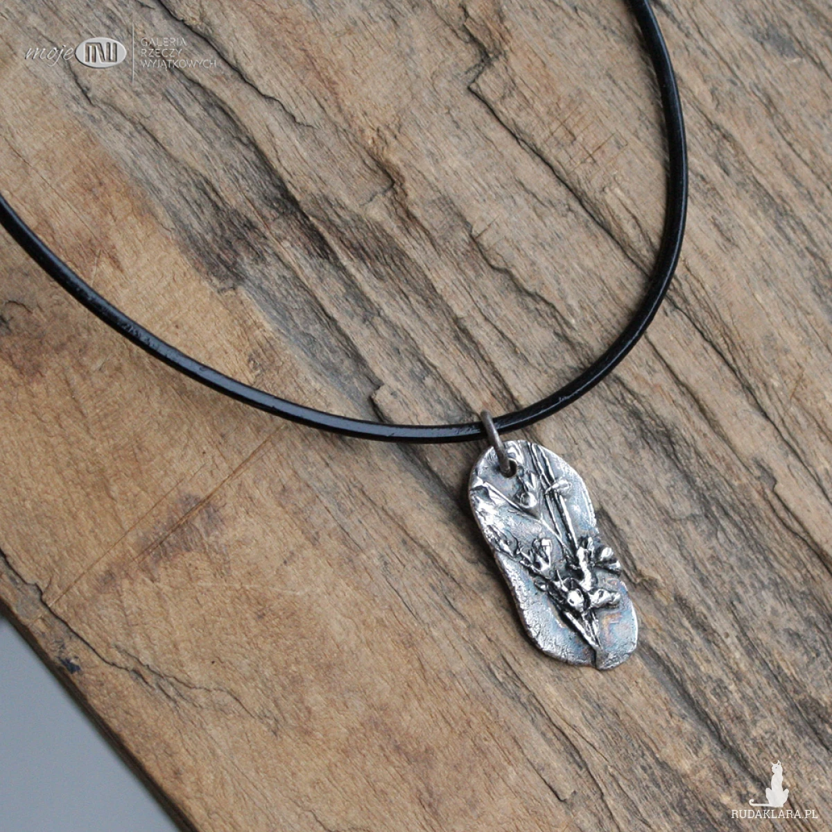 Wisiorek ze srebra wysokiej próby, z realistycznym wizerunkiem polnej roślinki, oksydowany i przecierany. Zawieszony jest na czarnym skórzanym rzemyku o gr. 2 mm. Zakończenia rzemienia i zapięcie są ze stali chirurgicznej.