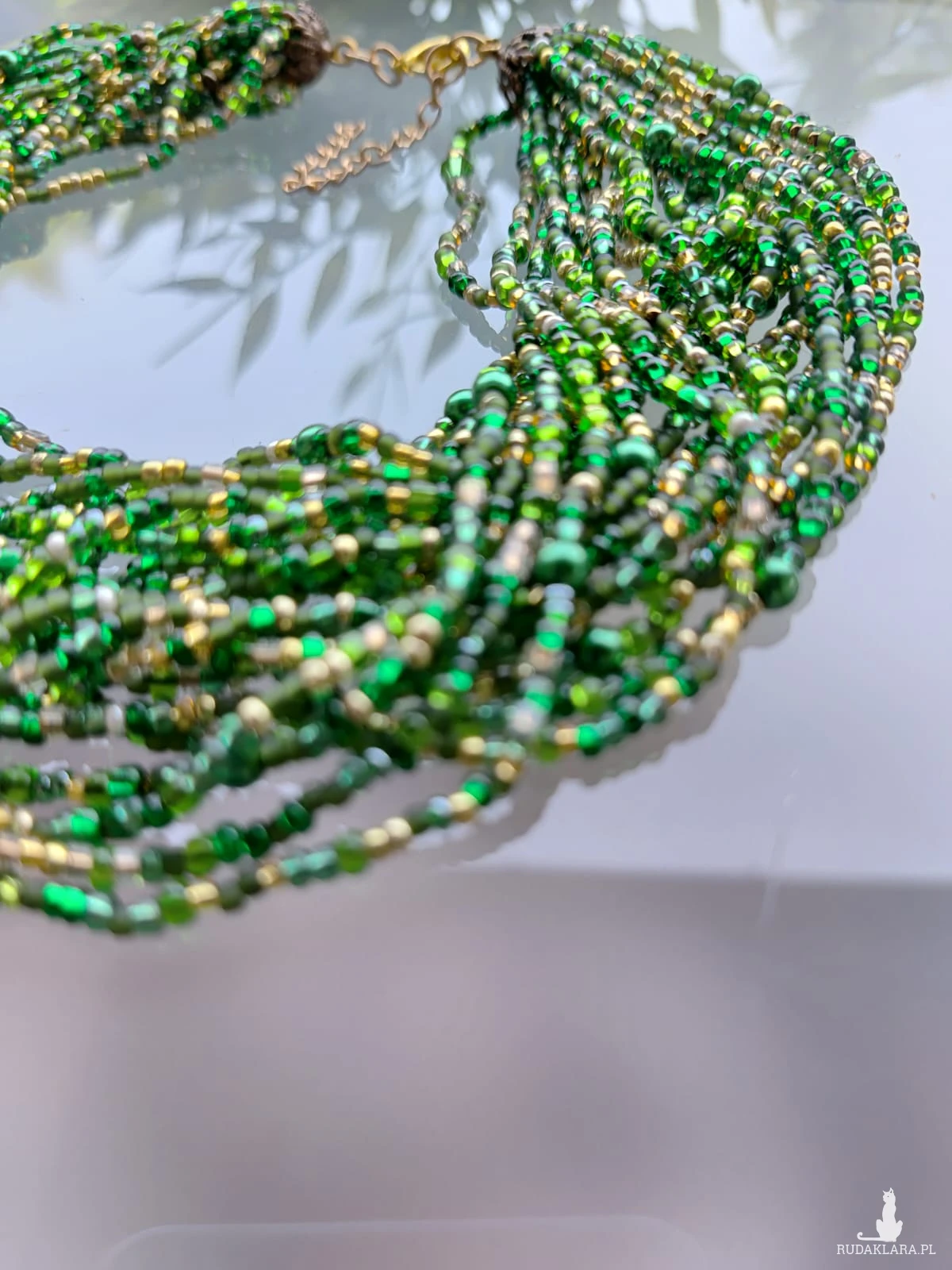 Naszyjnik z koralików szklanych w zielonym i złotym kolorze. Piękna