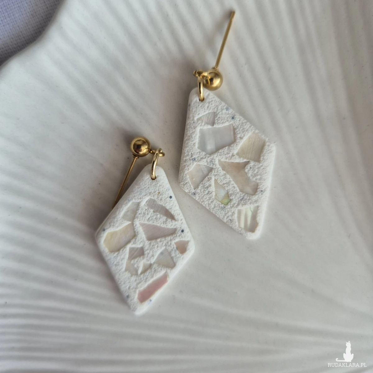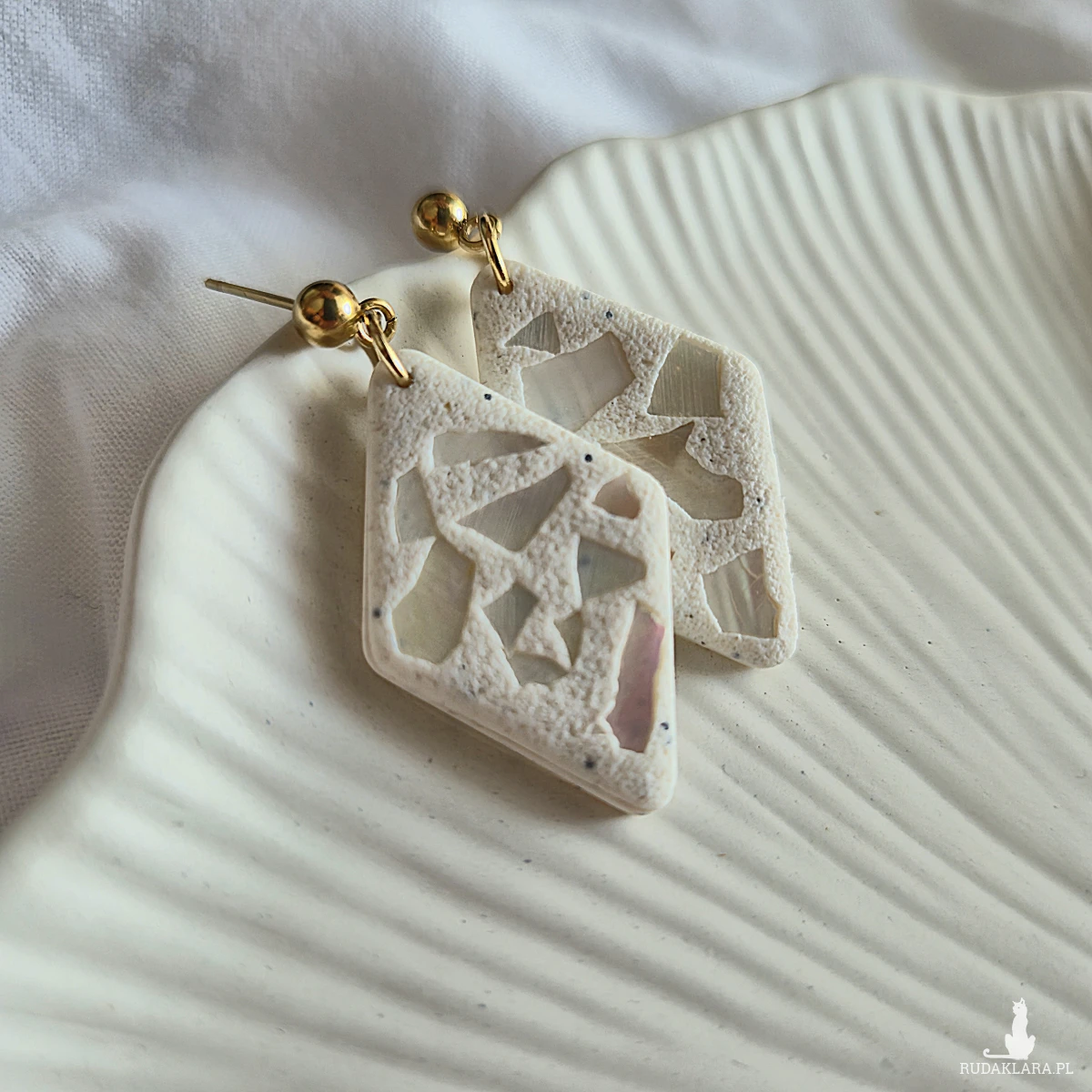Kolczyki Glossy beżowe to lekkie i eleganckie kolczyki wykonane z gliny polimerowej i okruszków masy perłowej na sztyfcie ze stali szlachetnej w złotym kolorze.