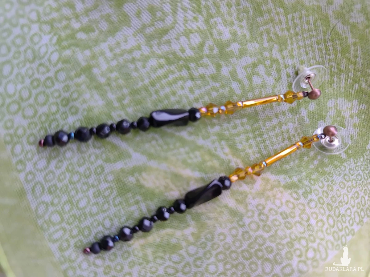 Kolczyki minimalistyczne cienkie nitki z koralikami. Koraliki szklane kolorowe. Długość 7 cm, metalowe sztyfty, silikonowy baranek.