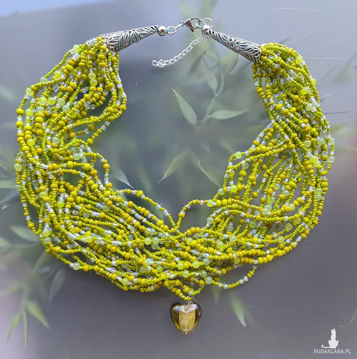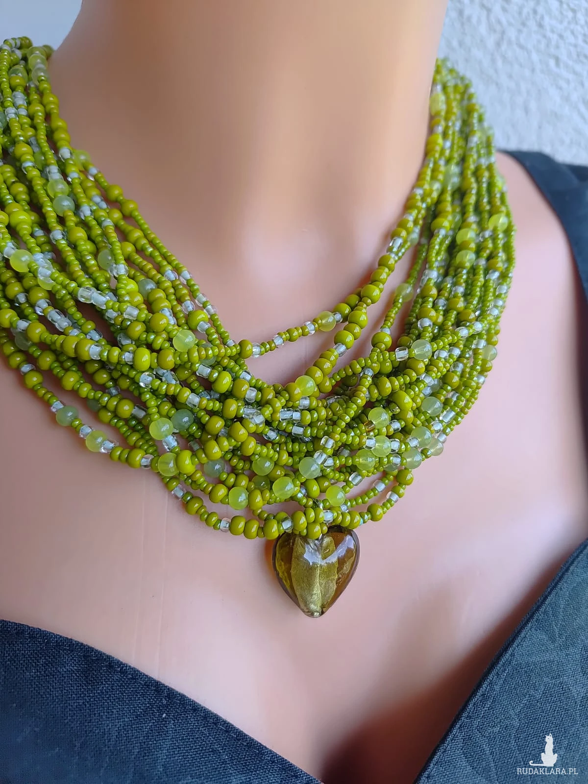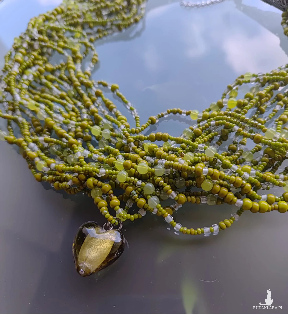 koralików i serduszko szklane w oliwkowym kolorze. Wykończenie pięknymi
