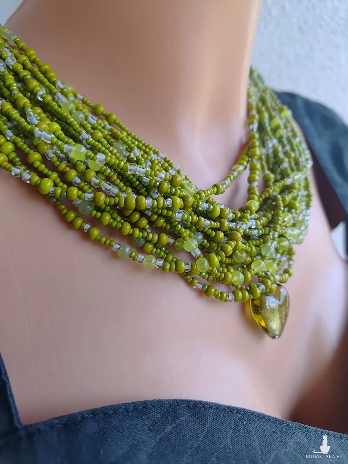 Naszyjnik dwadzieścia jeden sznurków malutkich oliwkowych szklanych