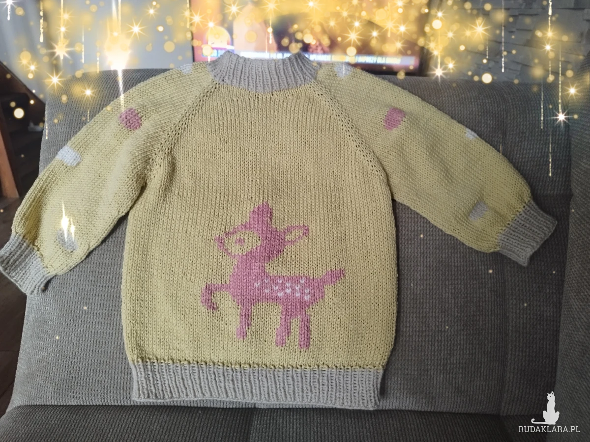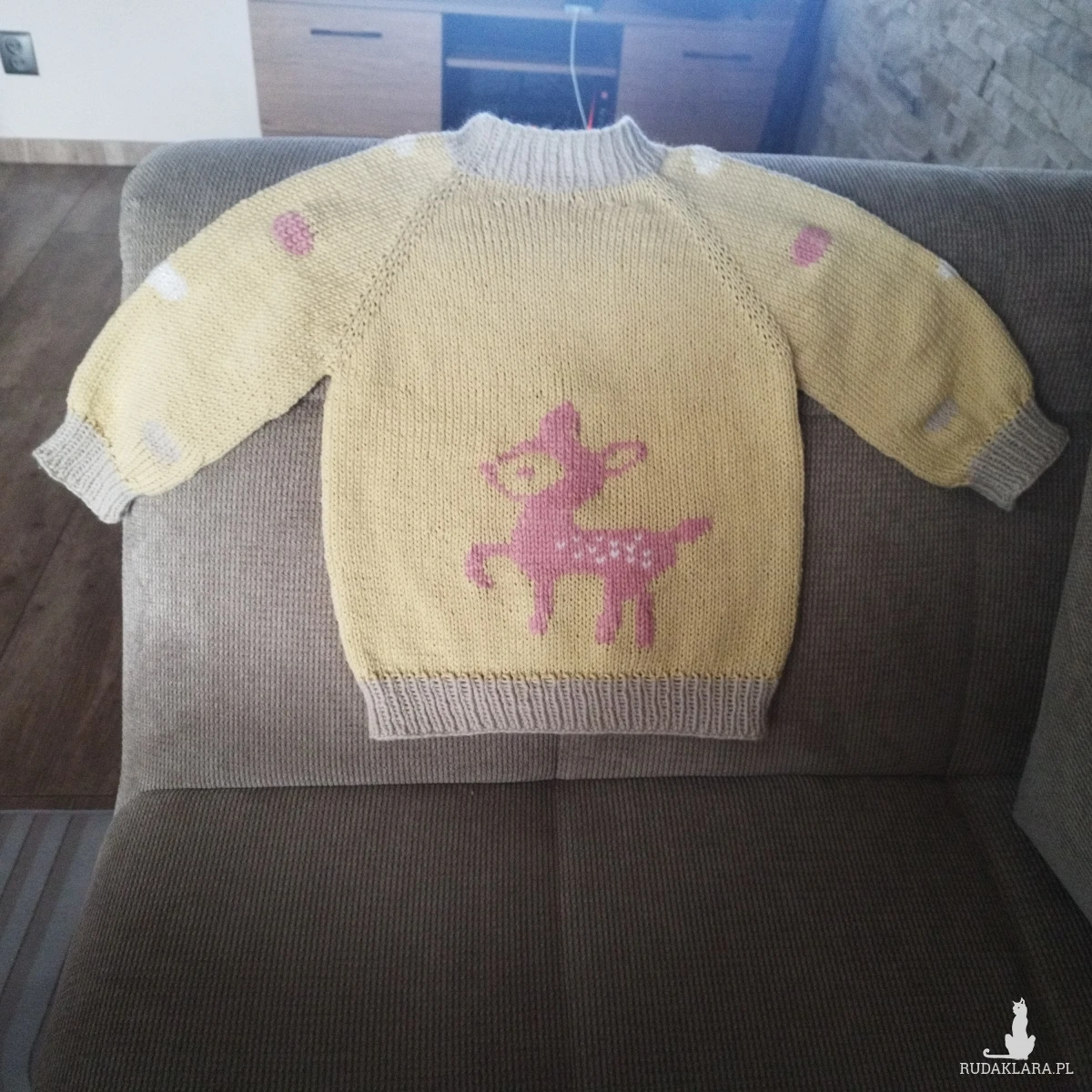 Sweterek dziecięcy zrobiony na drutach. Kolor waniliowy. Wzór żakardowy sarenka. Rękawy w żakardowe kolorowe kropki. Skład: 50% bawełna, 50% wełna merino. Długość 40cm, szerokość pod pachami 30cm, długość rękawa 38cm