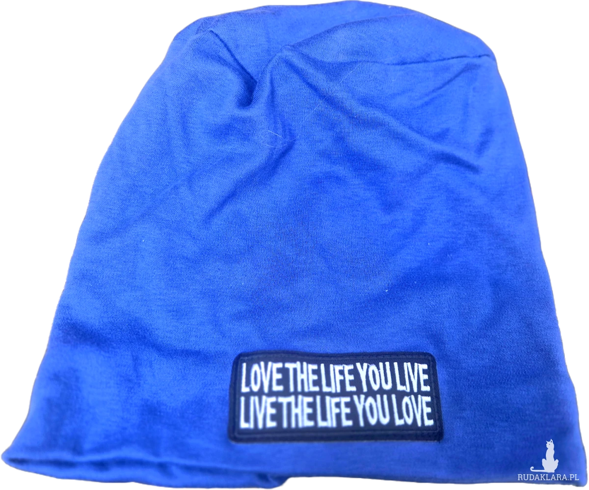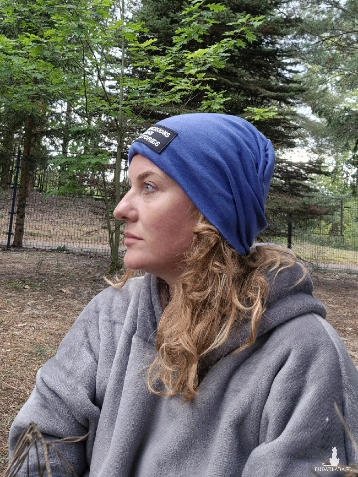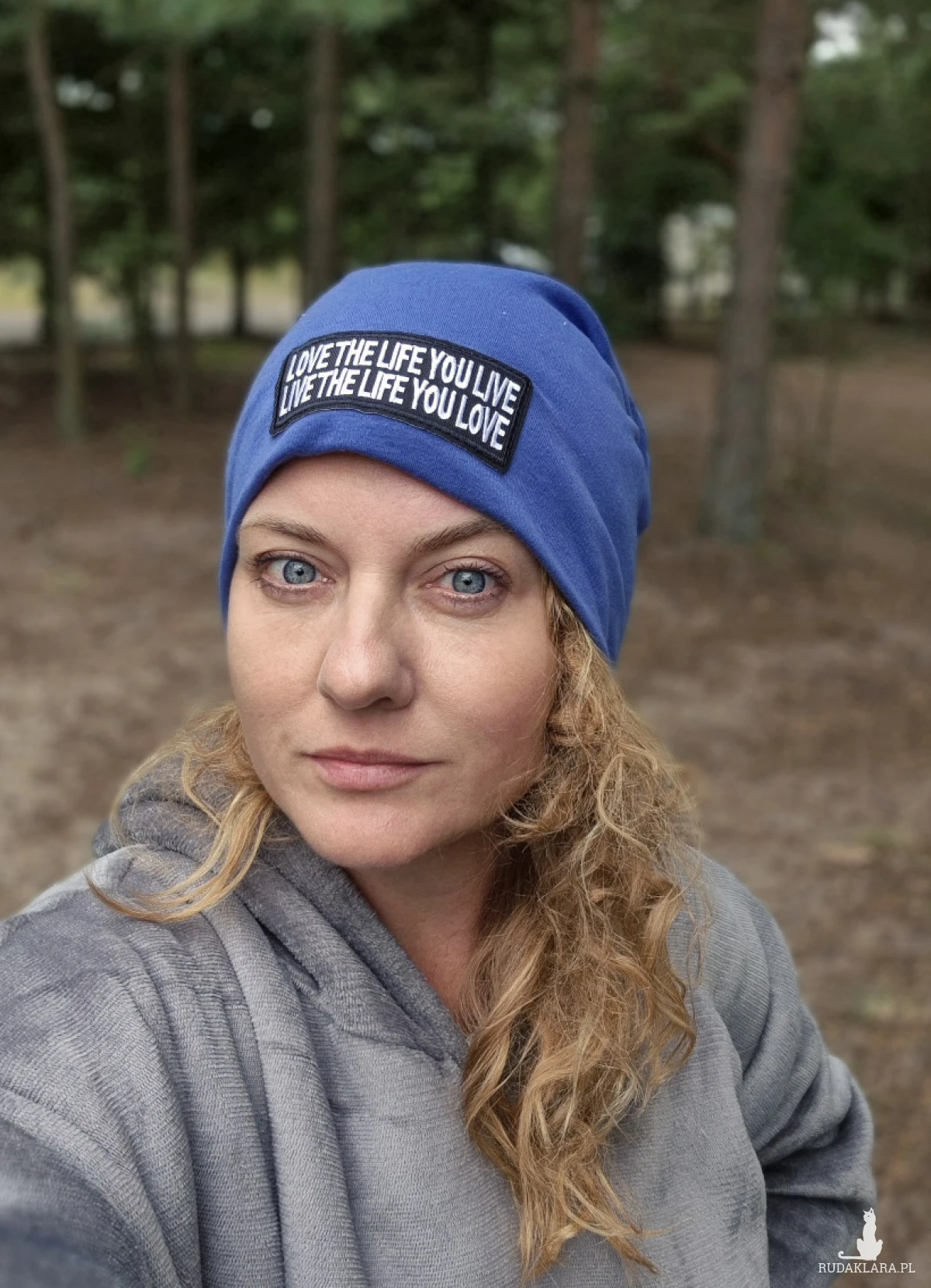 Czapka niebieska  z naszywką z nadrukiem na podszewce rozmiar uniwersalny świetna na codzienne noszenie na rower na brak fryzury na poprawę nastroju ,unisex Box a1