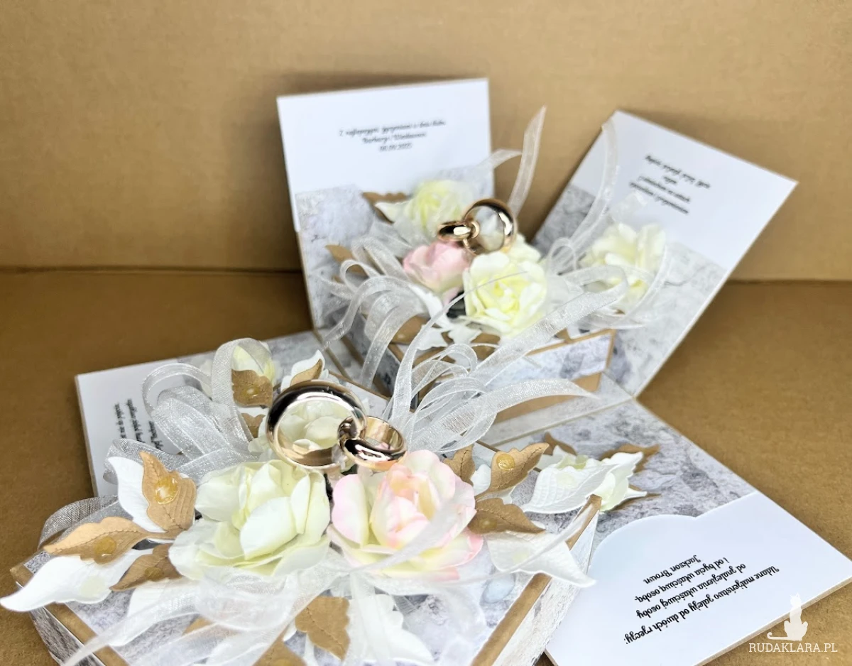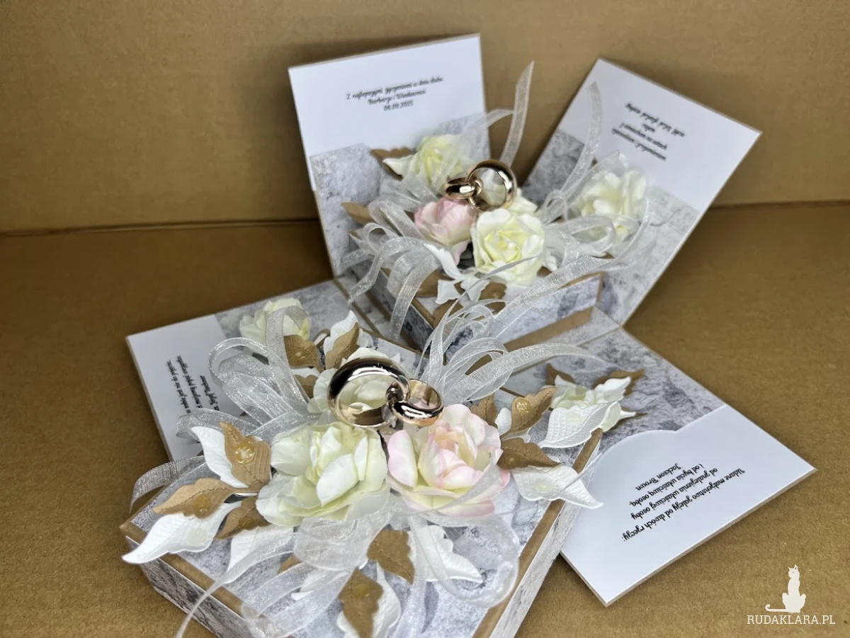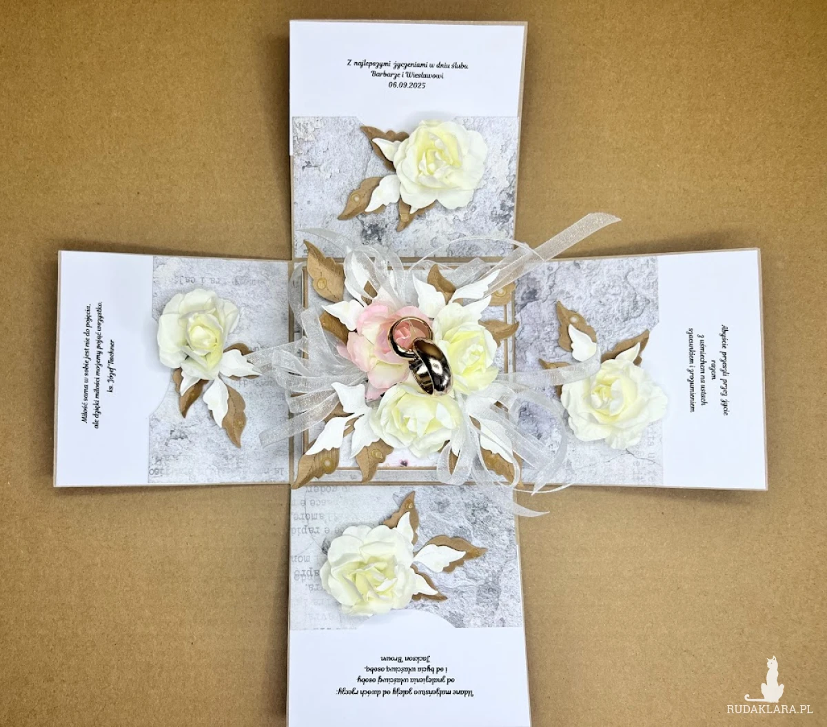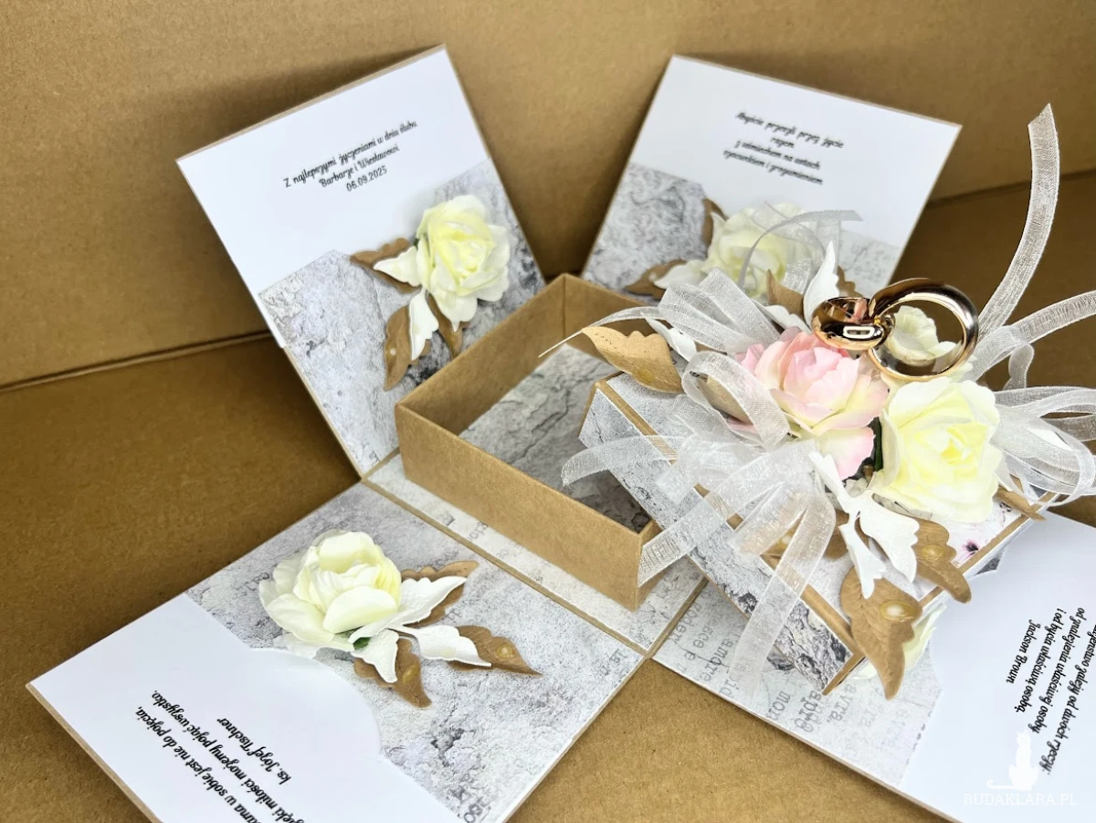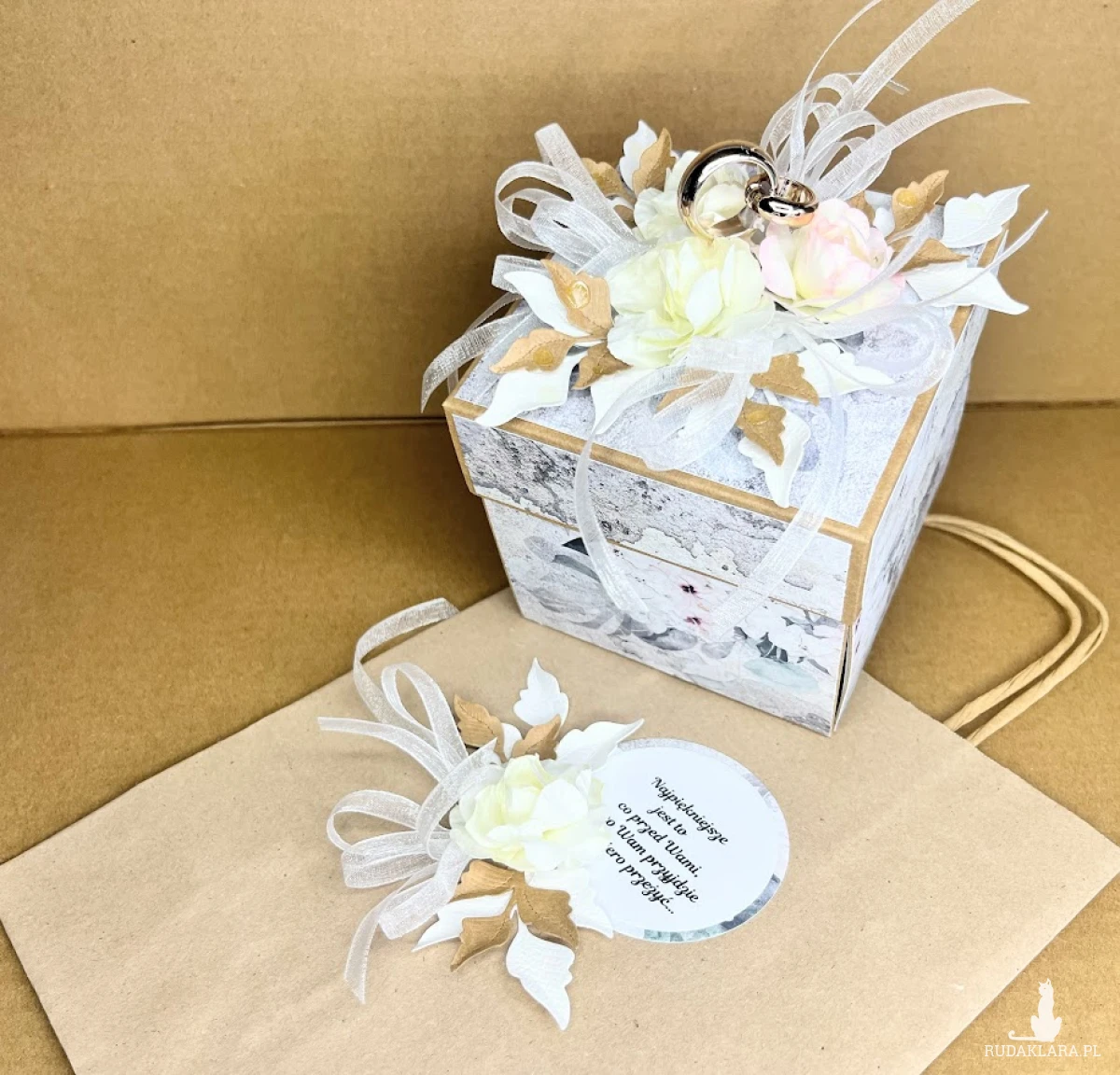 Pudełko eksplodujące tzw. exploding box to atrakcyjny i popularny zamiennik z kartką. Złożone 4 ścianki zamknięte wieczkiem , które po jego zdjęciu rozpadają się na 4 strony świata. Wielkość poszczególnych części to 10 x 10 cm i tak samo złożone pudełko w całość ma te same wymiary. Na czterech ściankach umieściłam kieszonkę na małe co nieco lub kupon lotto pod wieczkiem pudełka umieszczono gotowe życzenia do podpisania lub dodatkowa czysta karta do wpisania ręcznie życzeń przez kupującego. Do kompletu stworzono torebkę ozdobioną w tym samym stylu co box.W centralnej części pudełka umieszczono małe pudełeczko bukietem kwiatów i obrączkami, ten sam styl zachowano na dużym pudełku.W tej wersji pudełko jest dostępne od ręki.