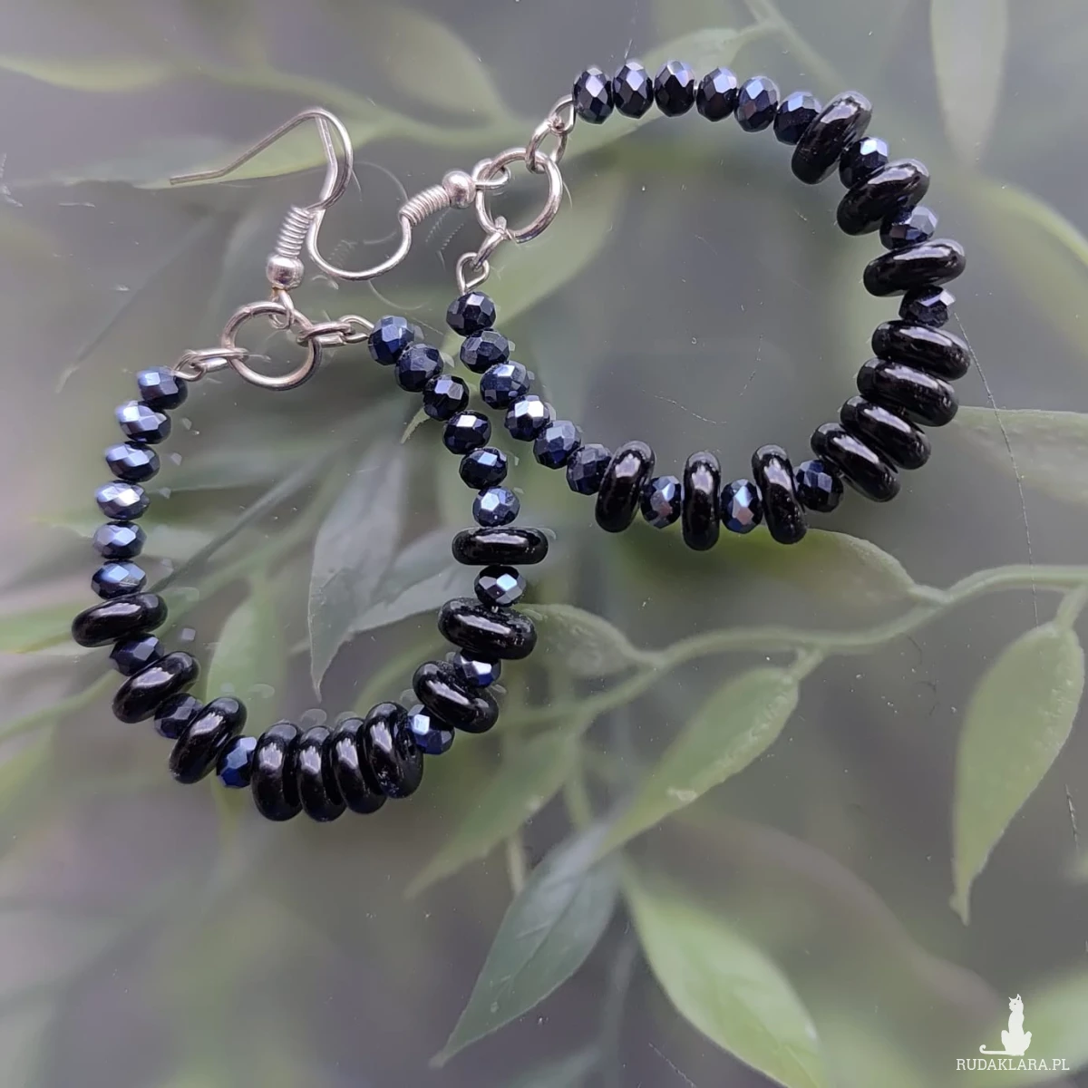 Kolczyki koła małe z koralików szklanych, oponki szklane, kryształki. Średnica koła 3 cm, bigiel metalowy