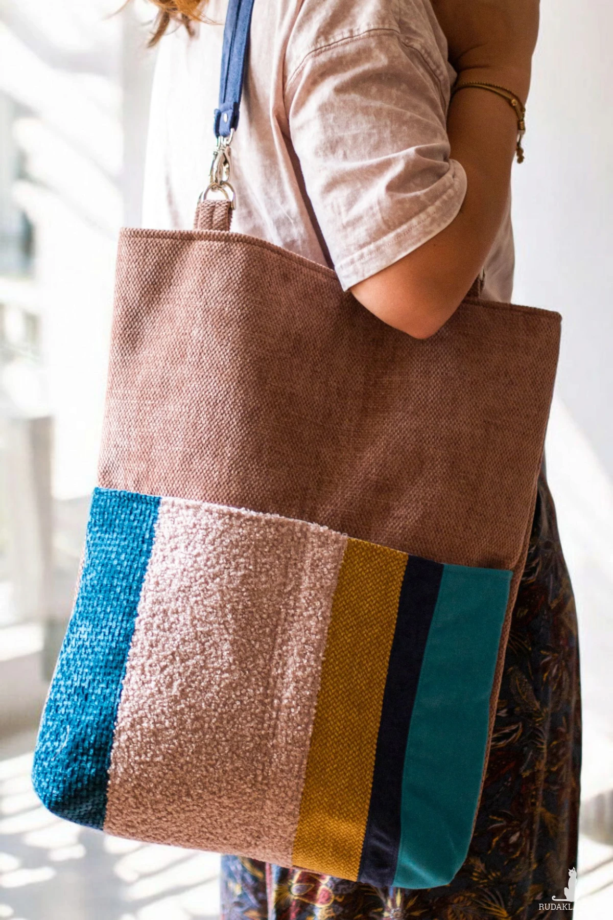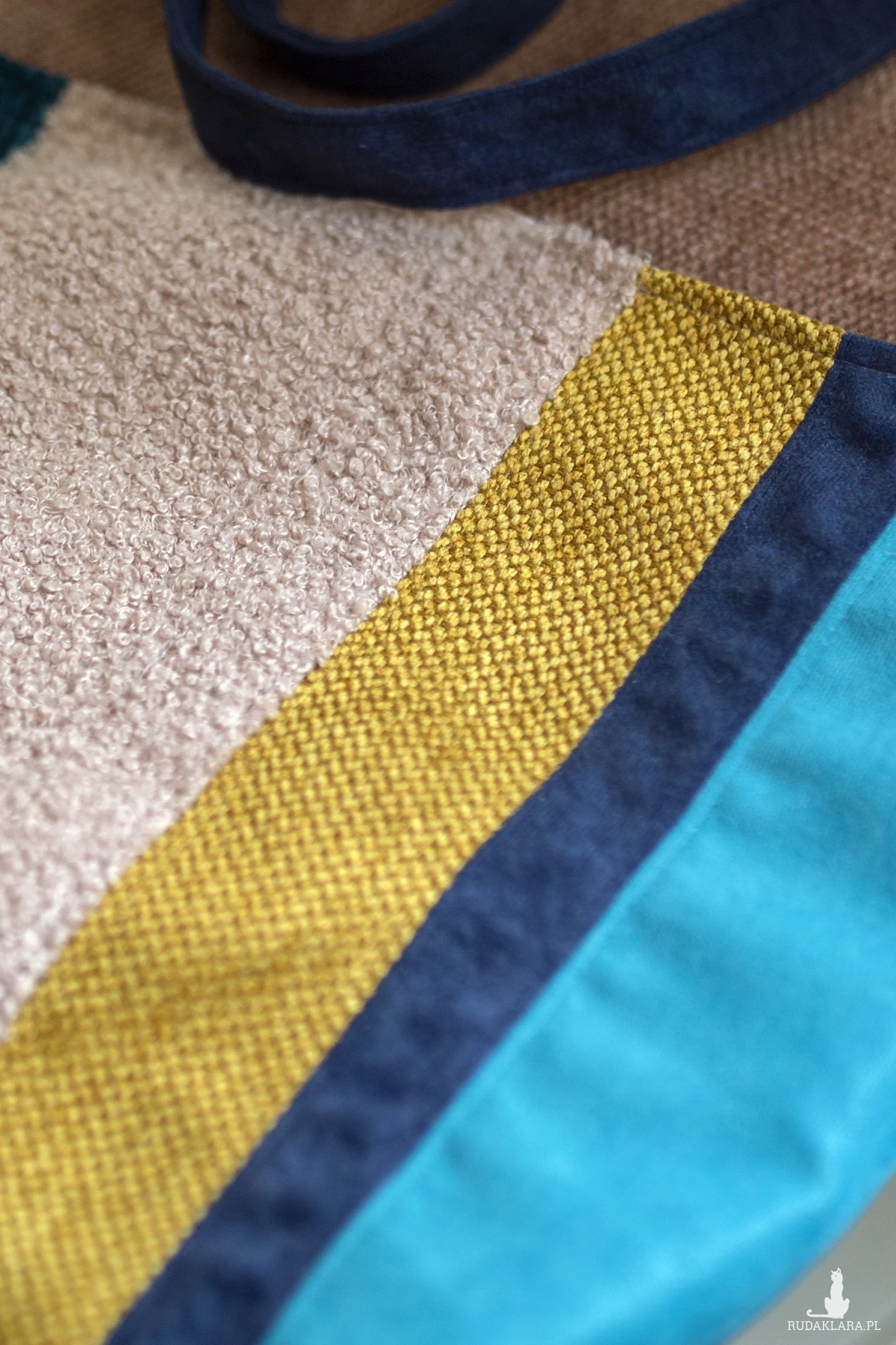 Z przodu dwie kieszenie w stylu patchwork. Całość zapinana na zapięcie magnetyczne.