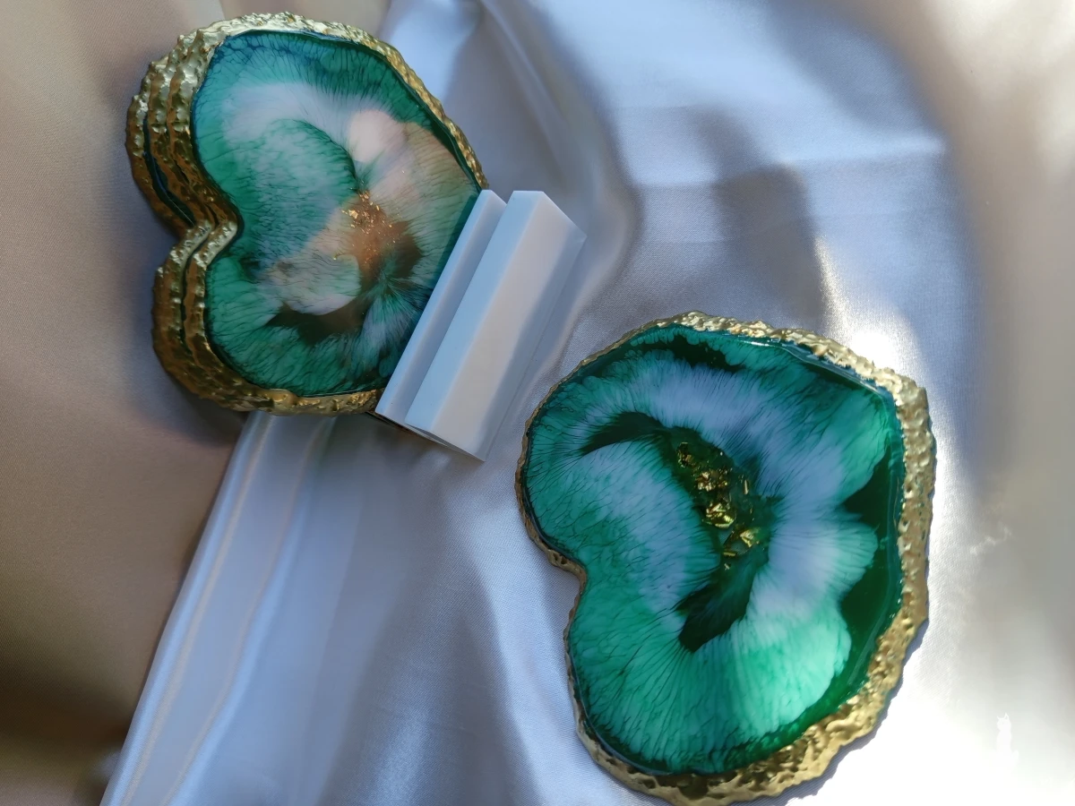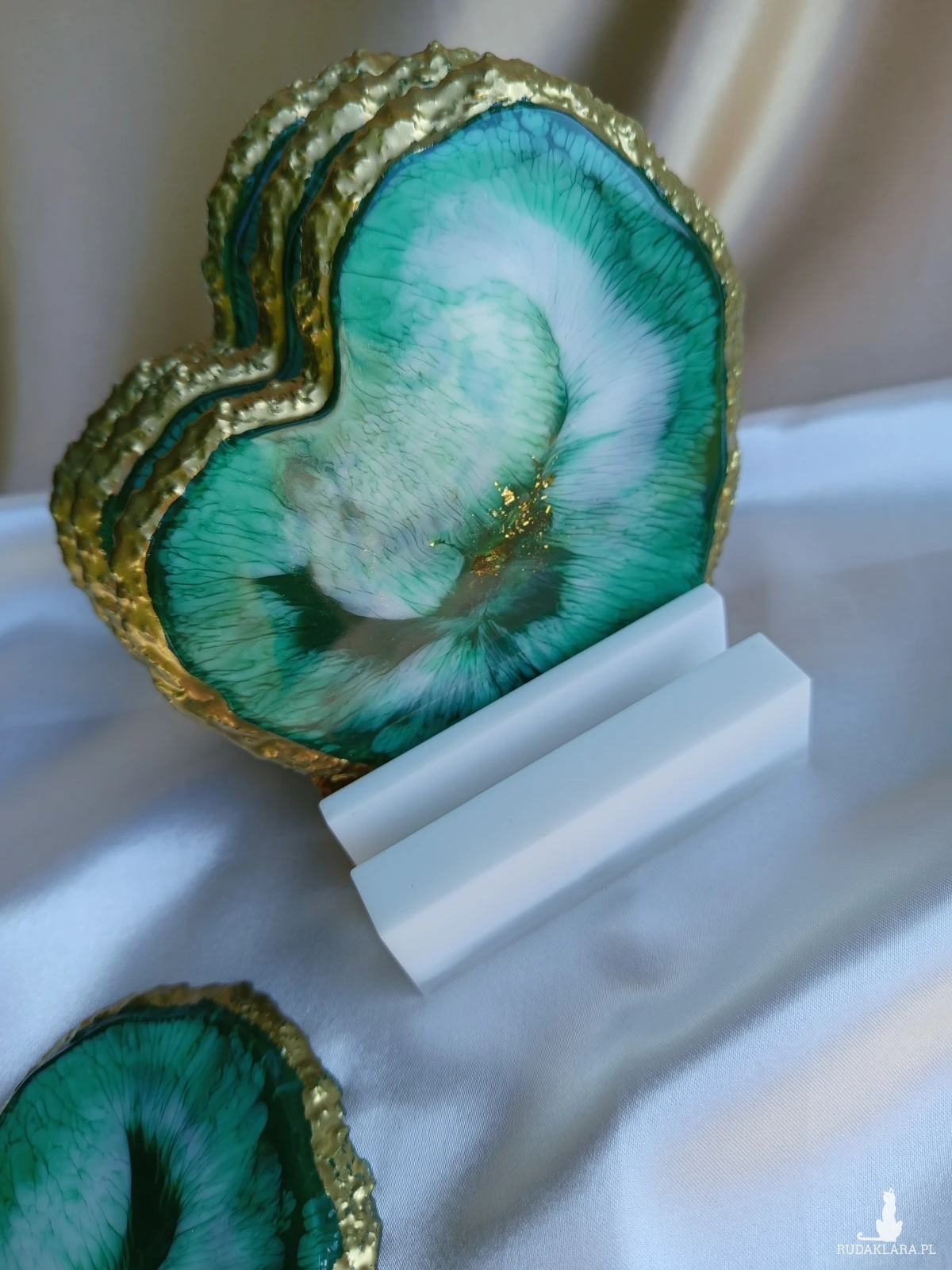 Zestaw z żywicy – Podstawki pod kubki w kształcie serca z zielenią, bielą i złotymi akcentami 💚