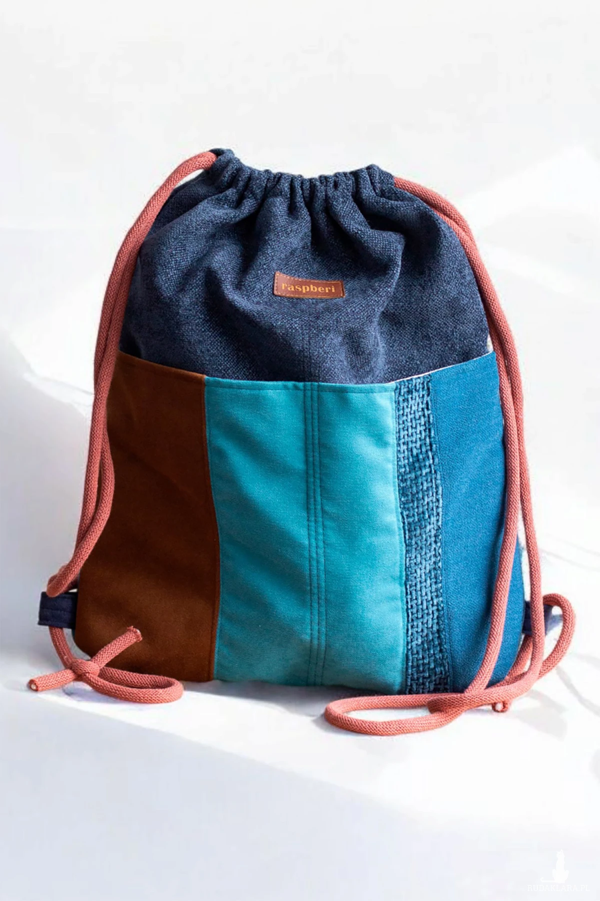 Dół tworzy dodatkowe miejsce na przechowywanie rzeczy - z przodu dwie kieszenie (np. na butelkę), z tyłu jedną duża kieszeń (idealna na tablet). Wykonane z różnych kawałków tkanin tworzących wspólnie ciekawą wizualnie całość.
