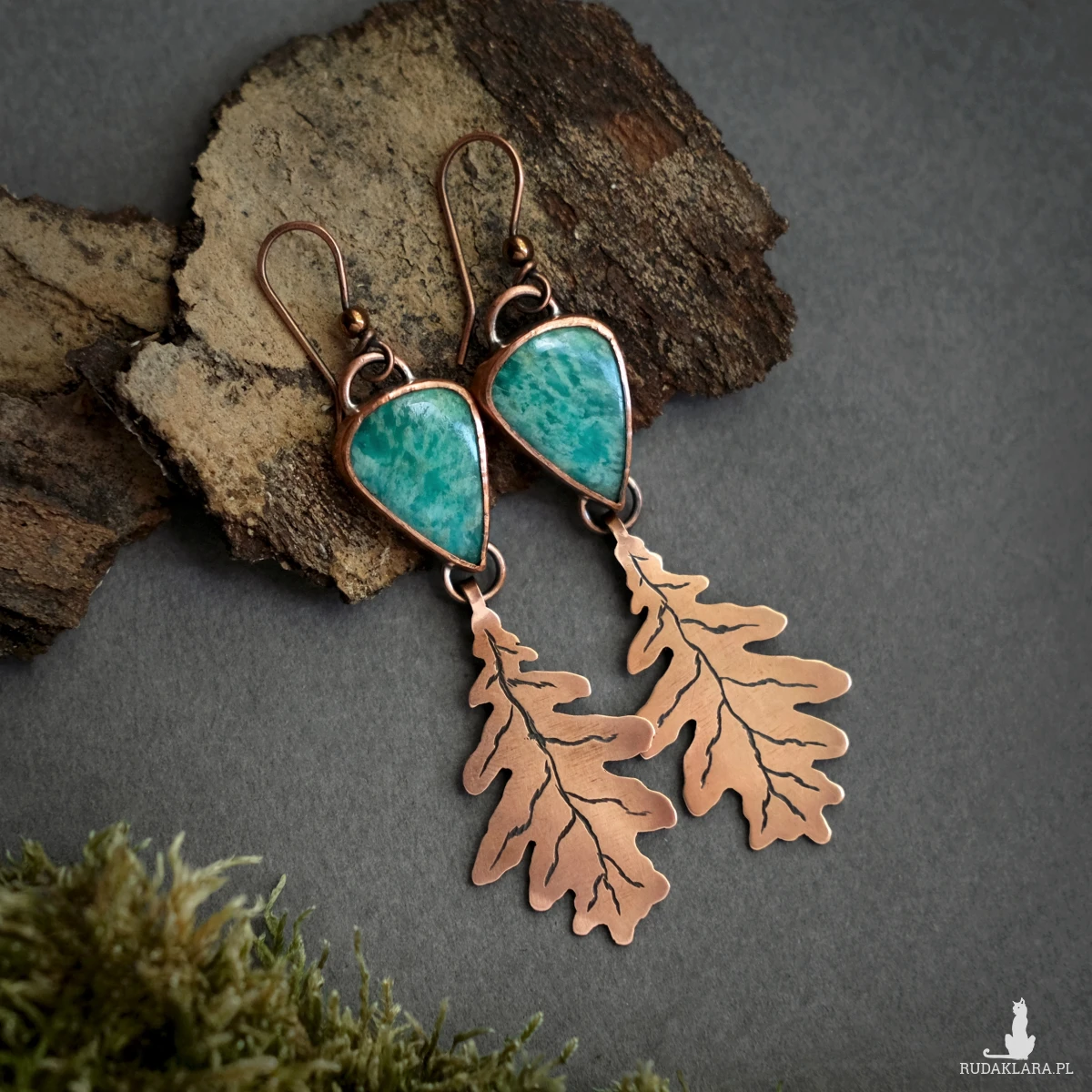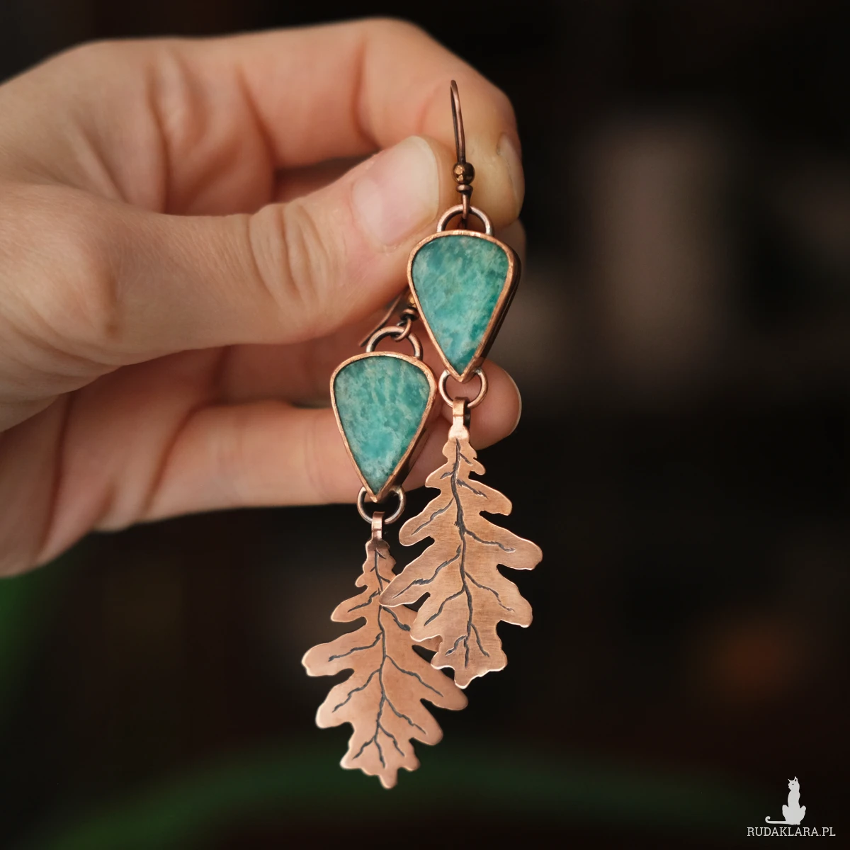 Miedziane unikatowe kolczyki z amazonitem. Długie i wyraziste, z ręcznie przygotowanymi i wyciętymi z blachy liśćmi dębu, sprawdzą się na co dzień jak i na większe okazje. Idealna propozycja dla fanki przyrody oraz biżuterii, która przyciąga uwagę :)