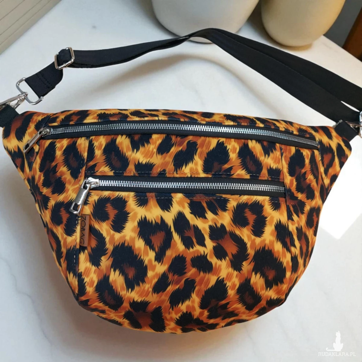 Saszetka-nerka uszyta z weluru, wzór panterka odcienie brązu i czarnego.