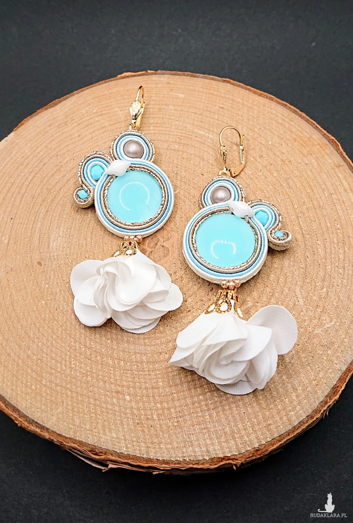 Duże błękitne kaboszony z kamienia kocie oko otoczone sznurkami sutasz oraz szklanymi koralikami o różnych kształtach i wielkościach. Błyszczący metalizowany sznurek nadaje kolczykom blasku i elegancji. Dół kolczyków zdobią materiałowe kwiaty w ozdobnych ażurowych czapeczkach. Kolczyki zawieszone na biglach angielskich w kolorze różowego złota.