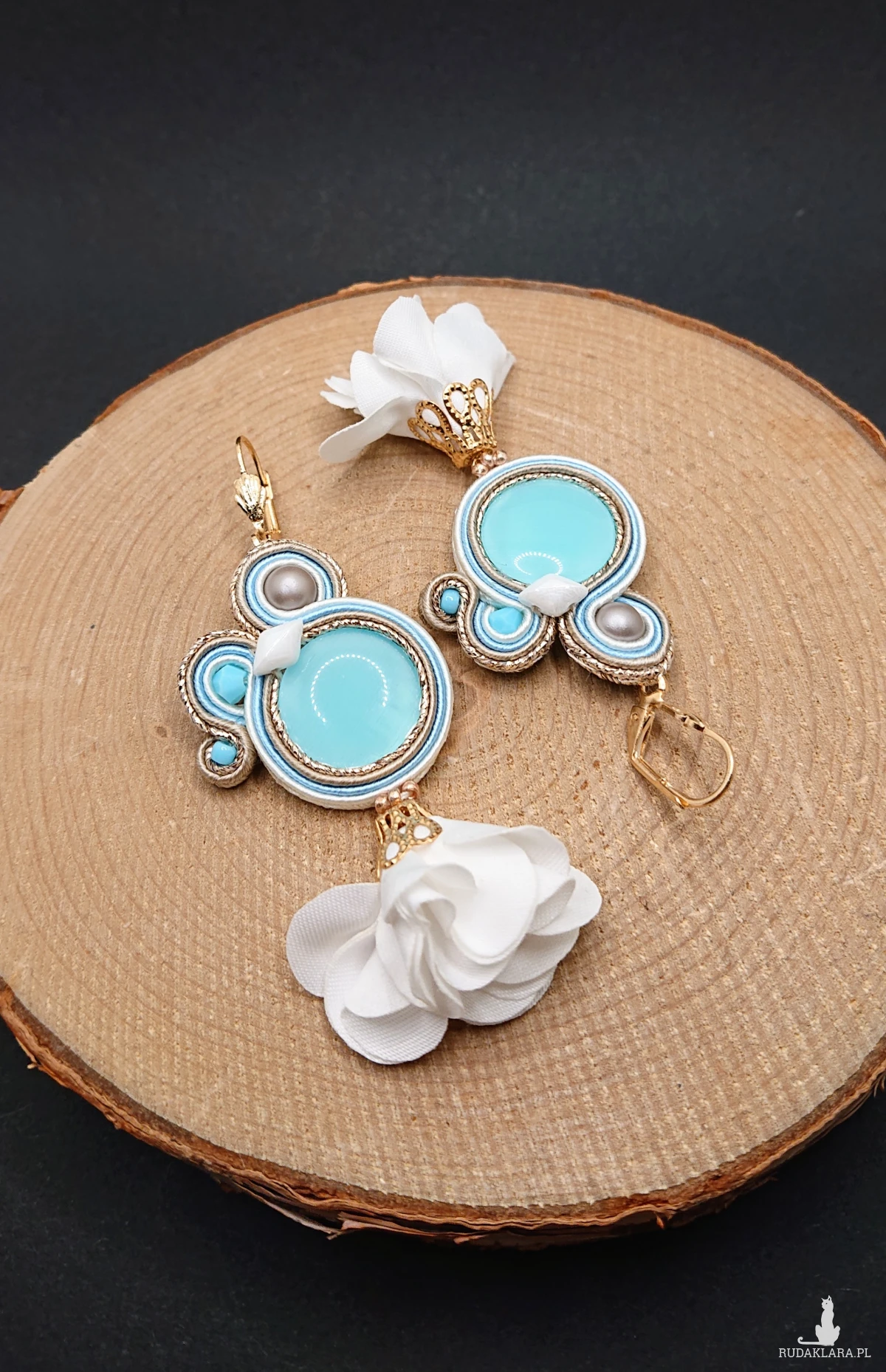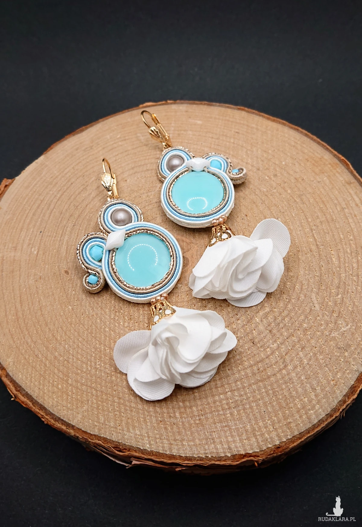 Eleganckie kolczyki sutasz w stonowanej kolorystyce. Lekkie i wygodne w noszeniu. Mieniący się kaboszon oraz wiszące kwiatki nadają kolczykom unikatowy wygląd.