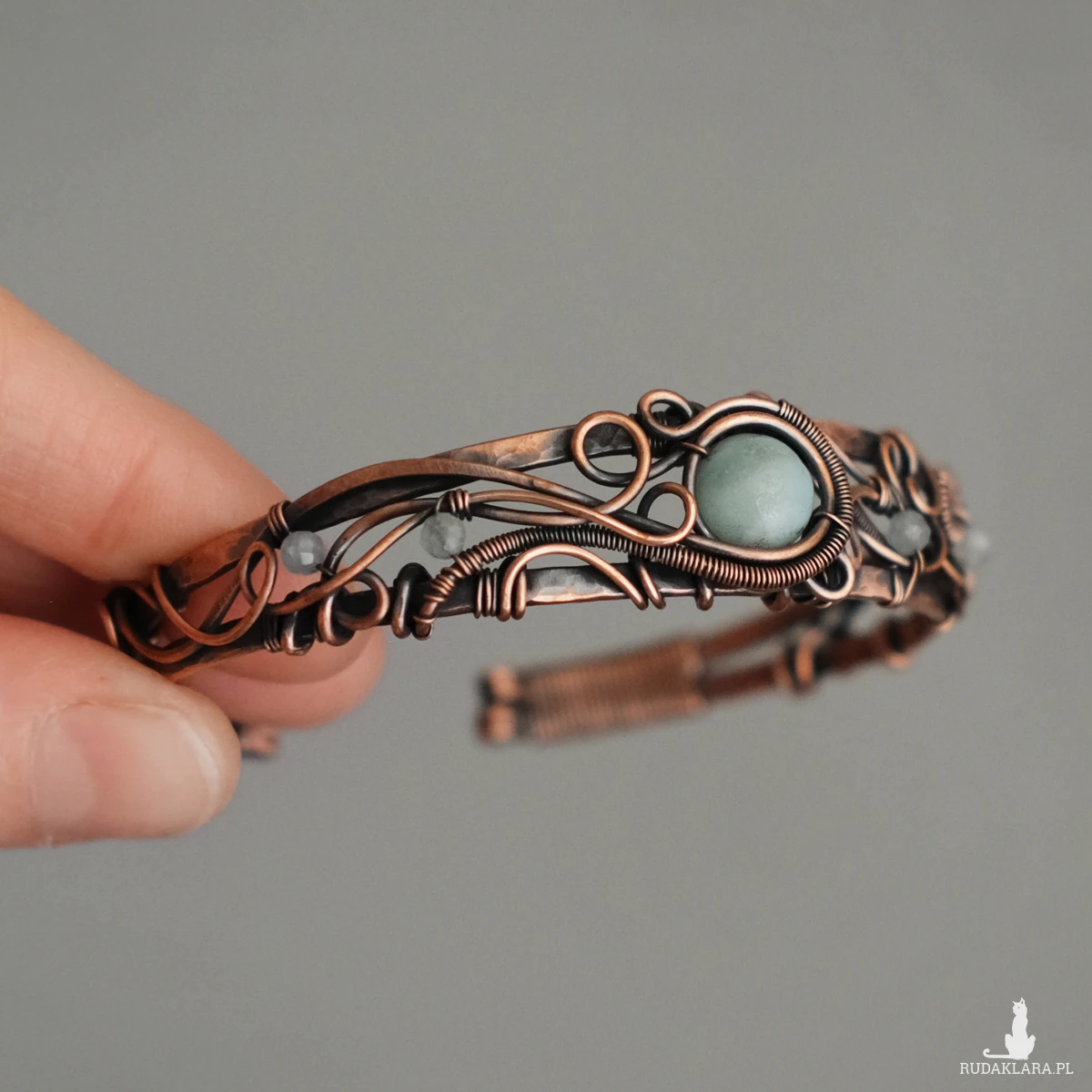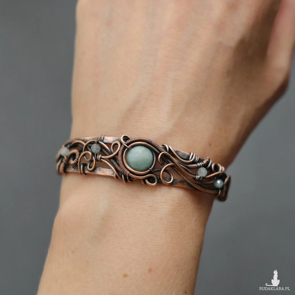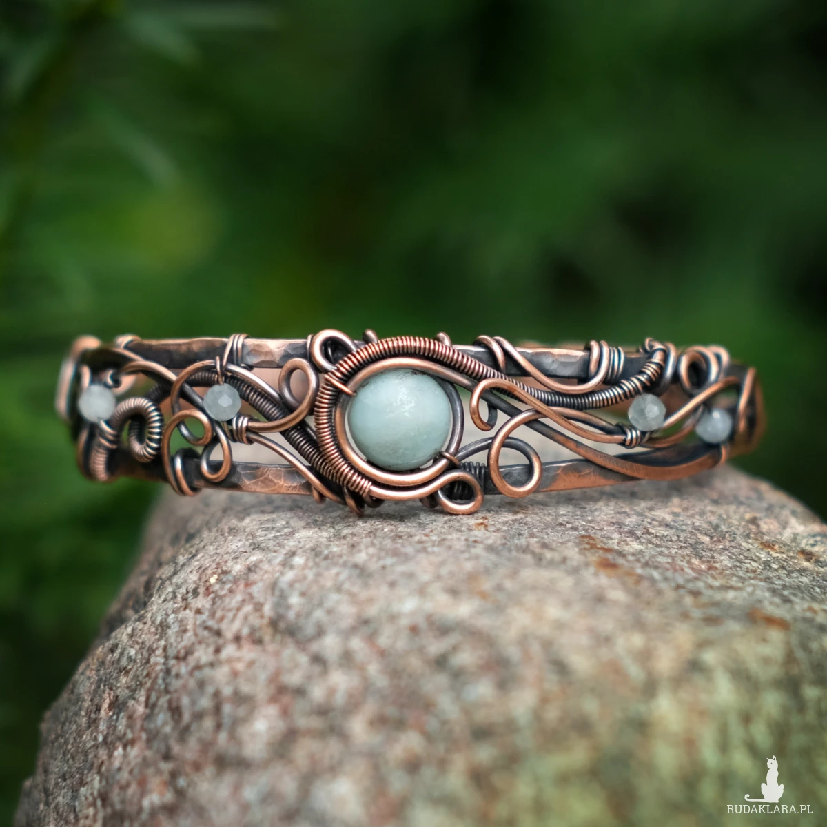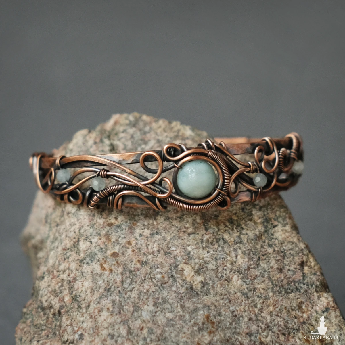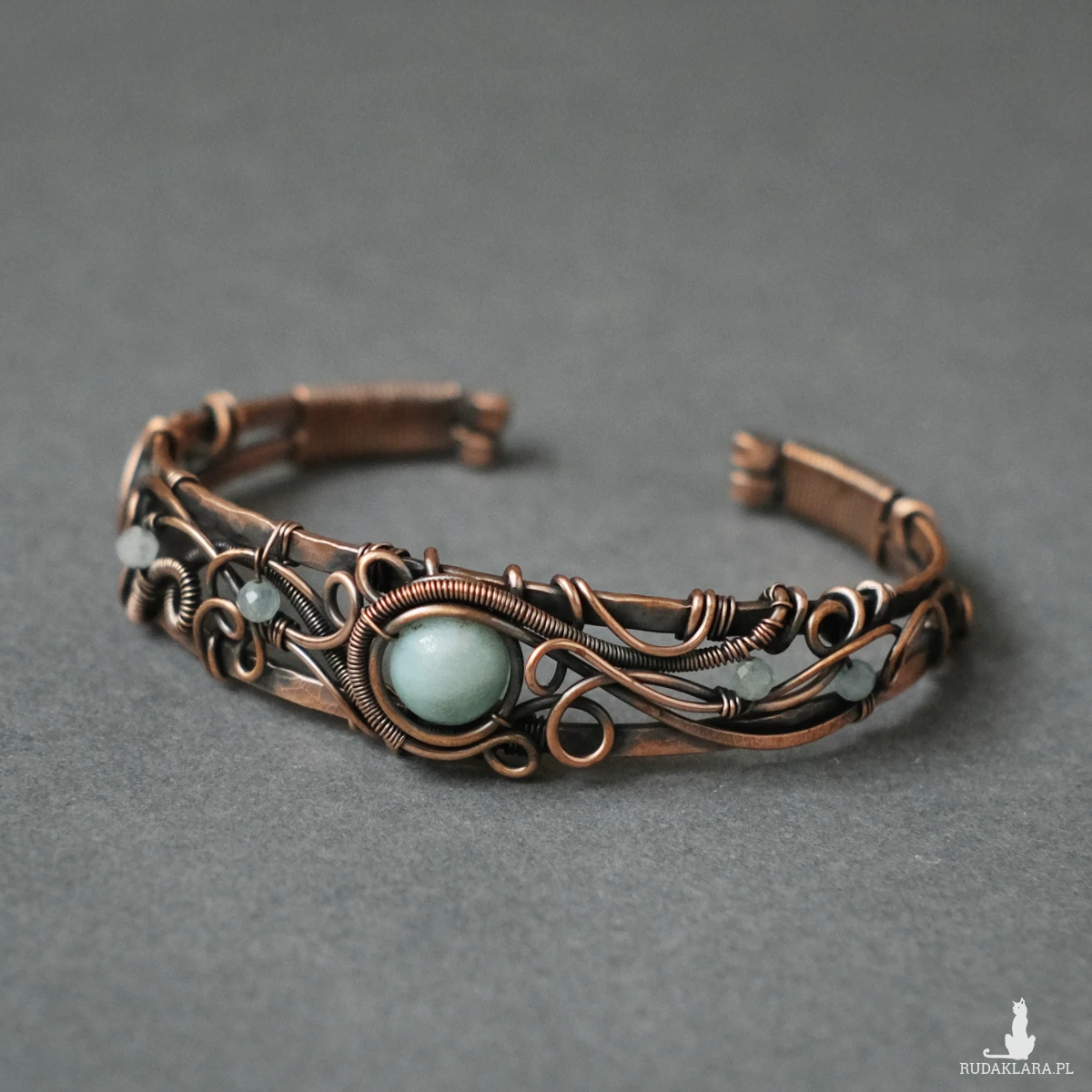 Miedziana bransoletka w elfickim stylu mieści w sobie kamień amazonitu w centrum oraz małe fasetowane akwamaryny po bokach. Oplatają ją sploty miedzianego drutu nadające baśniowego klimatu.