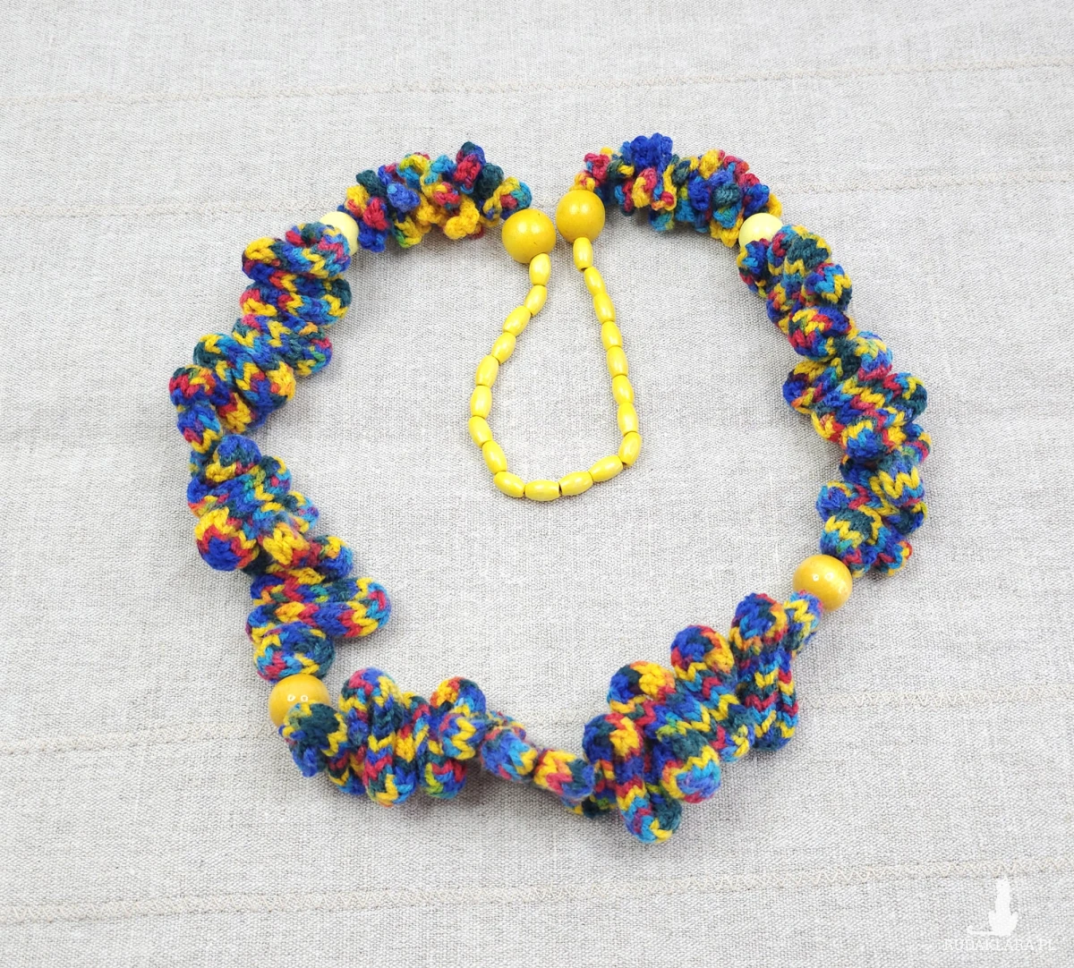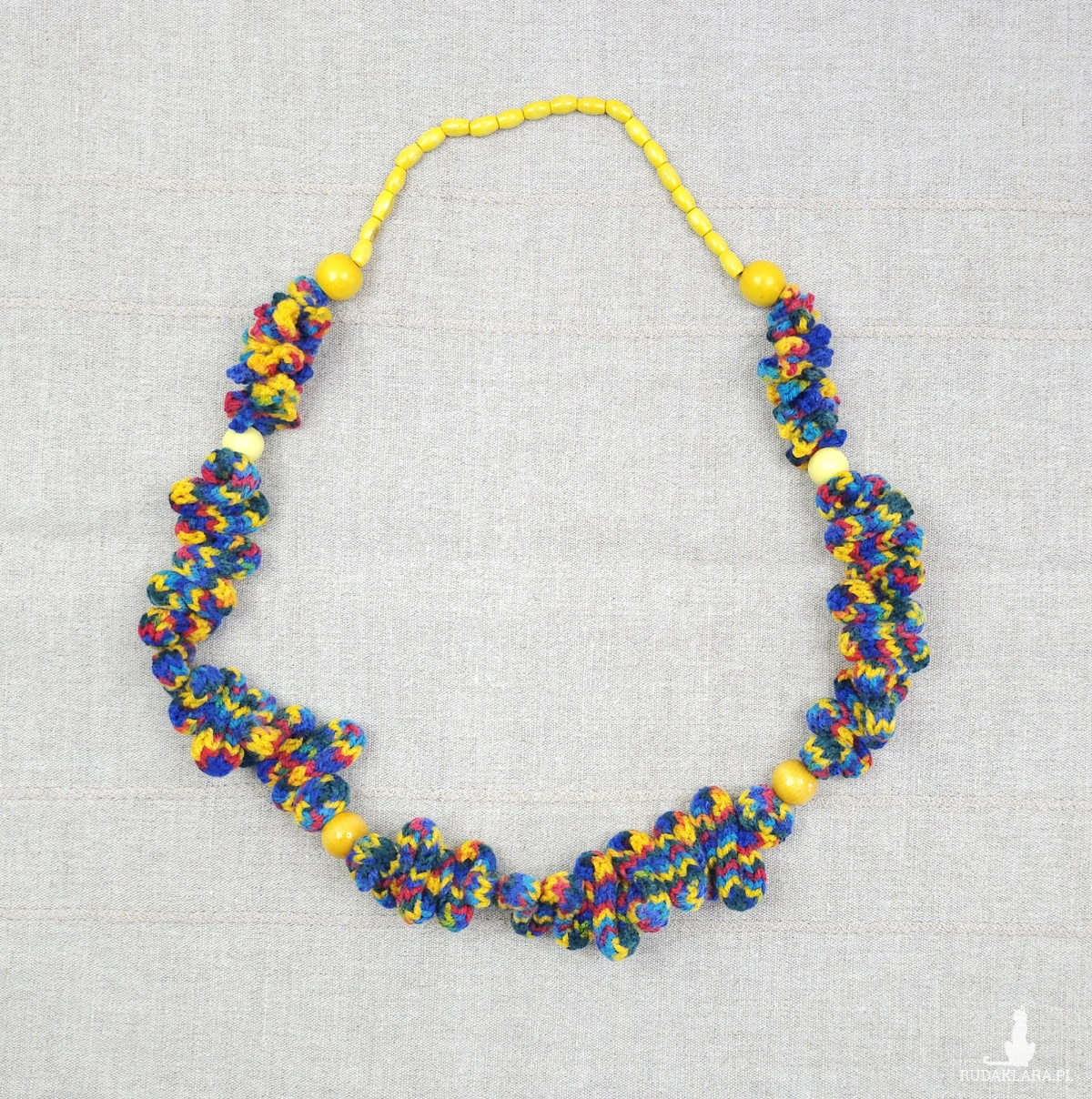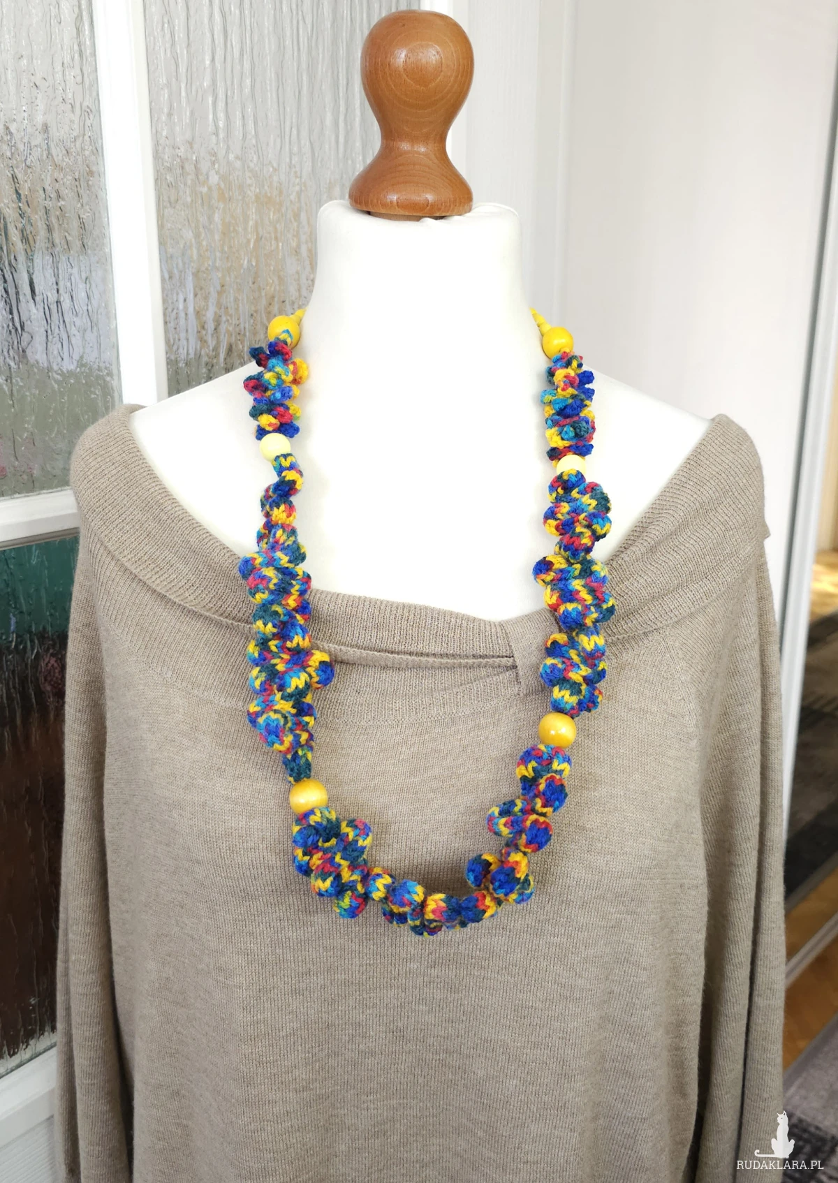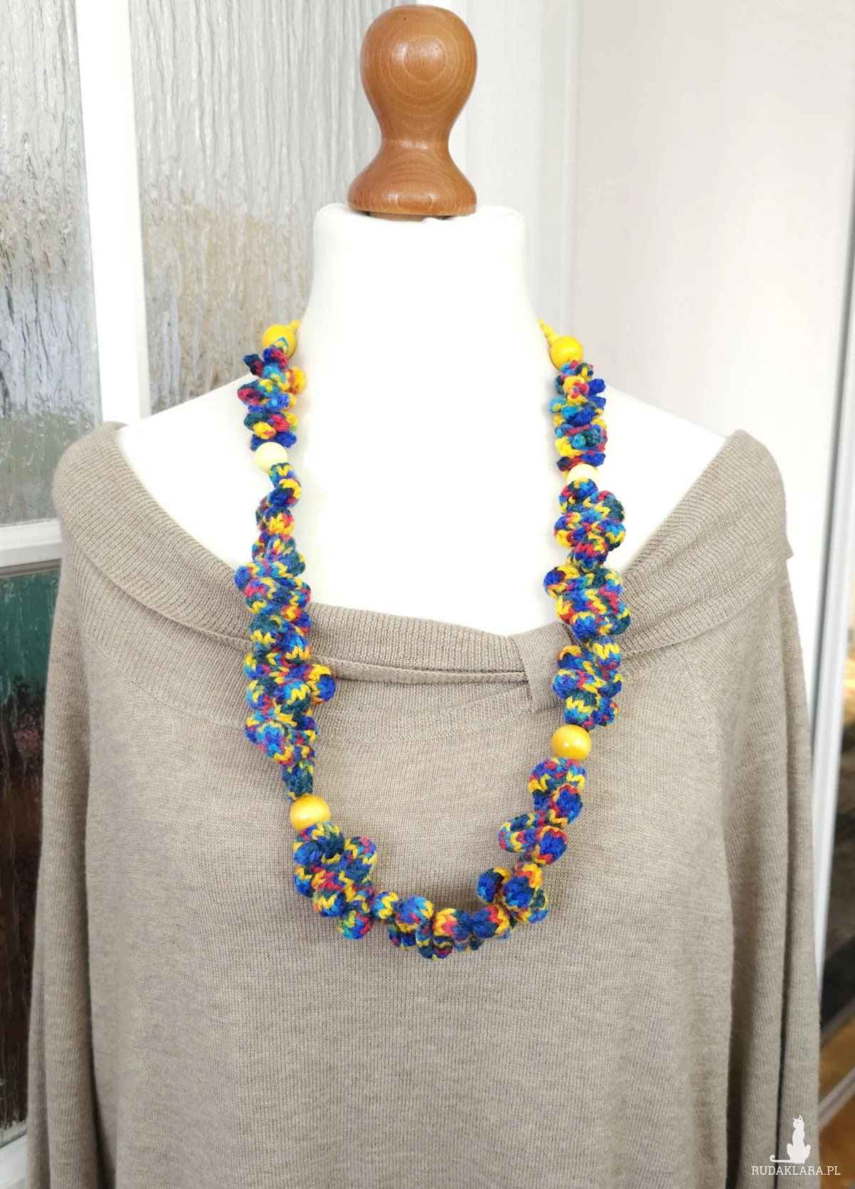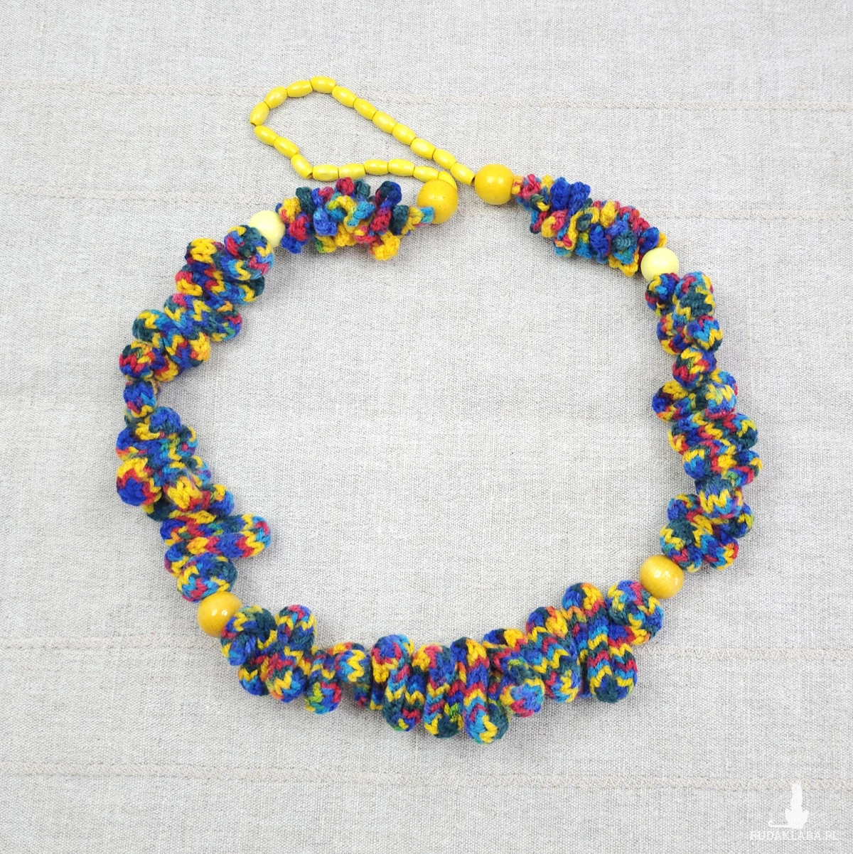 Wykonany ręcznie z włóczki akrylowej, łączy w sobie feerię barw, które przeplatają się niczym małe, artystyczne sploty.