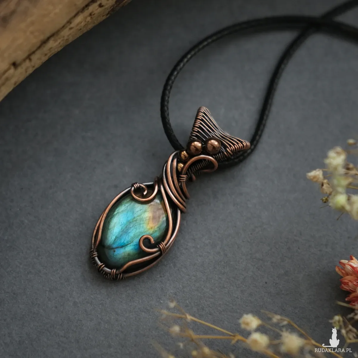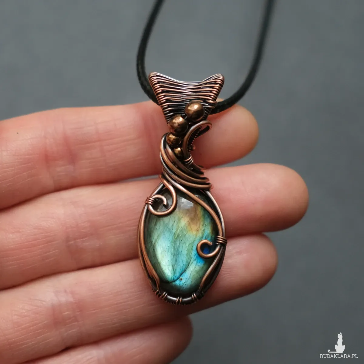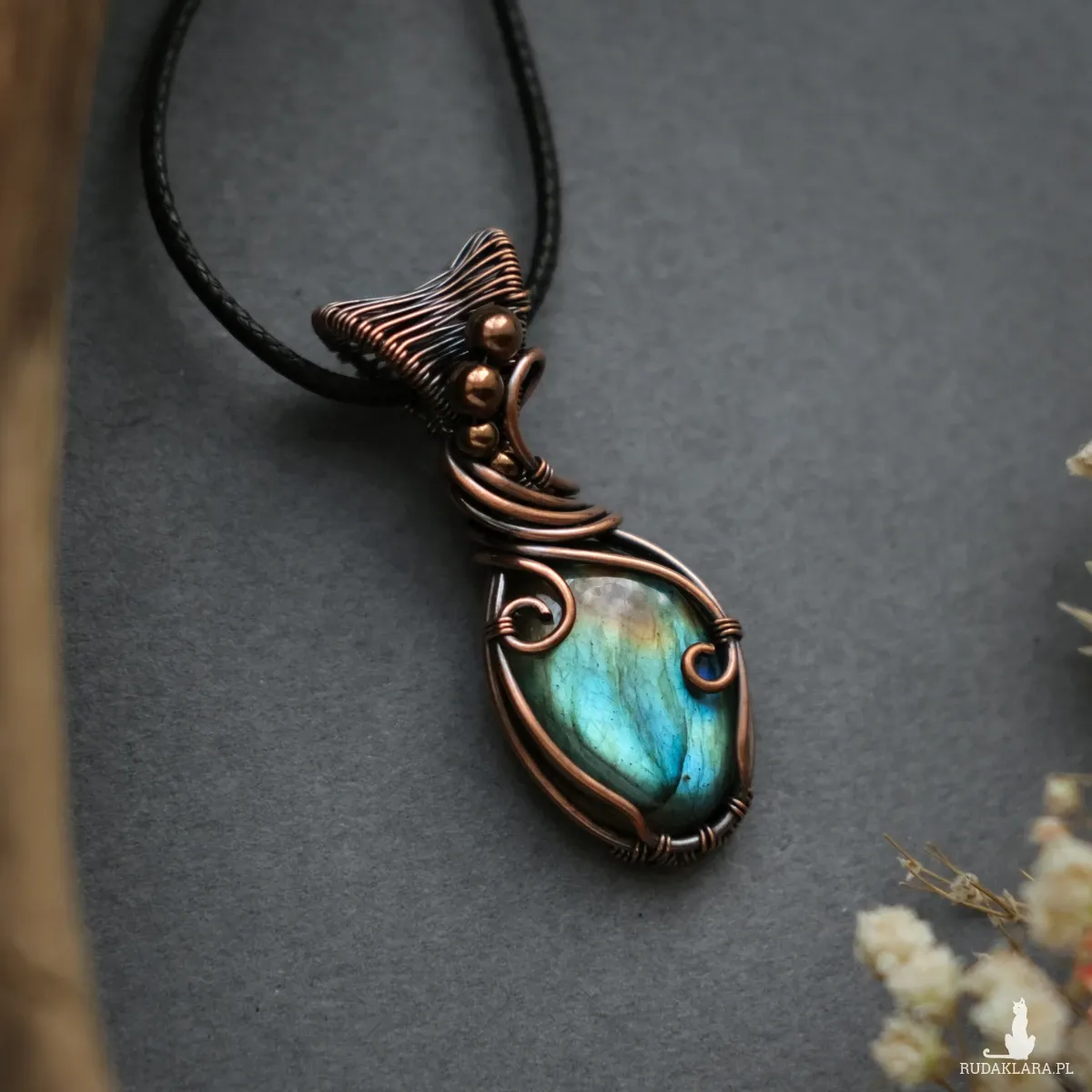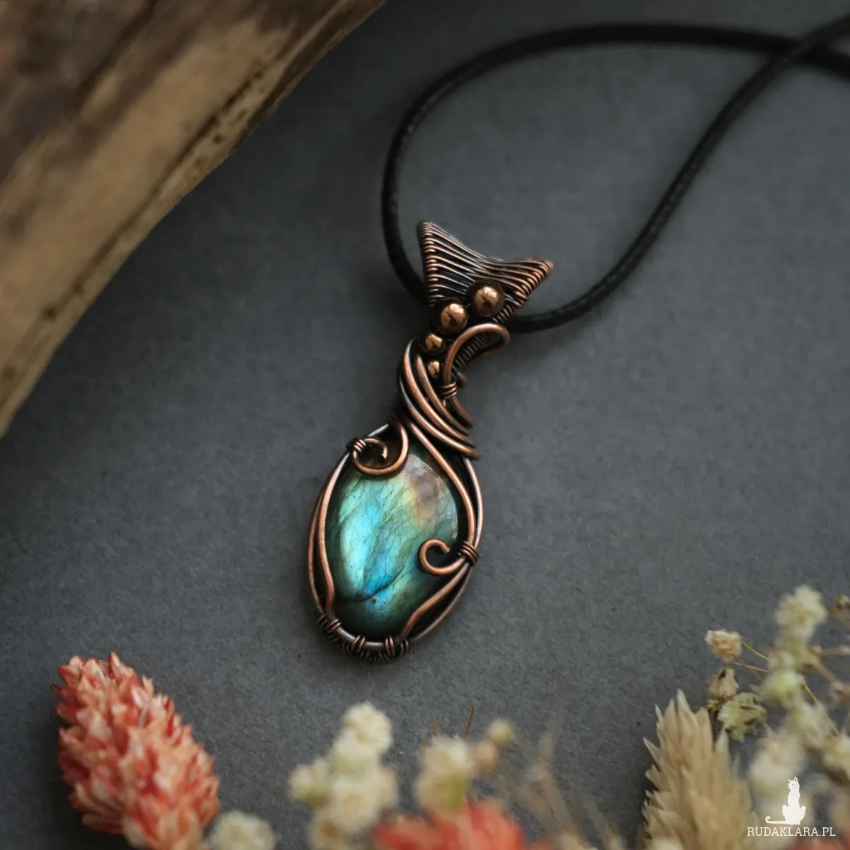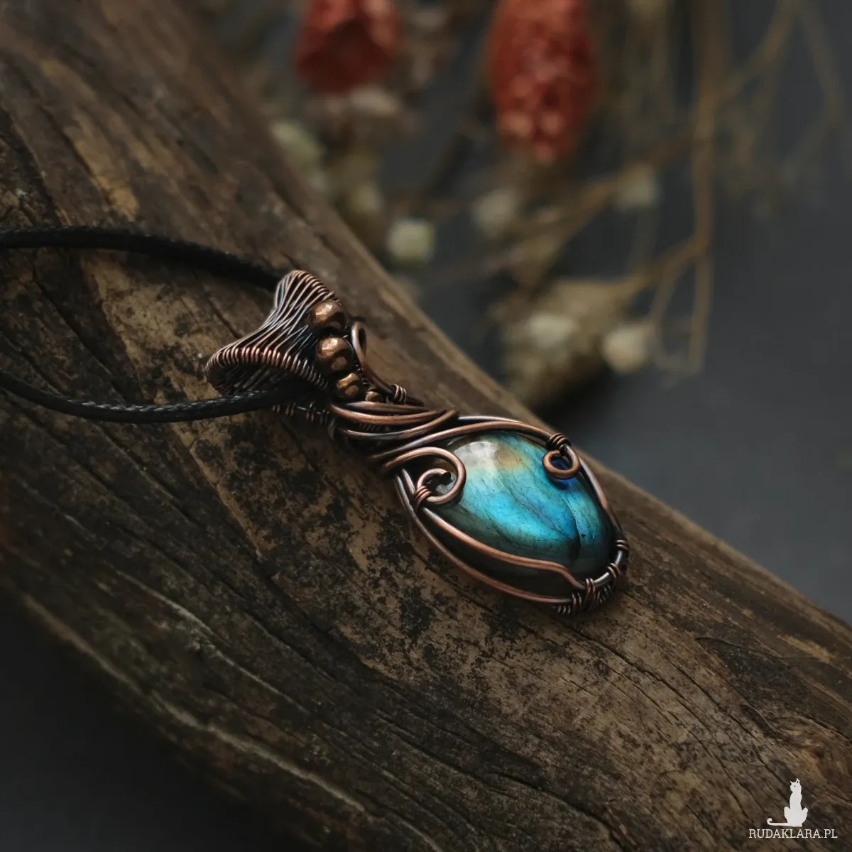 Drobny miedziany wisiorek mieści w sobie kamień labradorytu o pięknej błękitno-zielono-pomarańczowej iryzacji. Posiada szeroki uchwyt ozdobiony koralikami hematytu oraz fantazyjne sploty miedzianego drutu. Świetnie dopełni stylizację kobiety stawiającej na drobną, ale pełną uroku biżuterię.