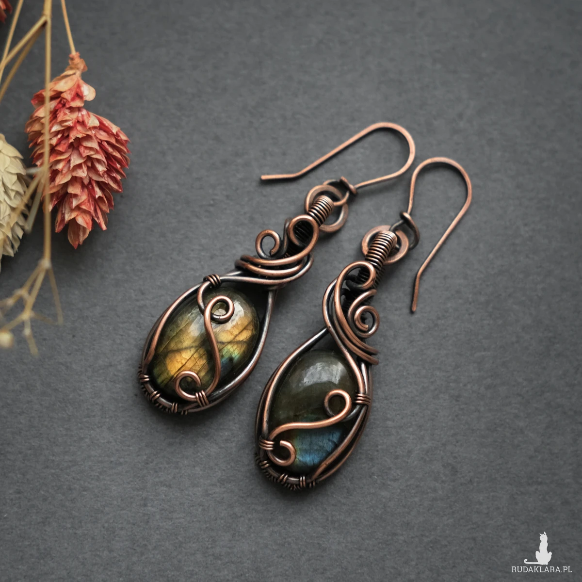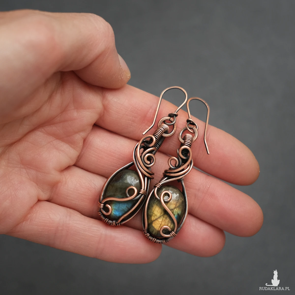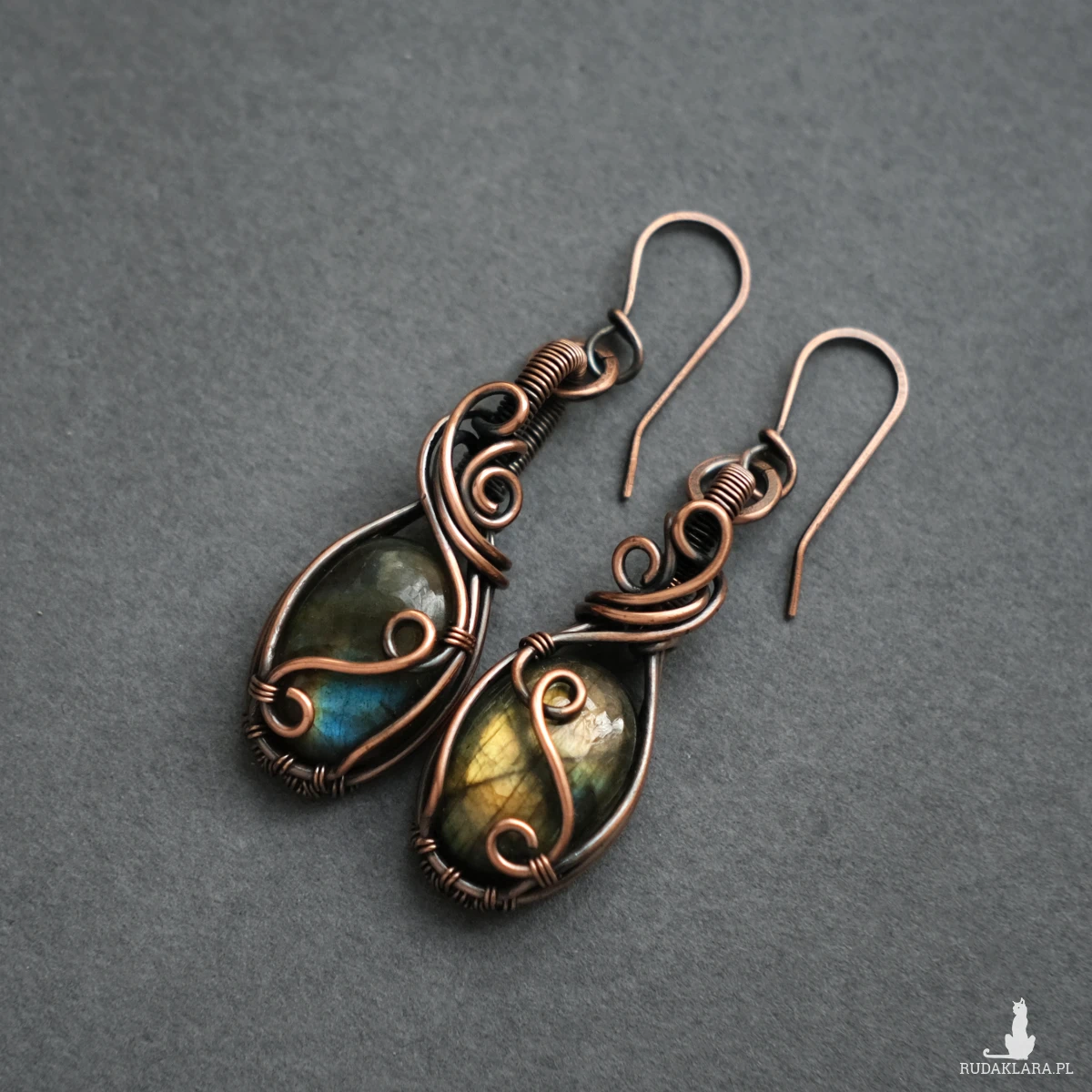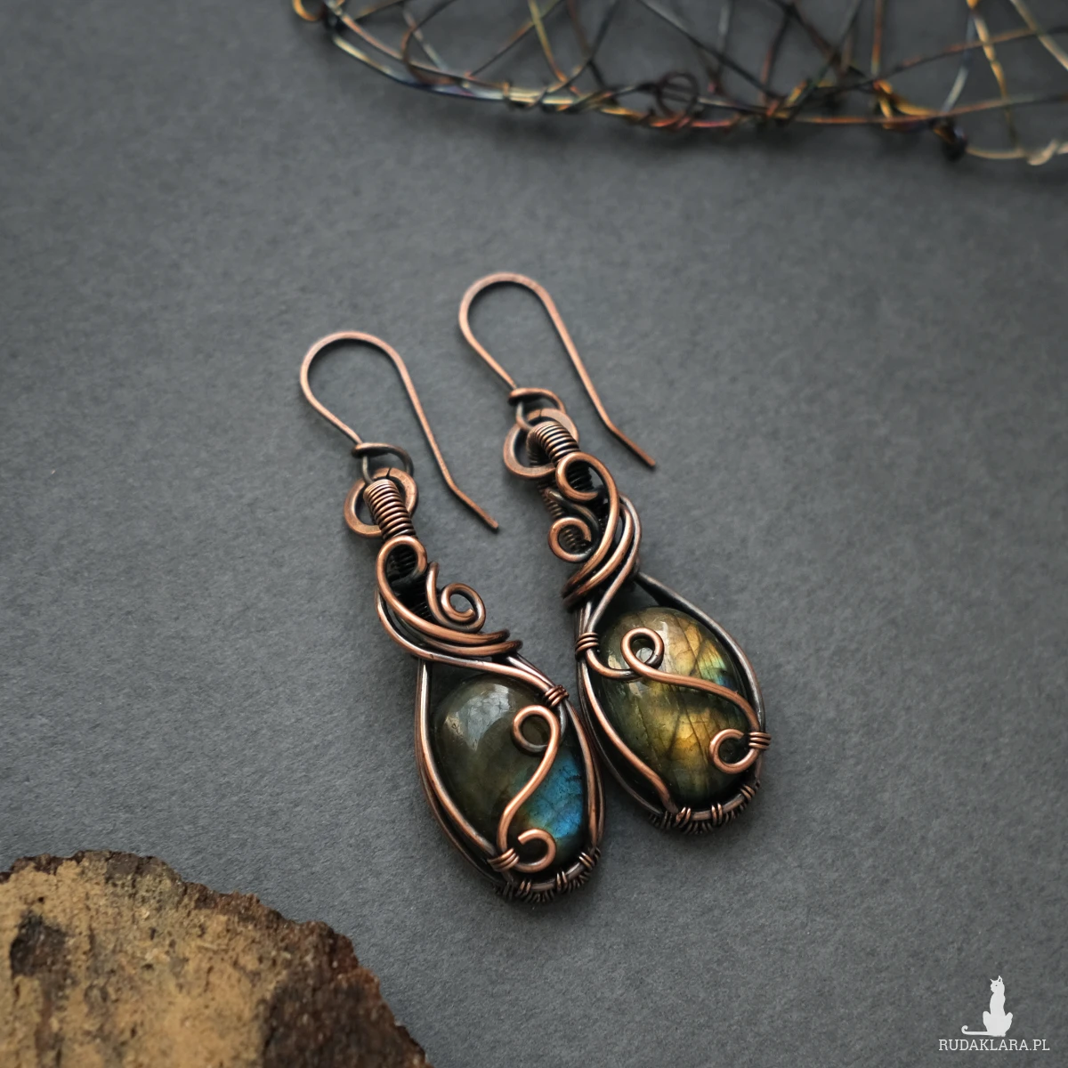 Ręcznie wykonane miedziane kolczyki z pięknymi kamieniami labradorytu. Posiadają symetryczne sploty oraz ciekawą kolorystykę, każdy kamień jest nieco inny, a jednak świetnie ze sobą współgrają. Kolczyki zostały wykonane w jednej parze pracochłonną techniką wire wrapping.