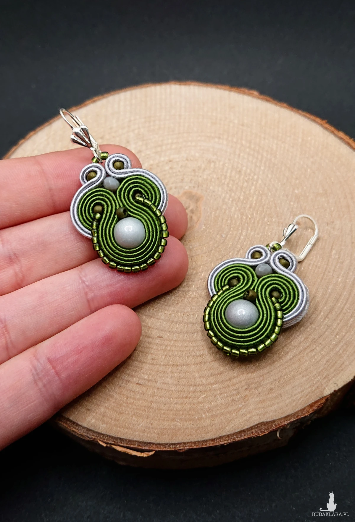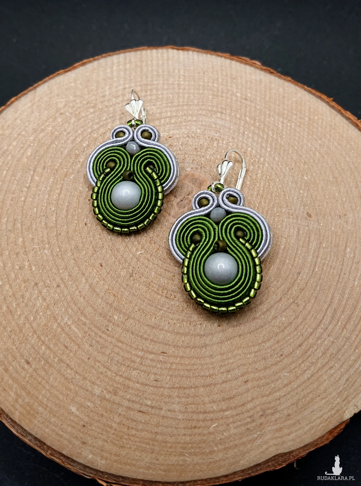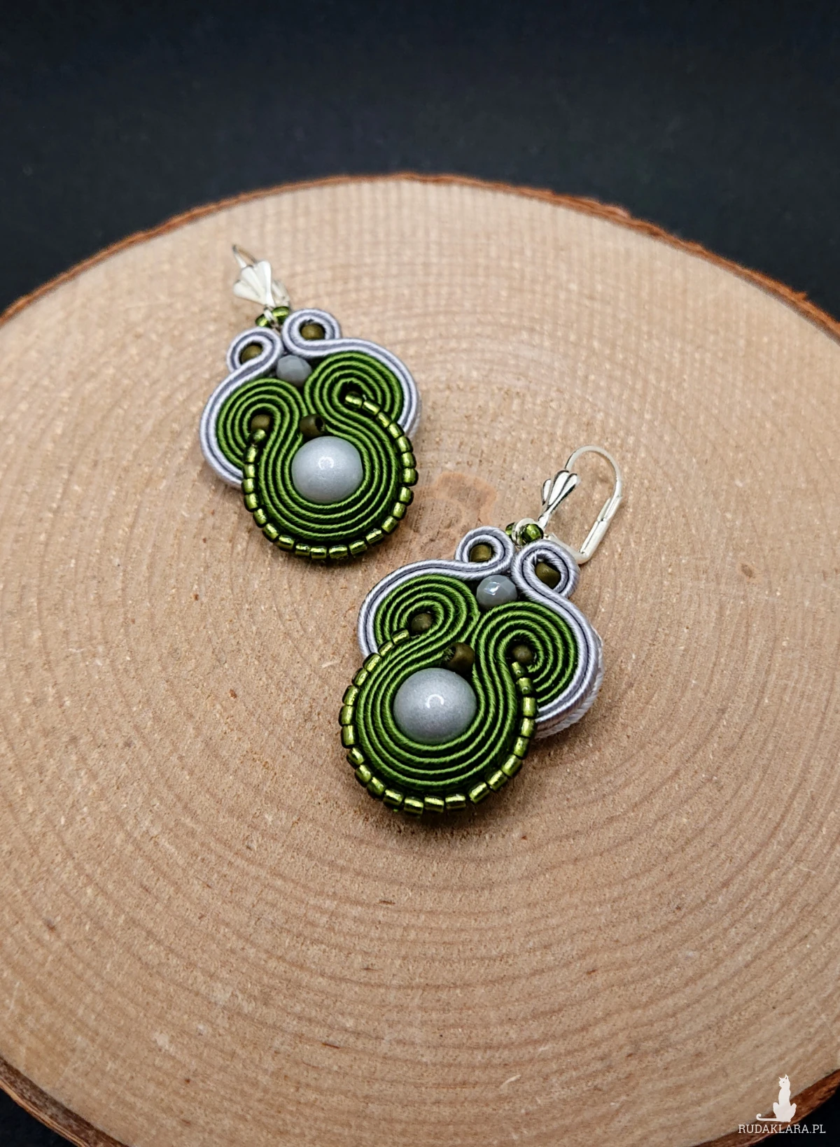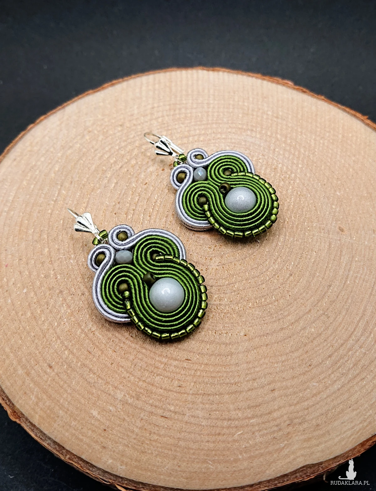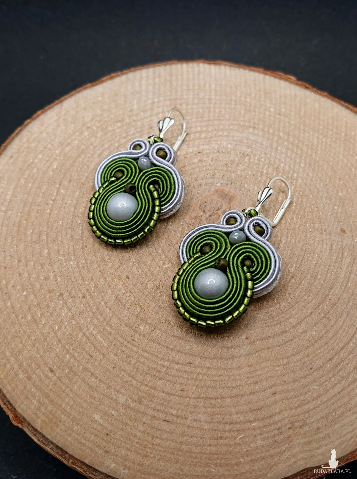 Kolczyki w kolorze zielono-szarym z szklanymi kulkami. Srebrne kulki otoczone sznurkami sutasz oraz szklanymi koralikami w kolorach oliwkowym i szarym o różnych wielkościach. Kolczyki zawieszone na ozdobnych biglach angielskich w kolorze srebrnym.