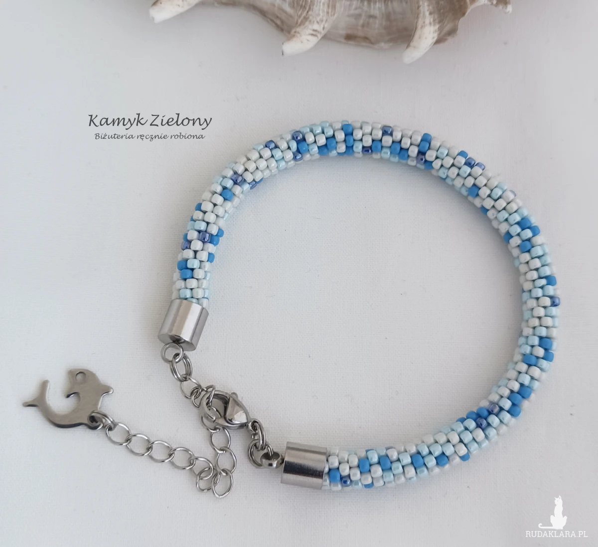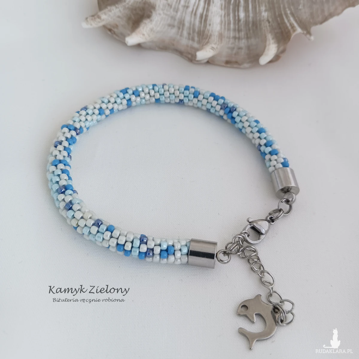 Bransoletka ma formę cienkiego melanżowego sznura koralikowego i została wykończona elementami ze stali chirurgicznej. Na końcu łańcuszka przedłużającego dopięta została przywieszka w kształcie delfinka.