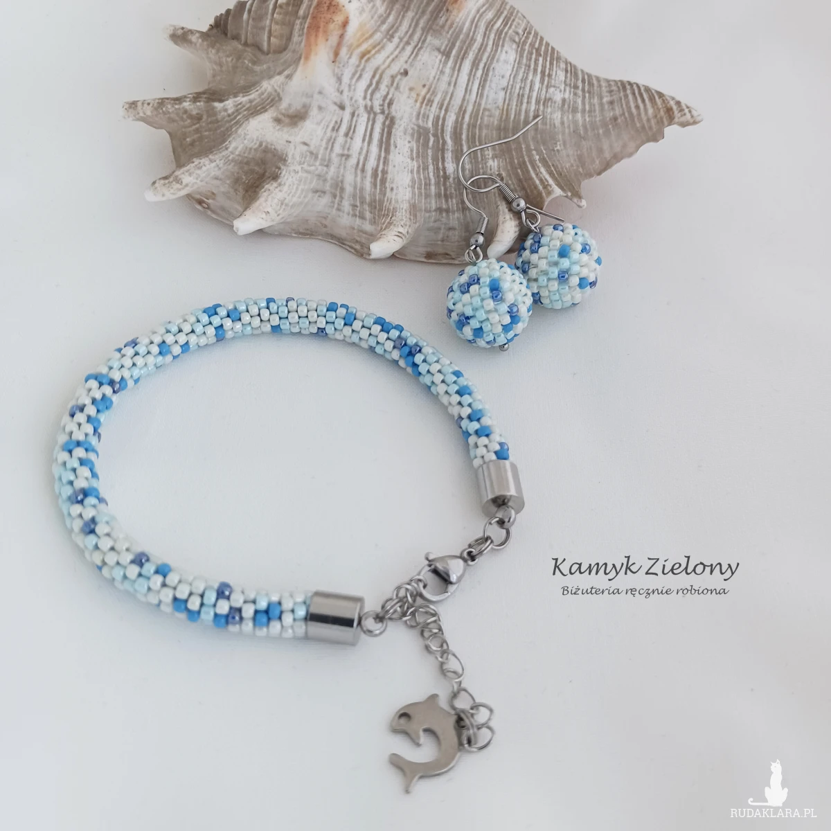 Komplet koralikowej biżuterii składający się z bransoletki oraz kolczyków. Został wykonany ręcznie z wysokiej jakości, szklanych koralików Toho - z mieszanki koralików w kolorze beżowym i różnych odcieni niebieskiego.