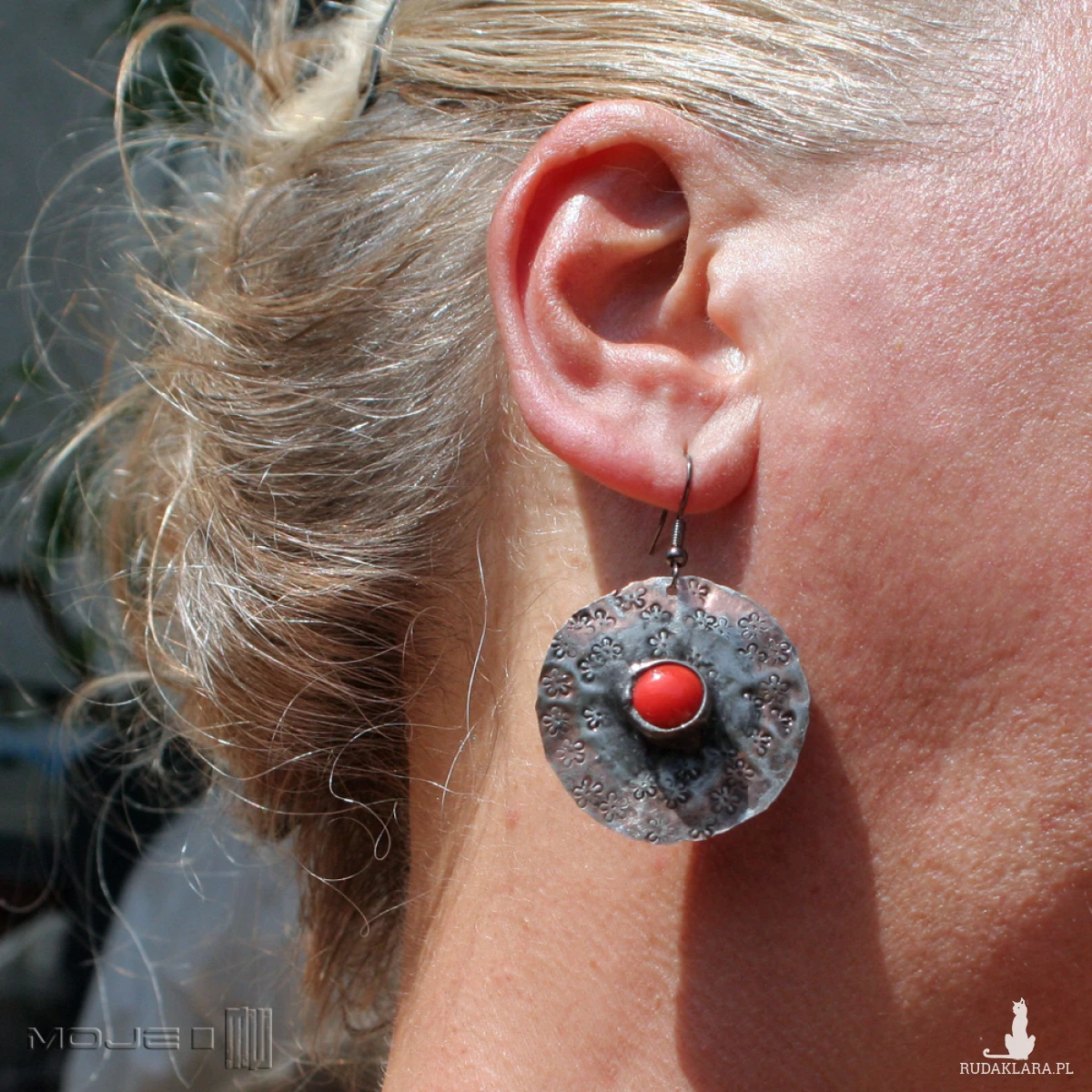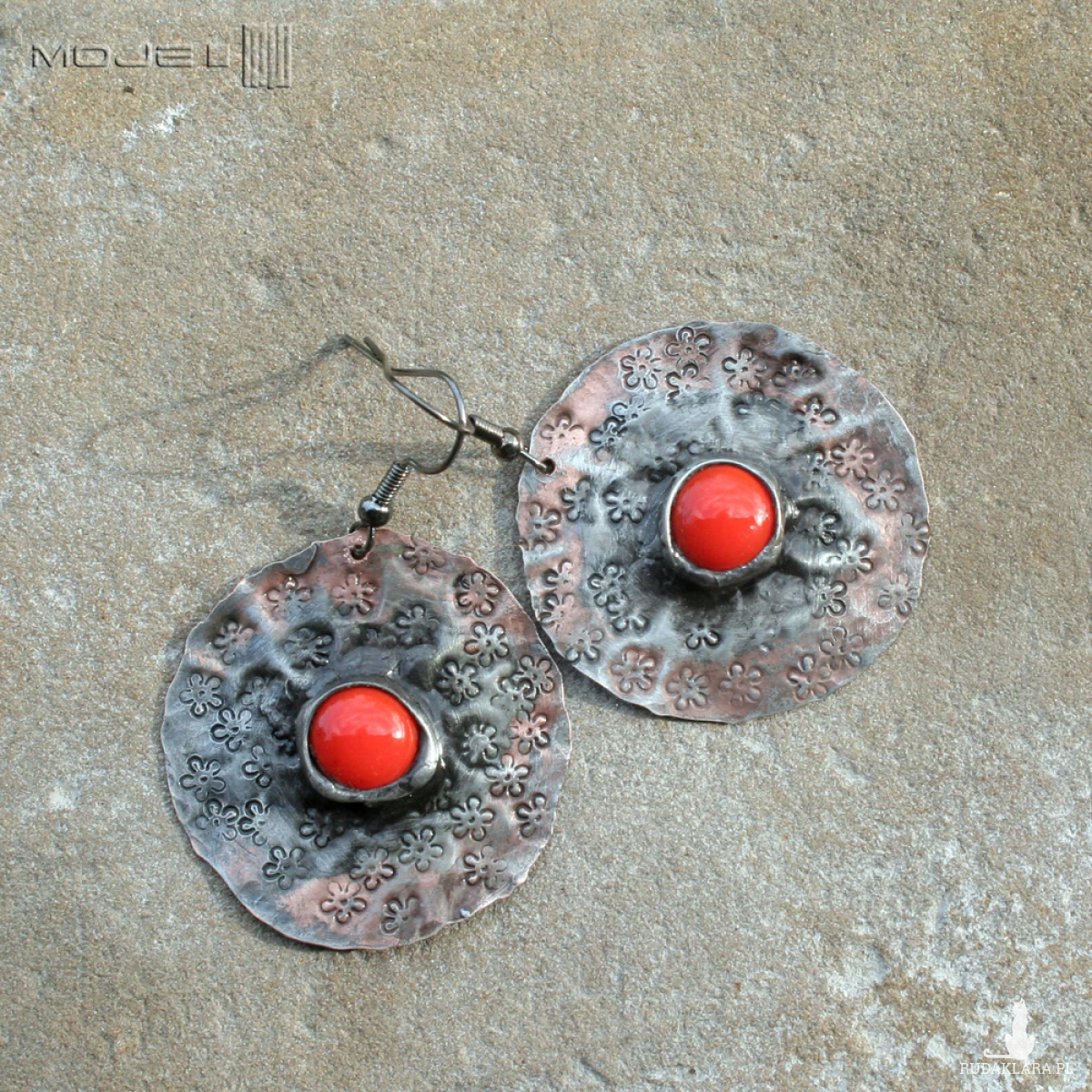 Miedziane okrągłe kolczyki ze szklanym okiem w cynobrowym kolorze. Blaszka jest ozdobiona małymi kwiatuszkami - młotkowana, pokryta cyną, patynowana i przecierana dla wydobycia wzoru. Blaszka jest cienka, a kolczyki dzięki temu lekkie. Metalowe bigle.