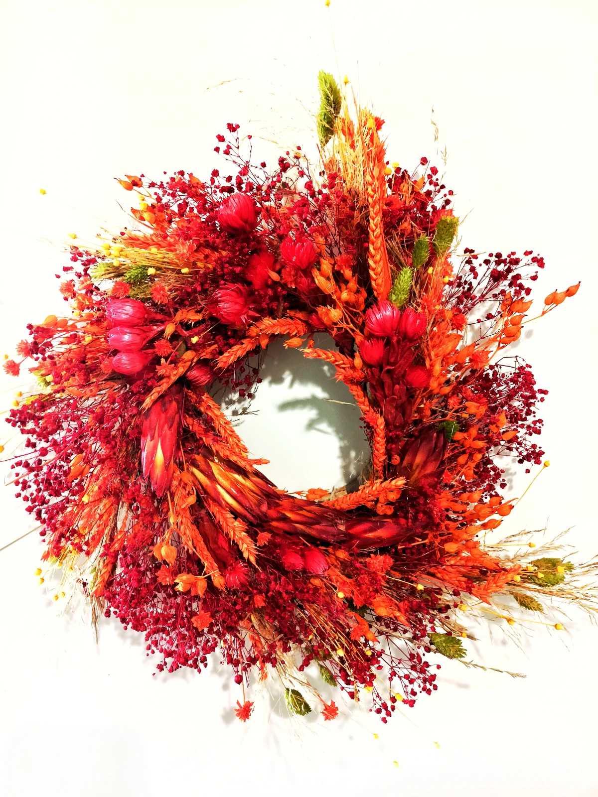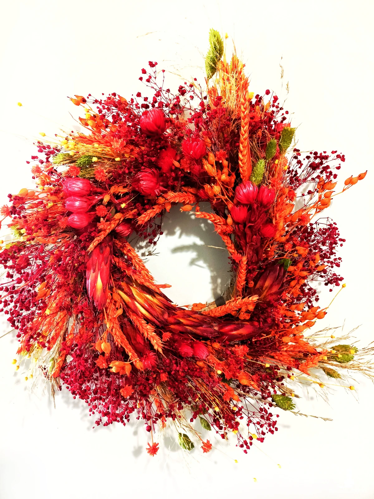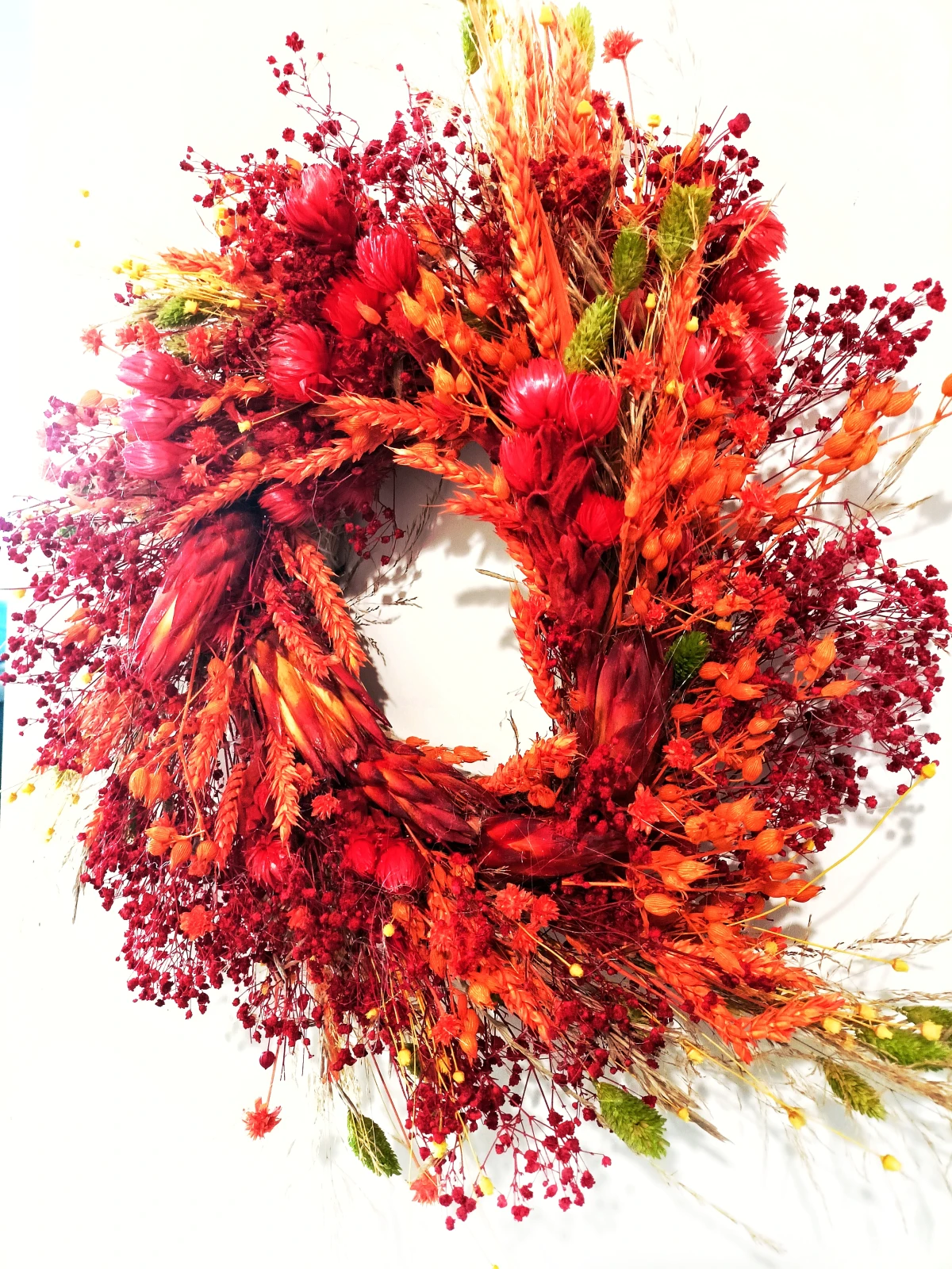 wianek z suszonych kwiatów • wianek czerwono-pomarańczowy • wianek boho • ozdoba na drzwi • dekoracja ze stabilizowanych roślin • folkowy wianek • rustykalna dekoracja • stroik na stół • wianek handmade • prezent na parapetówkę • naturalna ozdoba do domu