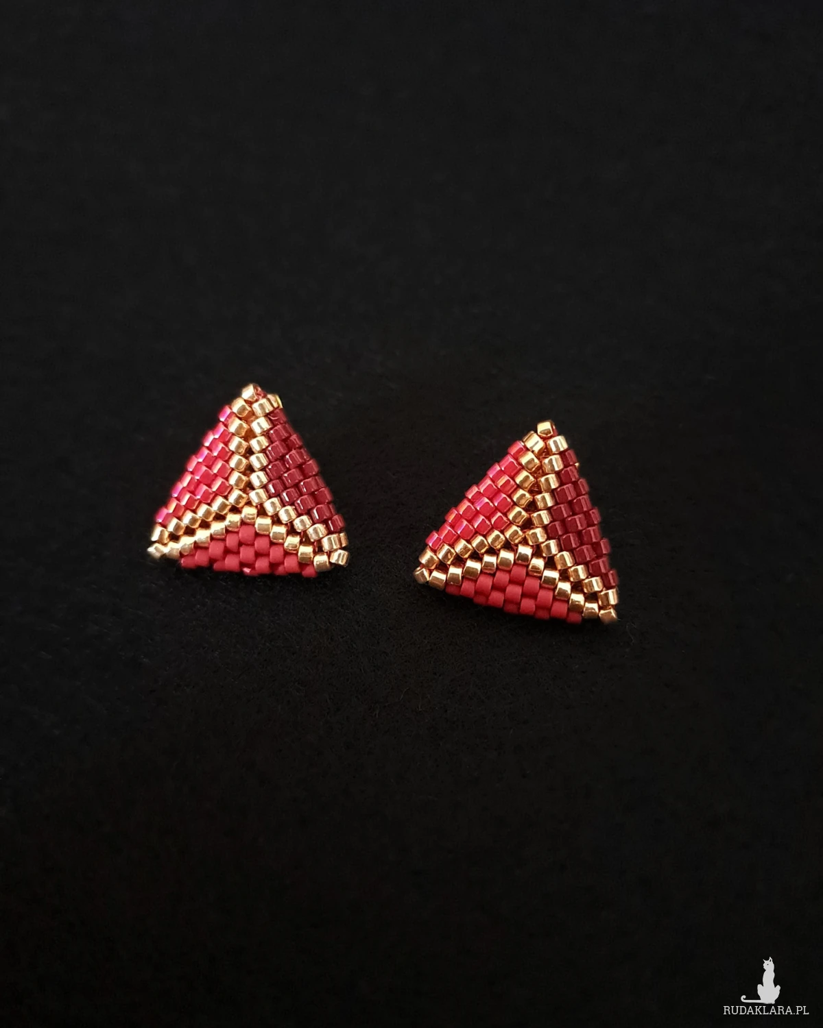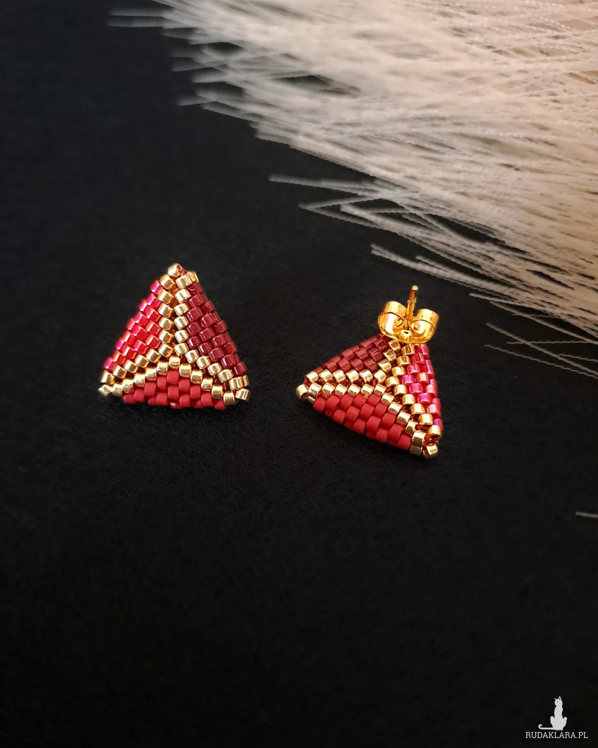 ❤️ Ręcznie wykonane kolczyki w kształcie trójkątów, w odcieniach czerwieni, złota i brązu