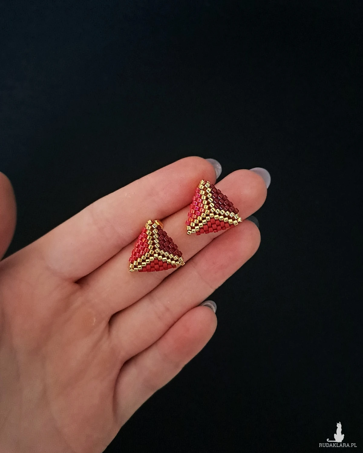 Kolczyki mają formę geometrycznych trójkątów o wymiarach 1,5 × 1,5 cm, utkanych ściegiem peyote - znanym z rytmicznej struktury i elastycznego splotu.
