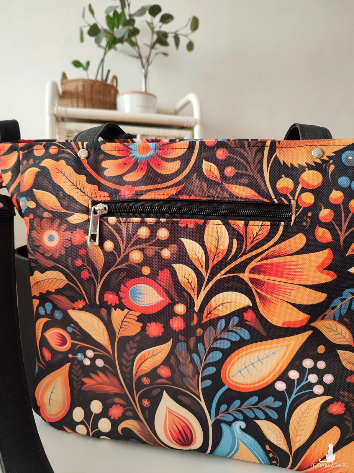 Długie uszy do noszenia na ramieniu oraz długi odpinany regulowany pasek do noszenia na skos przez ciało.