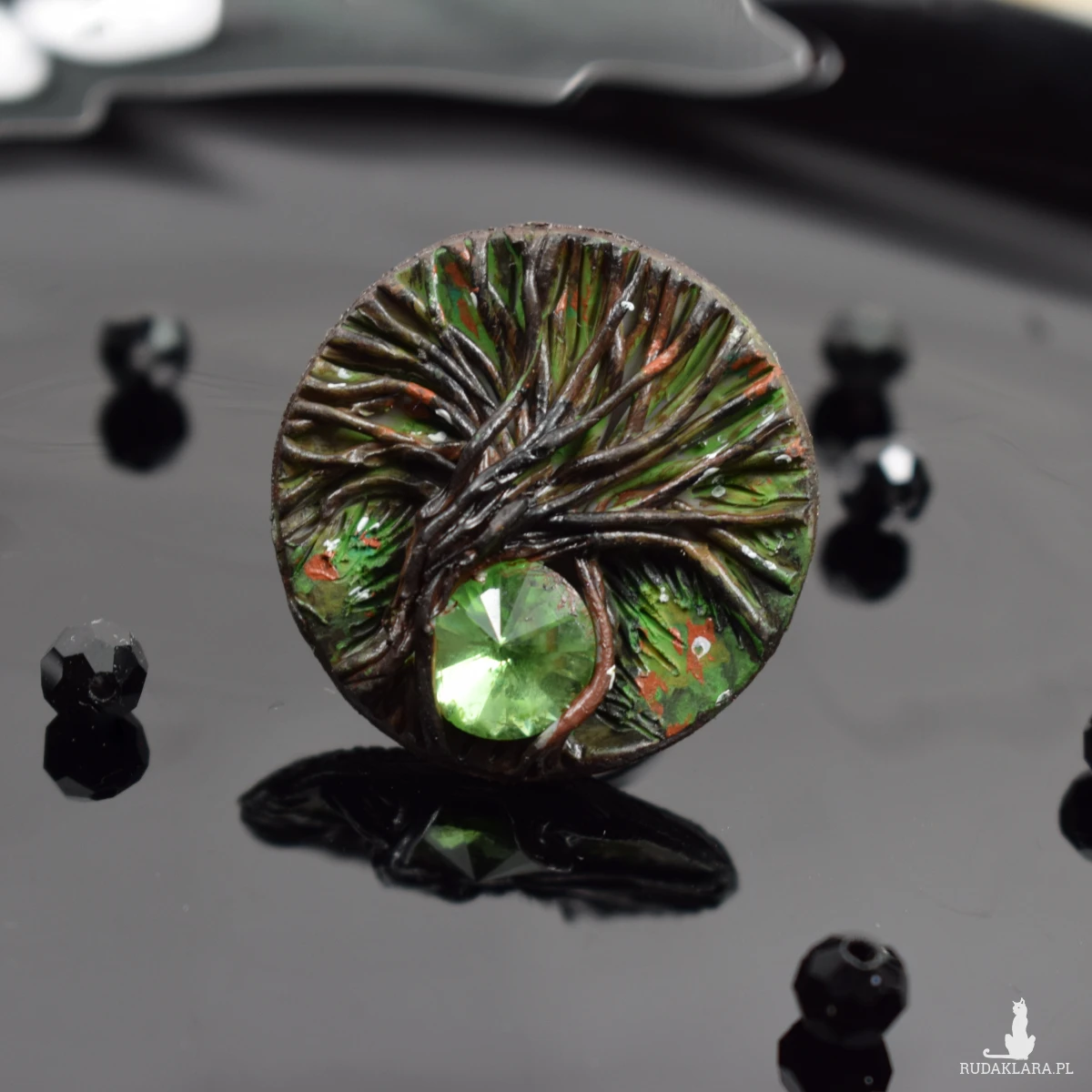 Ozdobny element z drzewem ma średnicę 3 cm. Wykonałam go ręcznie z glinki polimerowej. Jest to materiał trwały, lekki i odporny na uszkodzenia.