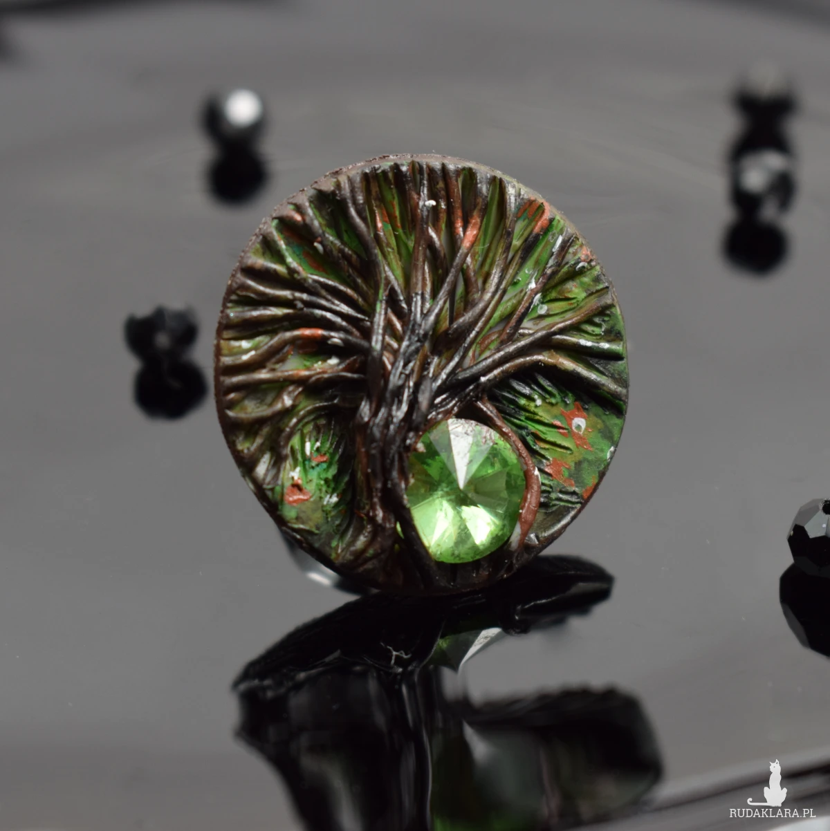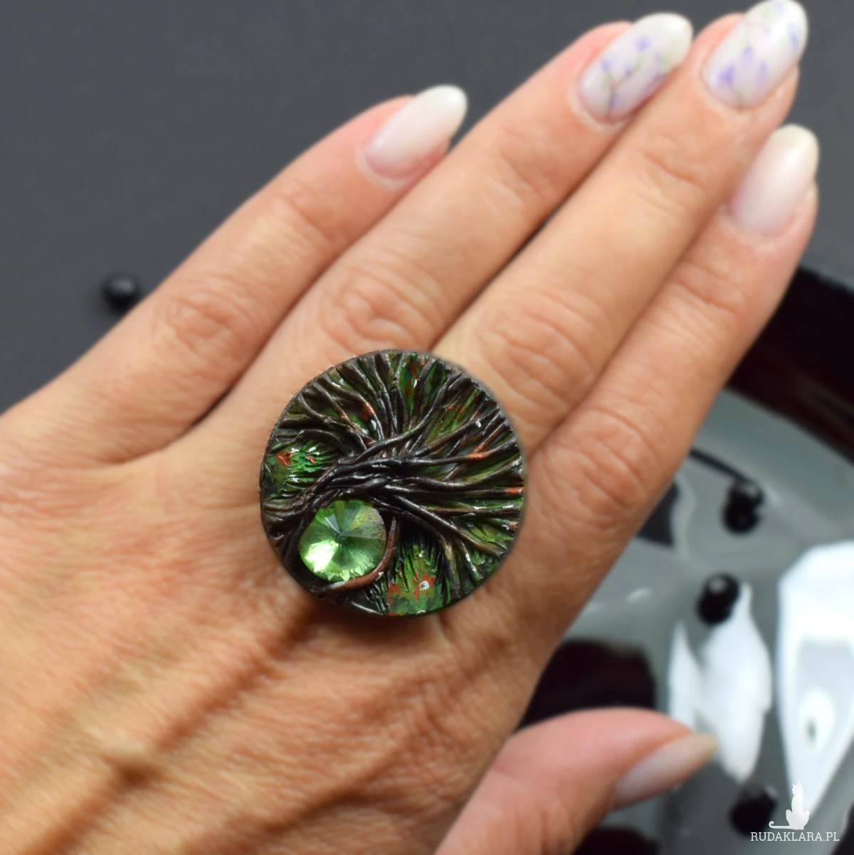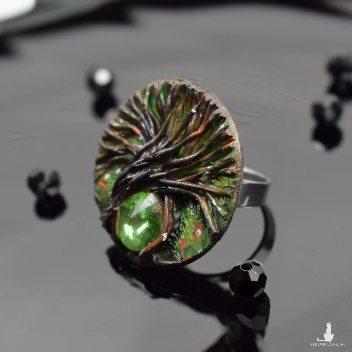 Duży, przyciągający uwagę pierścionek z motywem drzewa, oplatającego pięknie mieniący się, zielony kryształ.