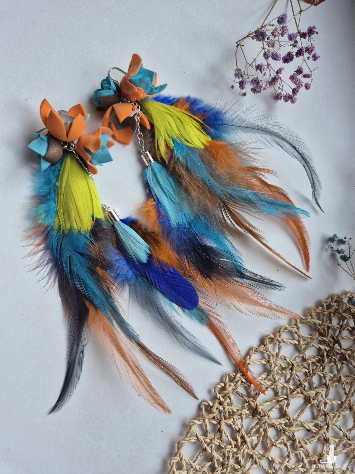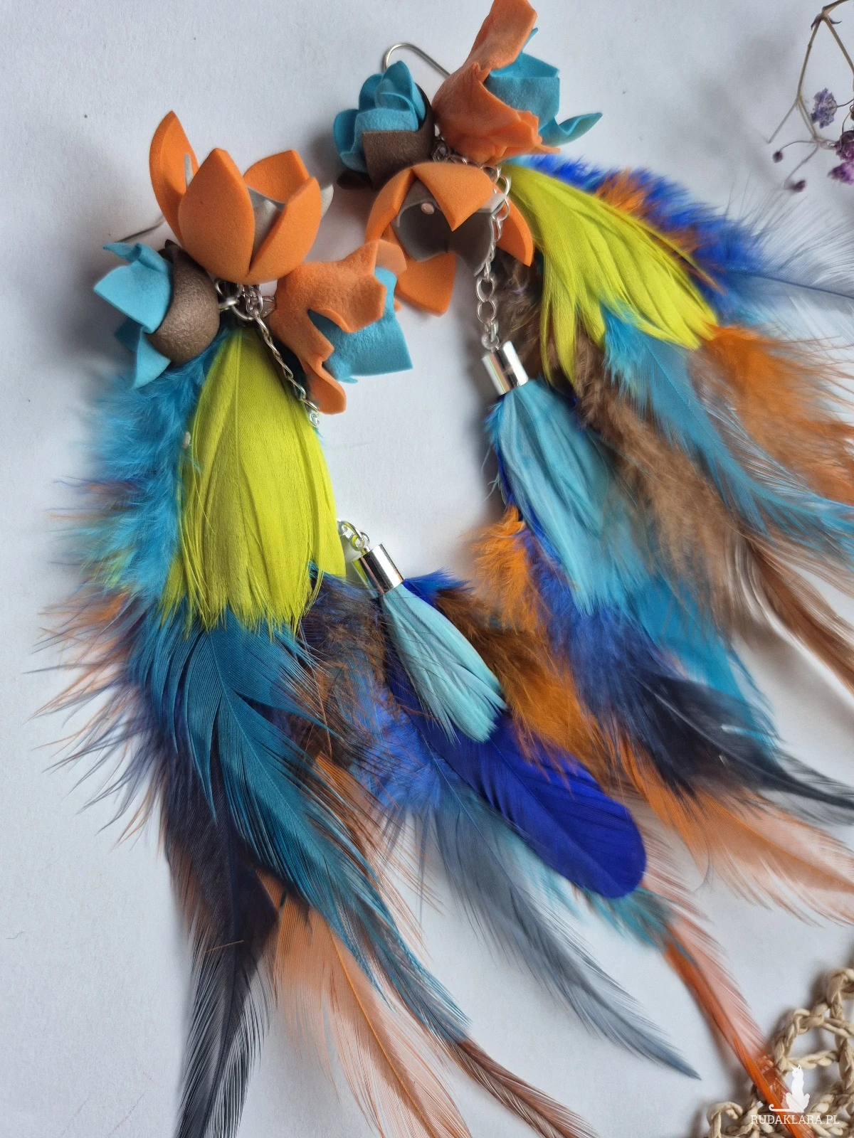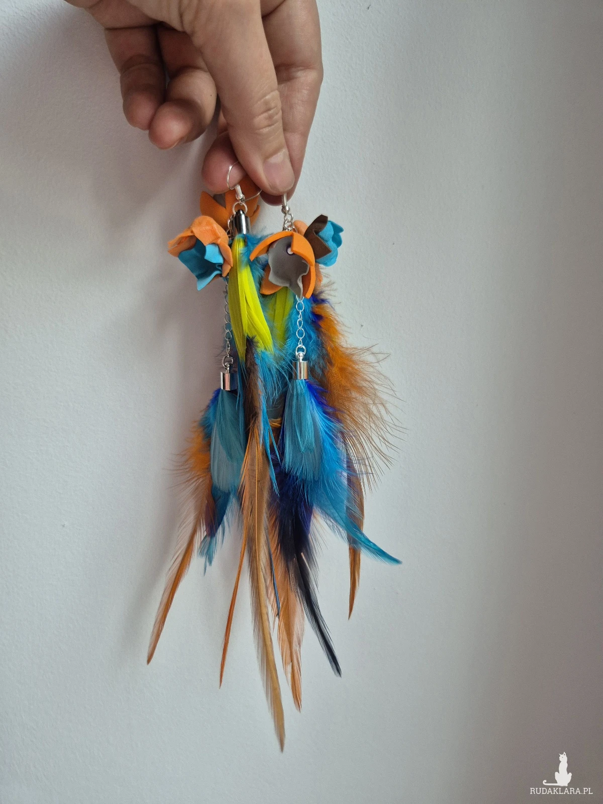 Kolczyki długie leciutkie pióra i kwiaty niezwykle zjawiskowe wykonane w pojedynczym egzemplarzu ręcznie polecam
