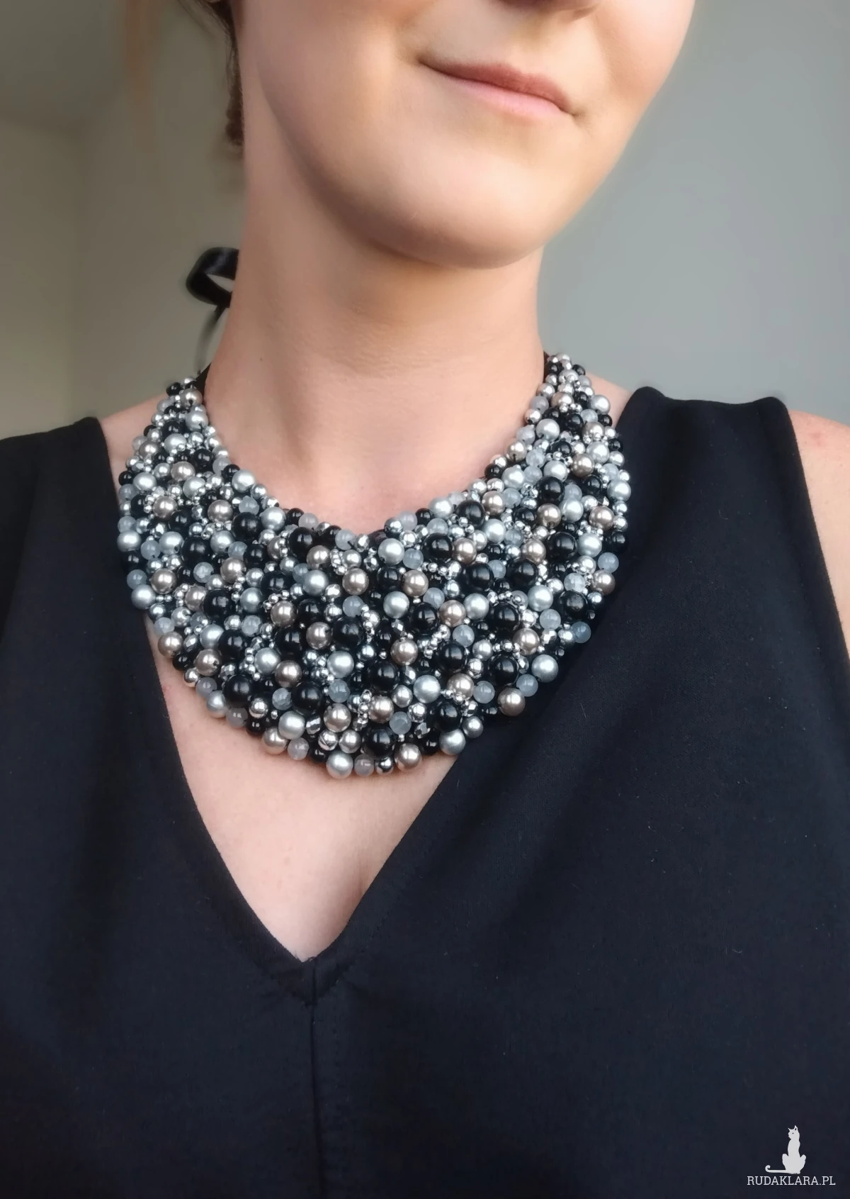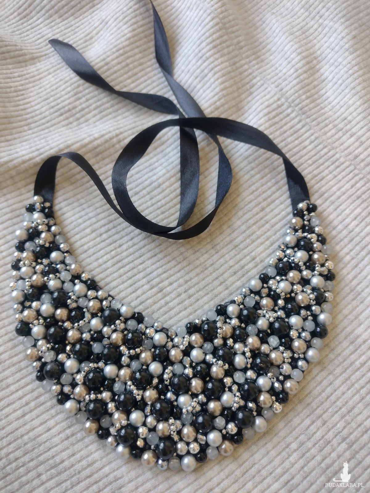 Naszyjnik srebrny czarnym haftowany koralikami na podłożu z filcu. Zawiązywany na wstążki. Rozmiar uniwersalny.