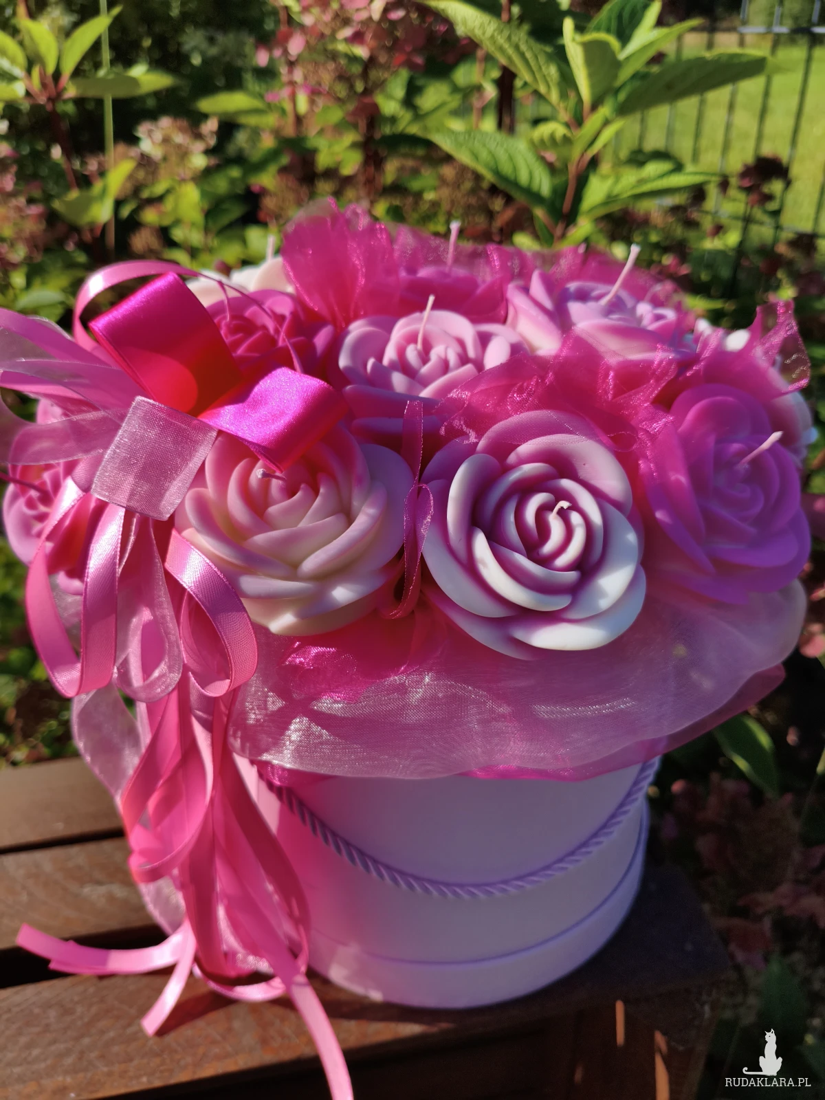 Flower box zawiera główki kwiatów które po wyciągnięciu z bukietu można zapalić. Flower box wysyłam zapakowany w celofan, wstążkę i bukiecik ze suszu oraz instrukcją palenia świec - gotowy do wręczenia jako prezent.