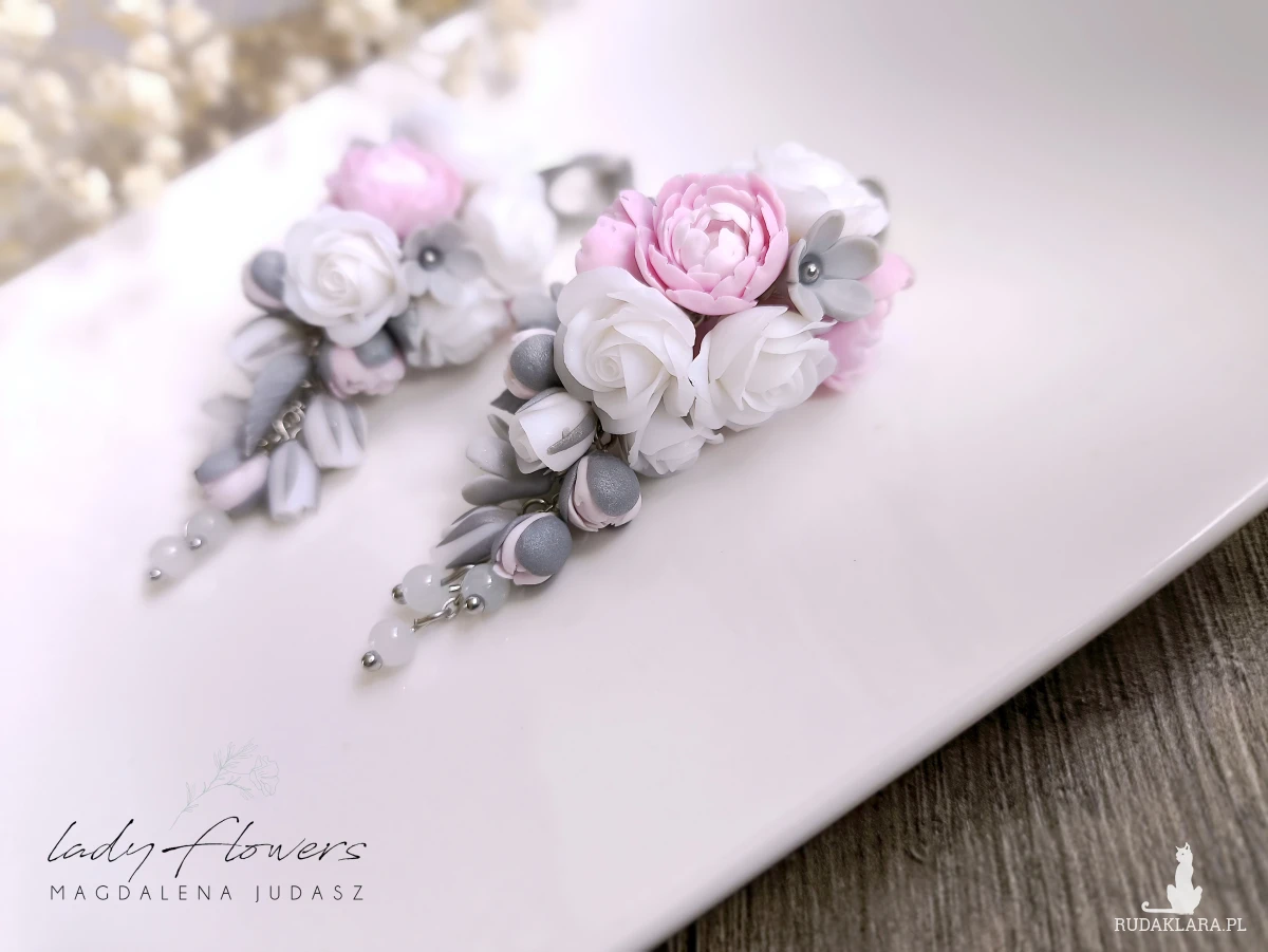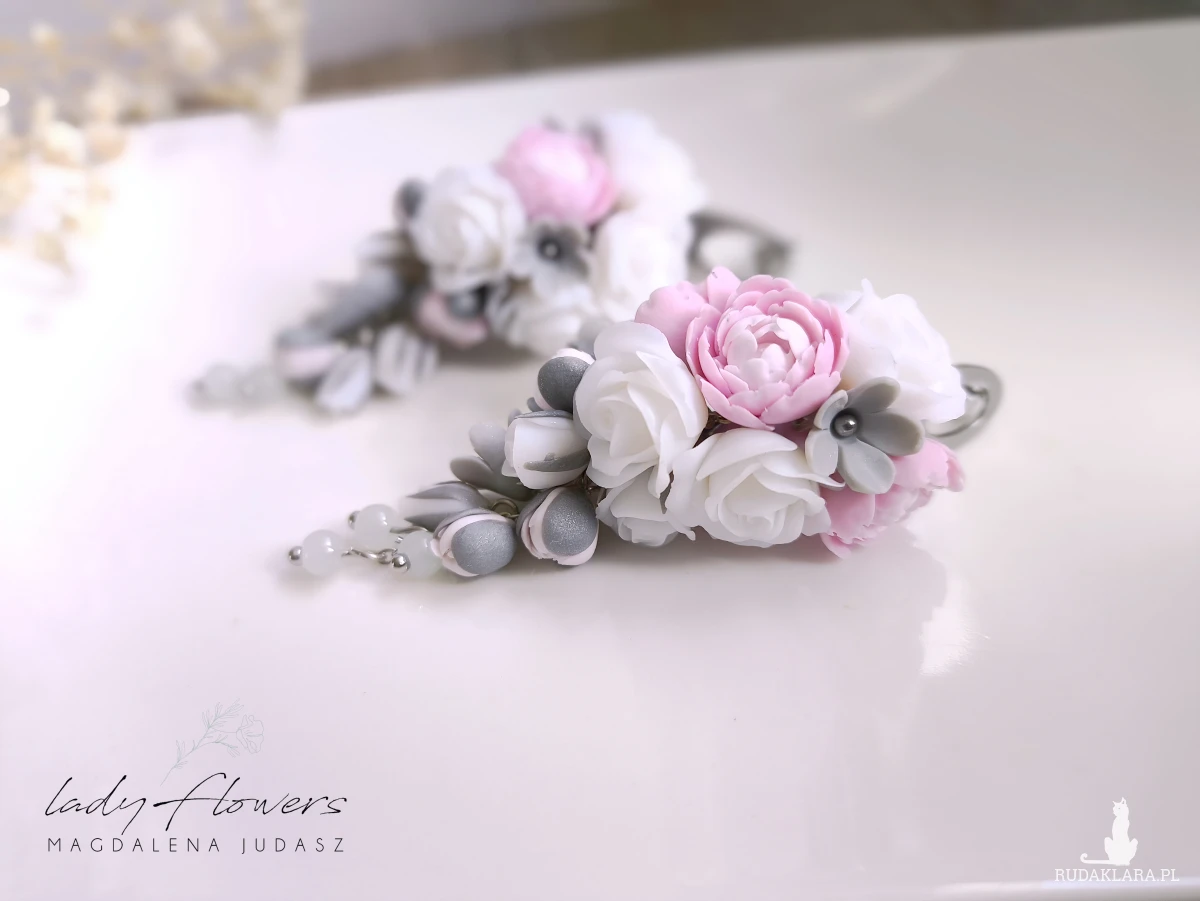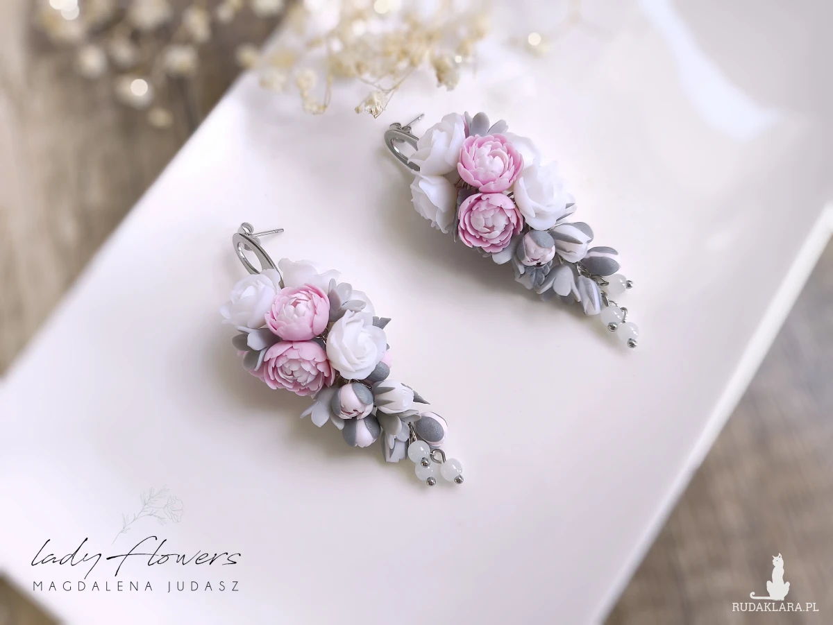Piękne, eleganckie kolczyki z kwiatami peoni i różyczkami.