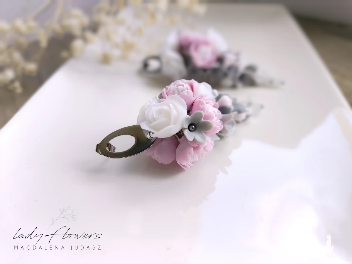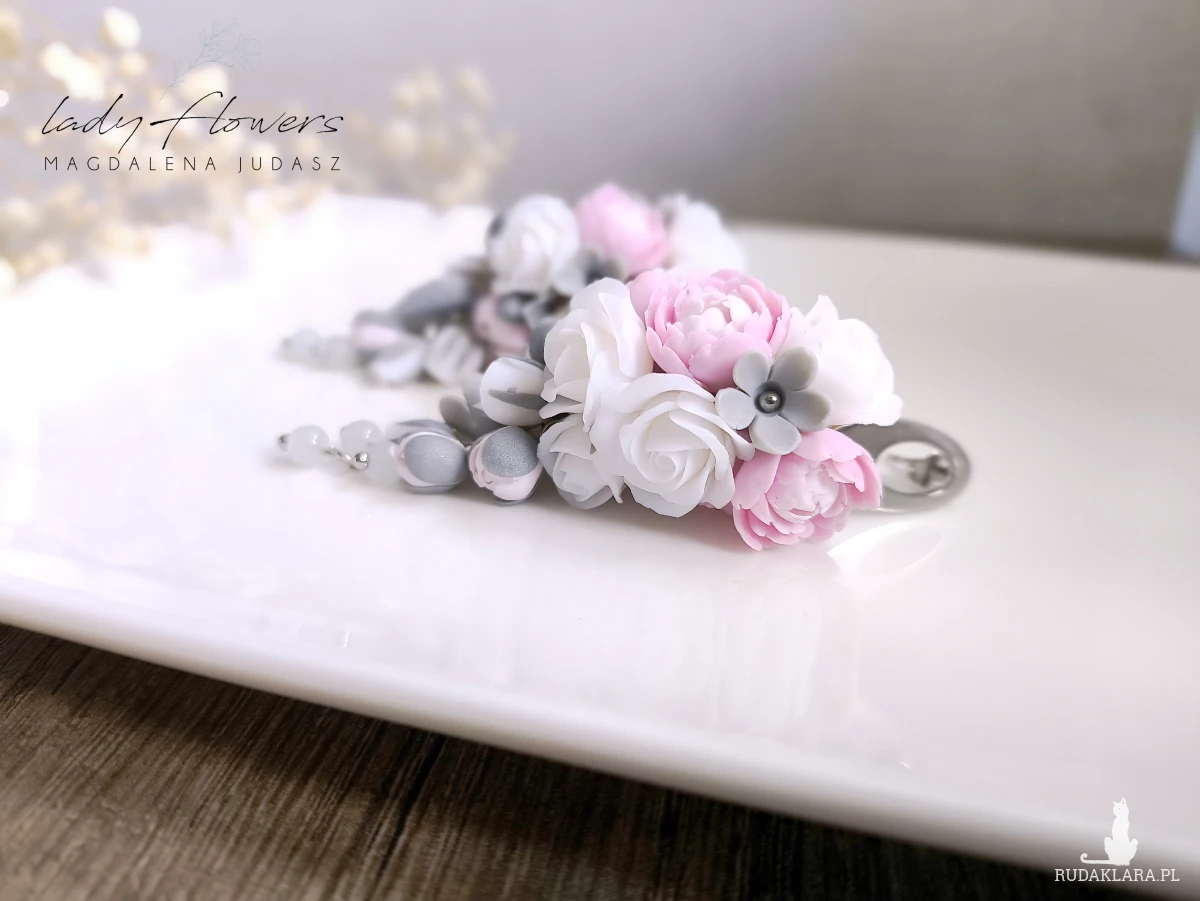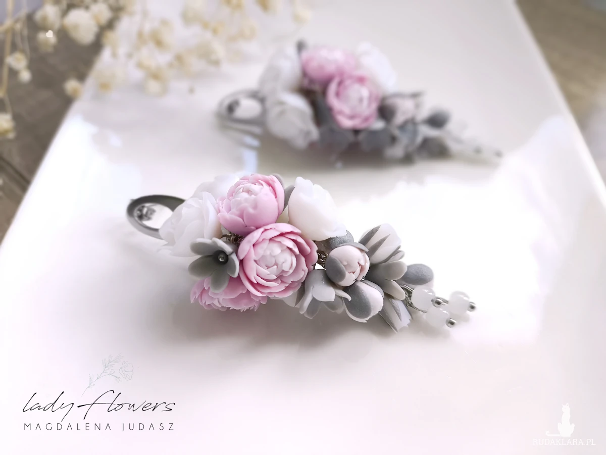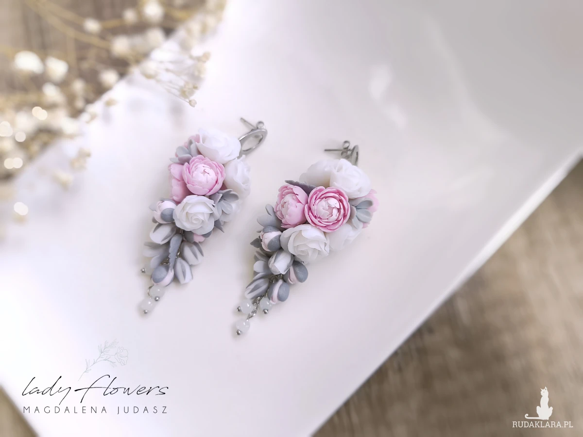 Piękne, eleganckie kolczyki z kwiatami peoni i różyczkami.