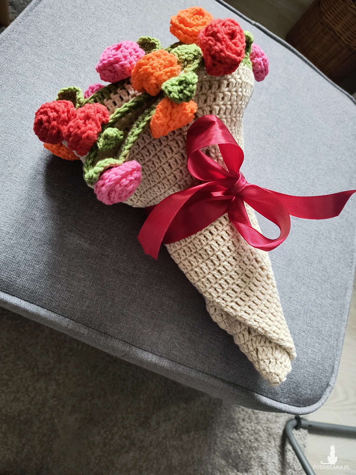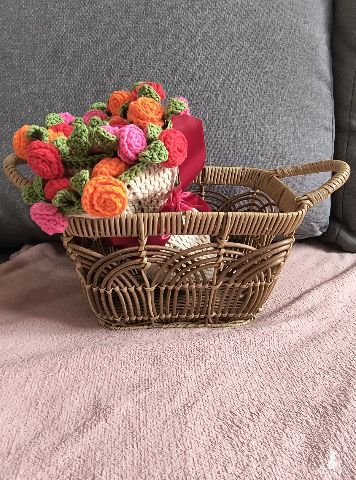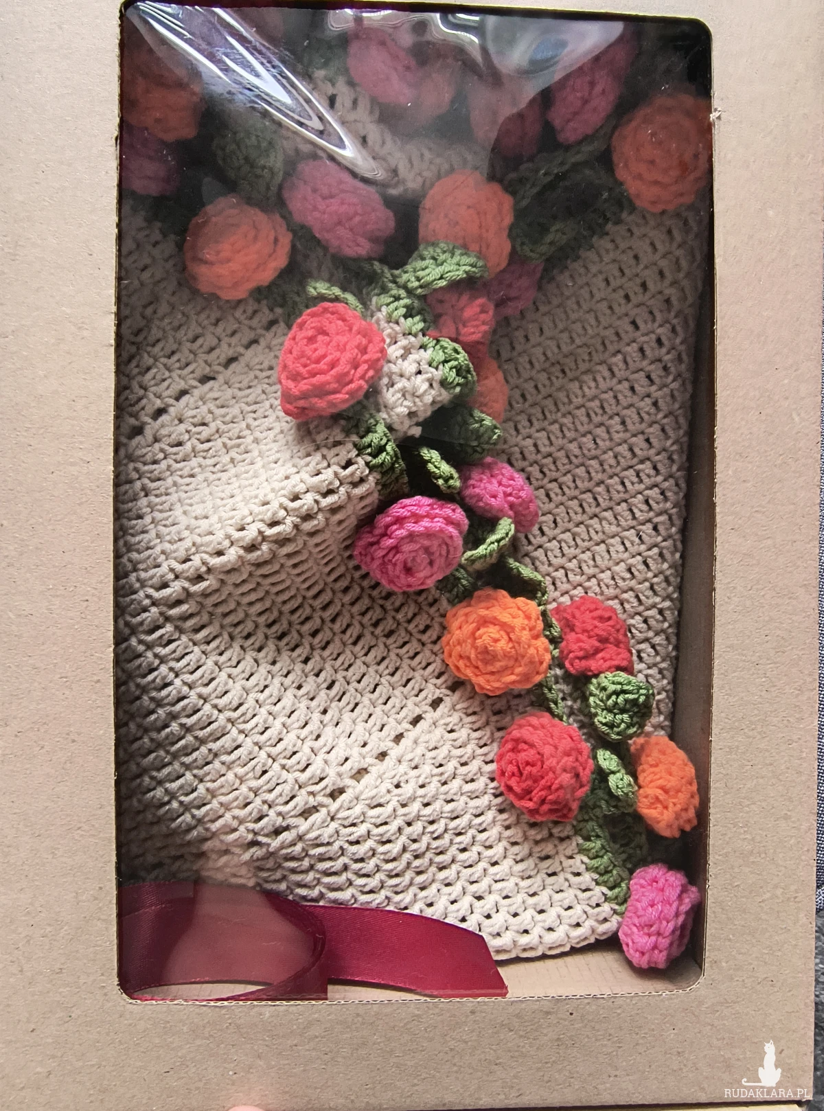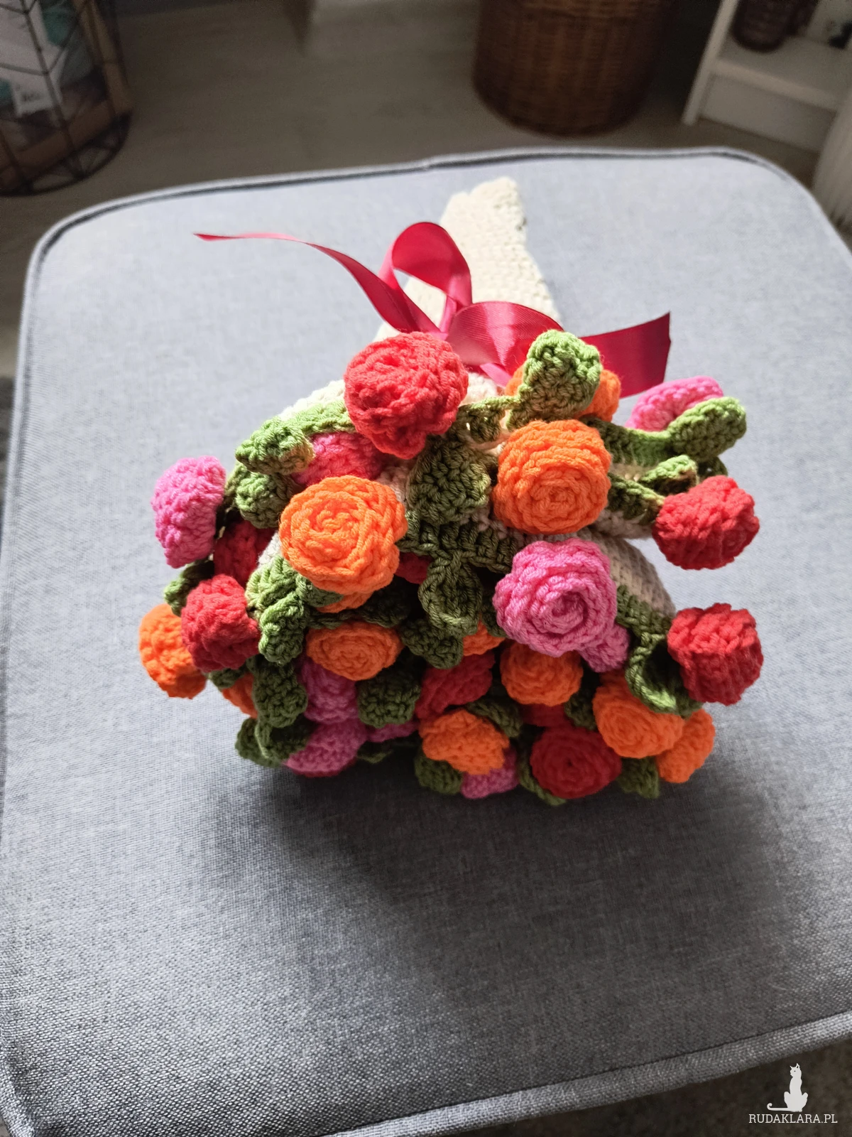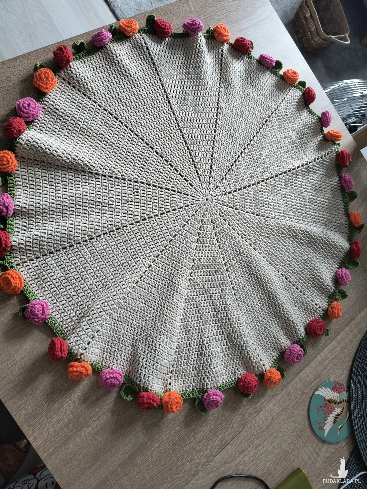 Serwetka o średnicy 66 cm, ale po złożeniu piękny, kolorowy bukiet z 36 ręcznie robionych róż. Całość robiona szydełkiem. Piękny niepowtarzalny prezent lub ozdoba w domu.