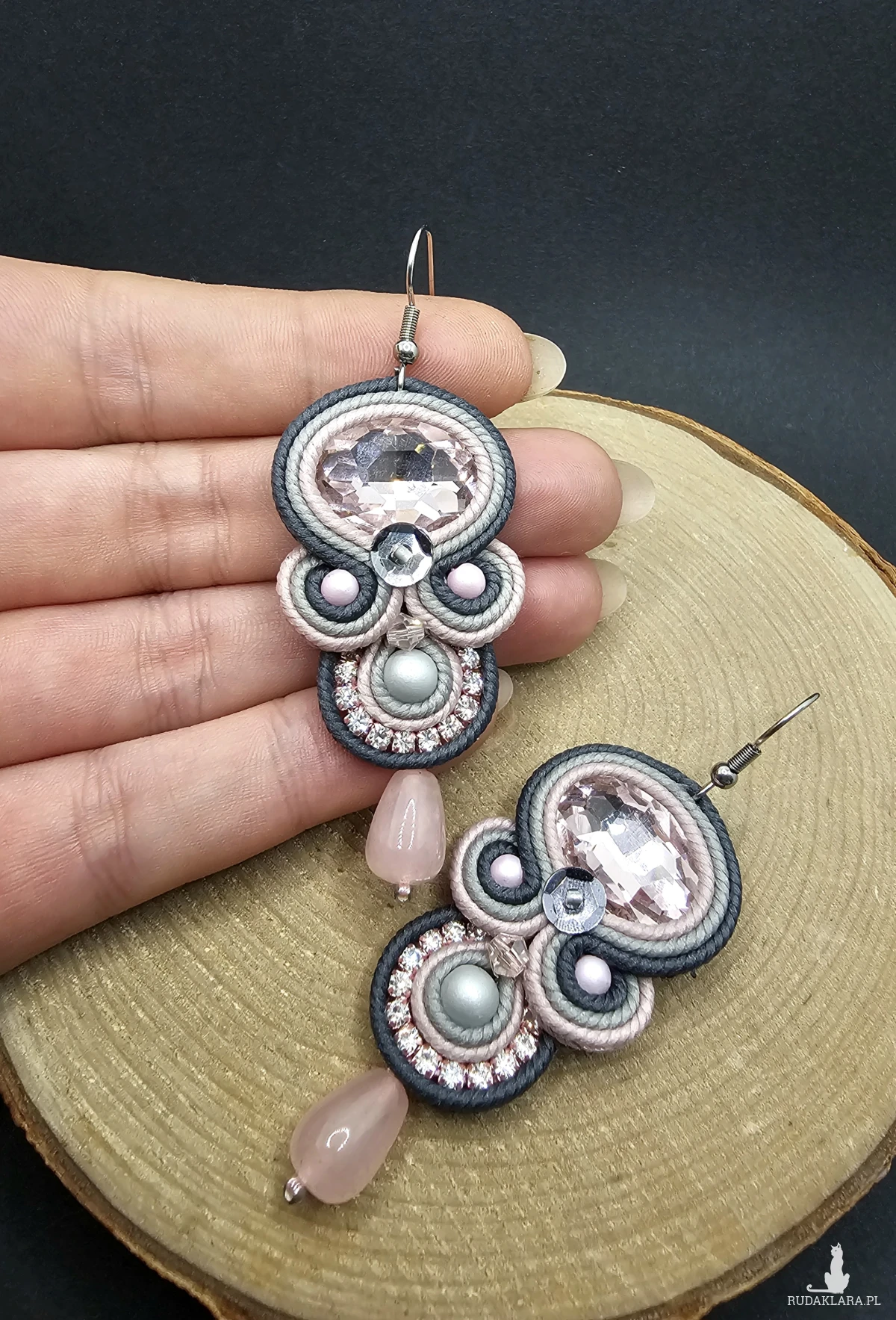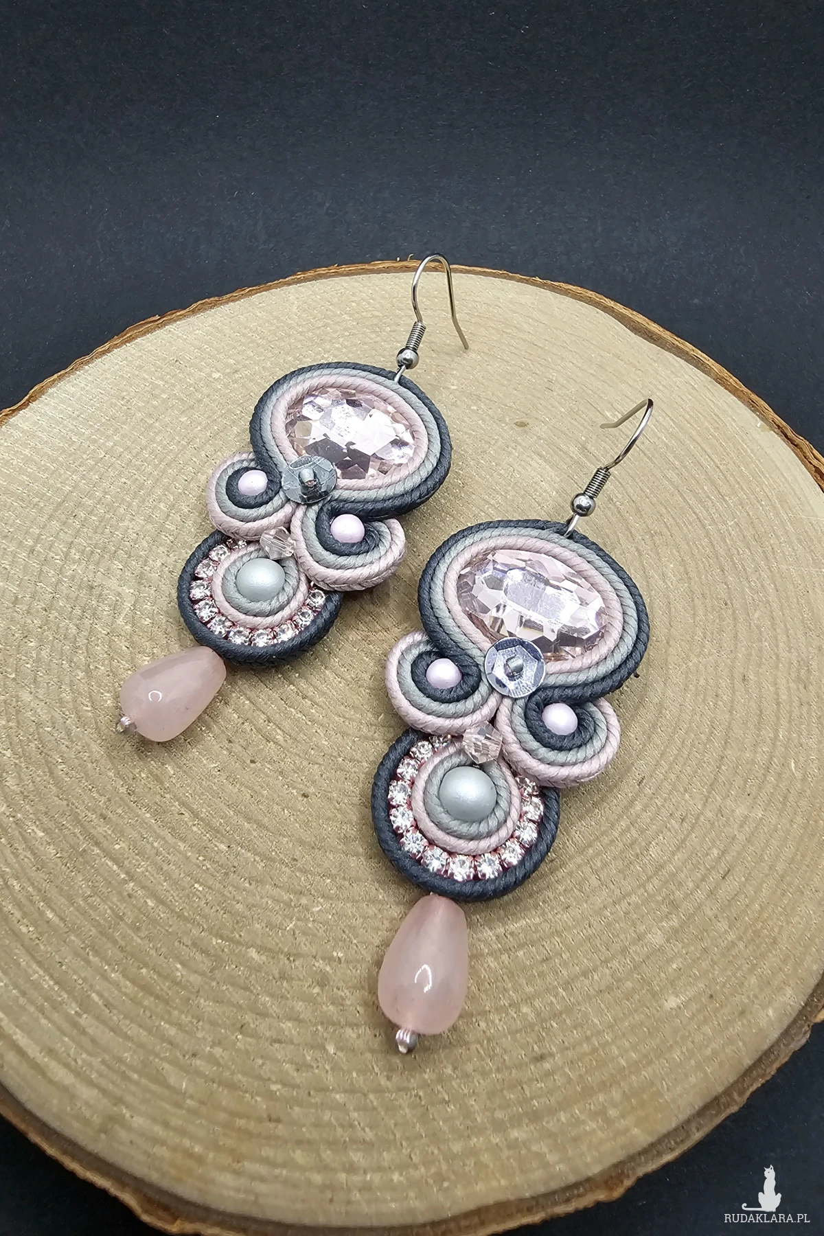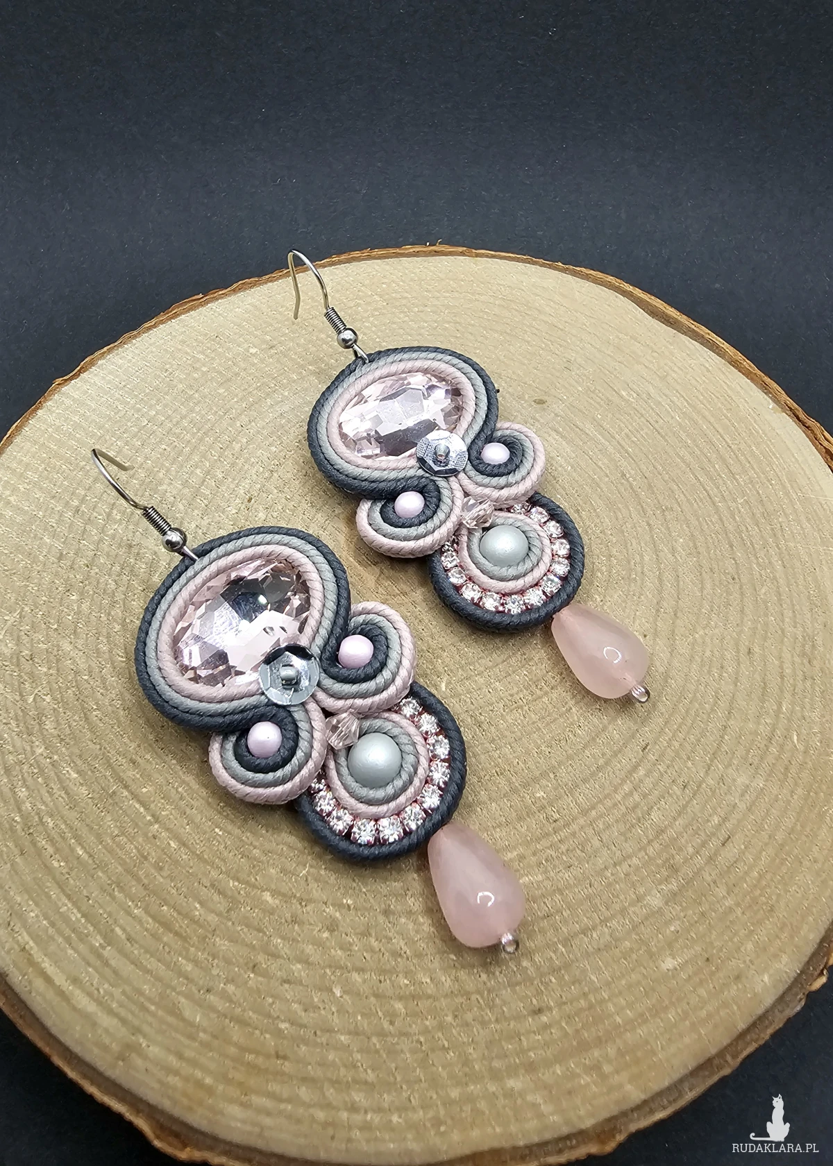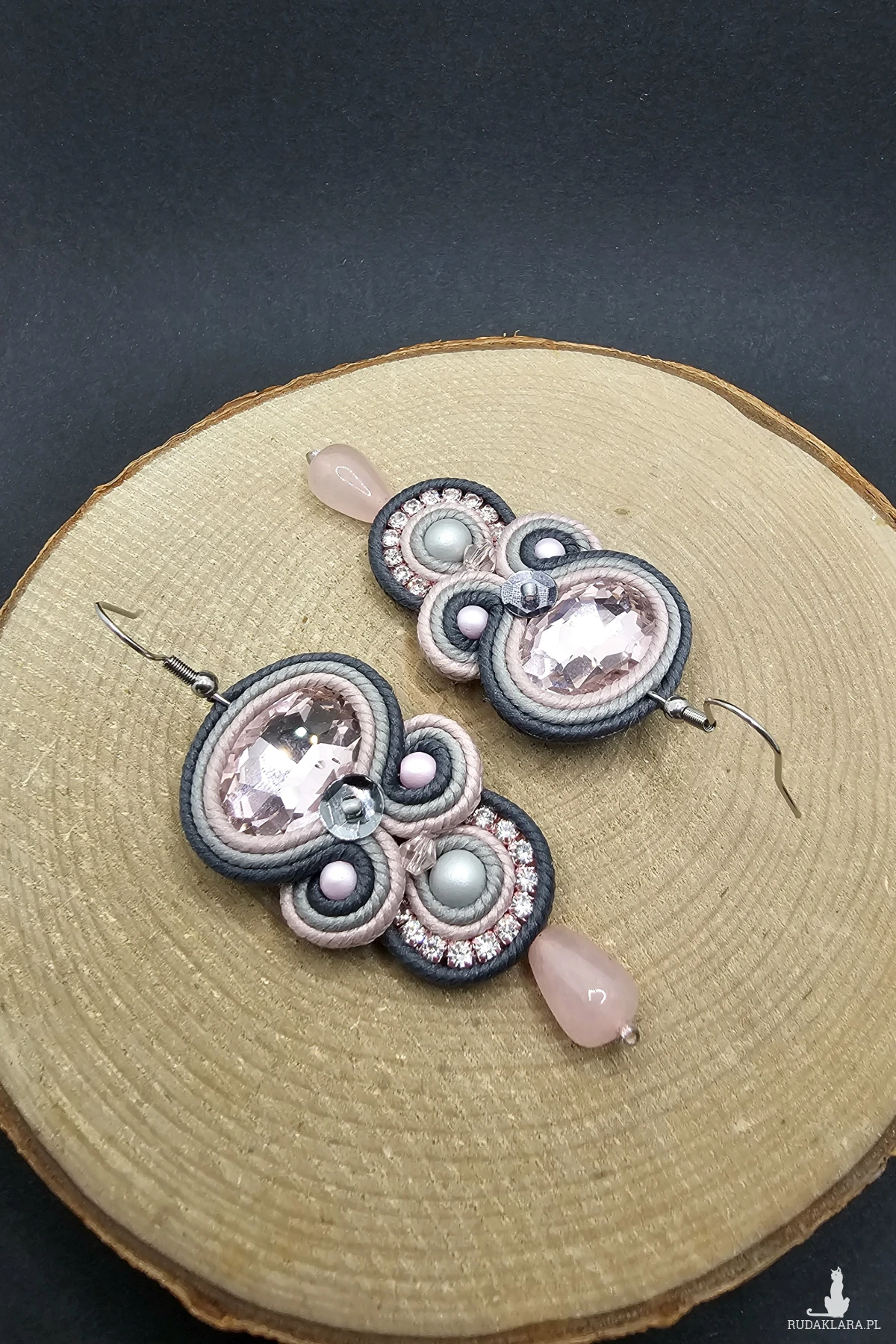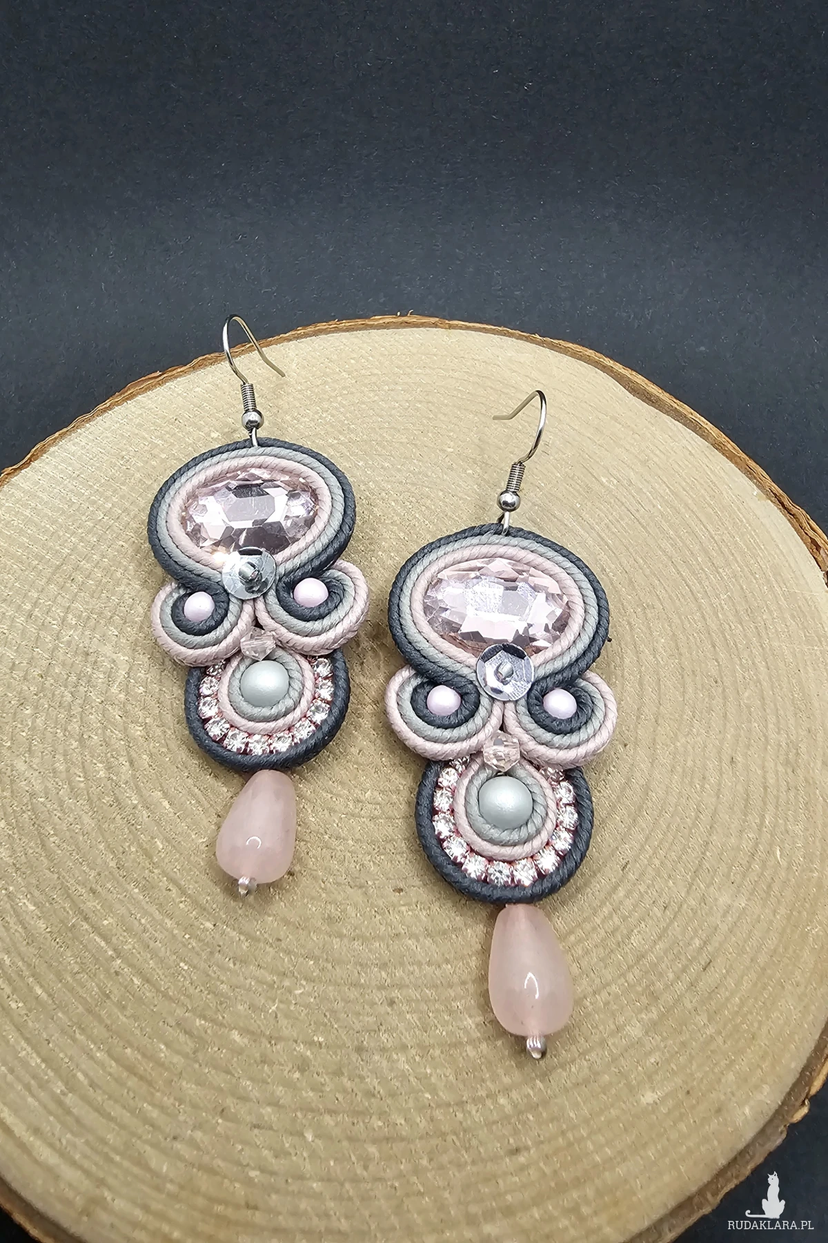 Jasnoróżowe fasetowane kryształki otoczone polskimi sznurkami sutasz oraz szklanymi koralikami o różnych wielkościach. Dopełnieniem kryształków jest mieniąca się taśma cyrkoniowa, która nadaje kolczykom blasku. Dół kolczyków zakończony kroplami jadeitu. Kolczyki zawieszone na klasycznych biglach wykonanych ze stali chirurgicznej.