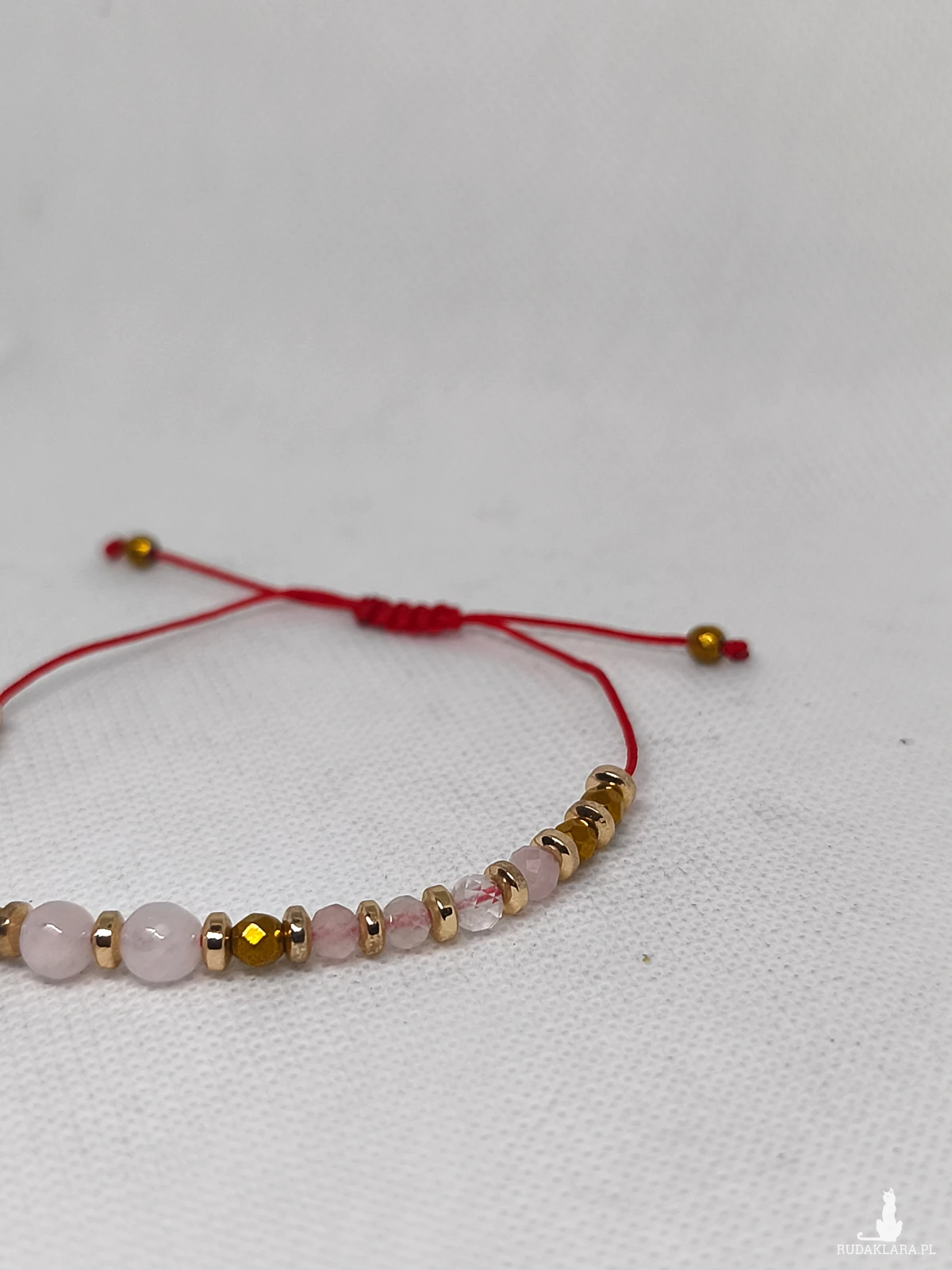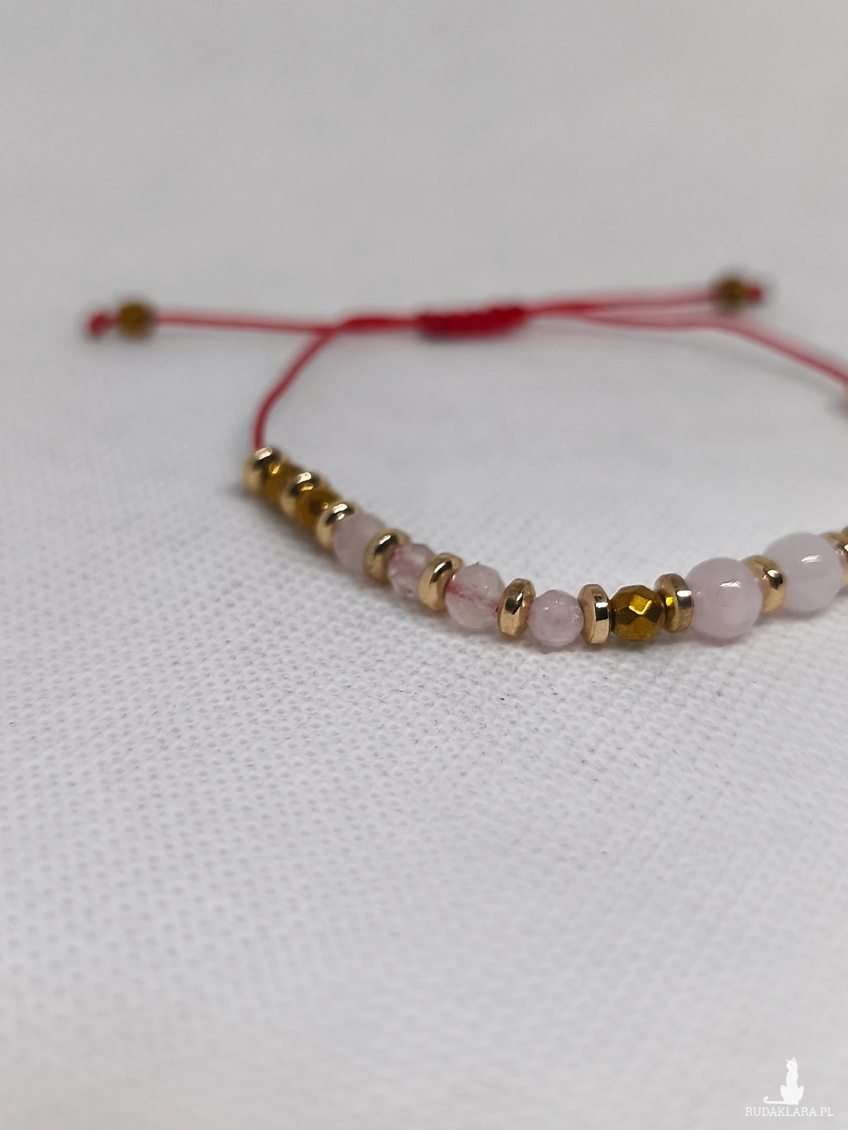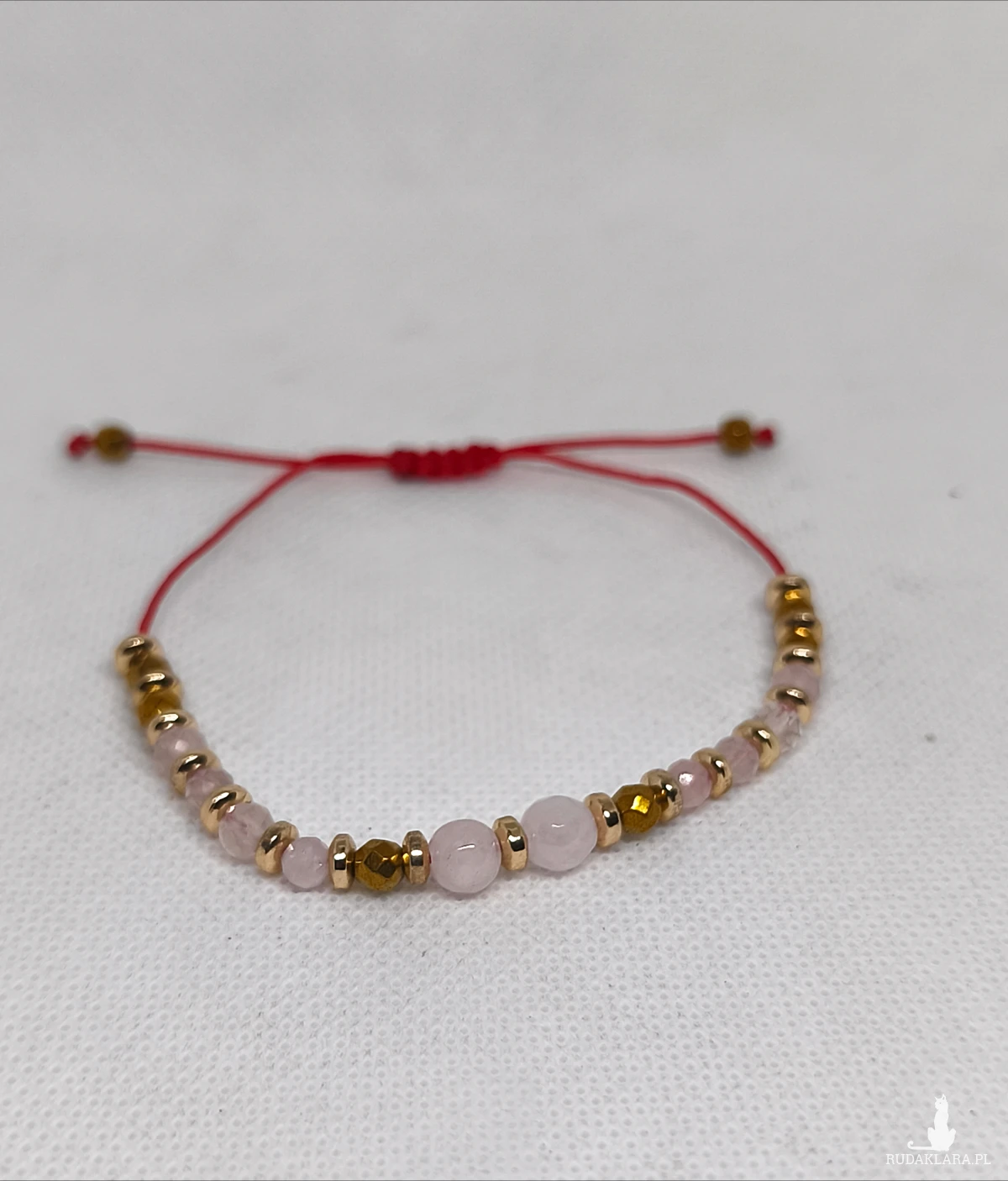 Złote, hematytowe akcenty dodają całości elegancji, a jednocześnie wzmacniają ochronę i równowagę energetyczną. Czerwony sznurek od wieków uważany jest za symbol szczęścia i ochrony – działa jak talizman, który towarzyszy Ci każdego dnia.