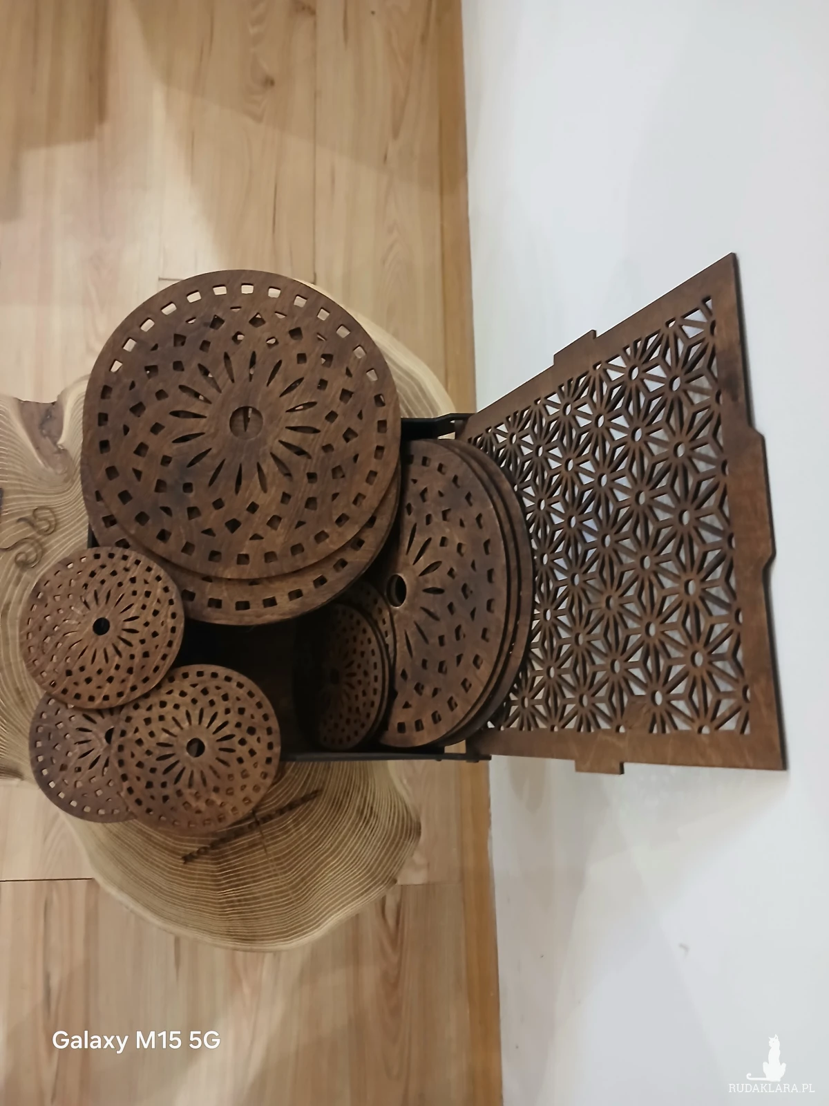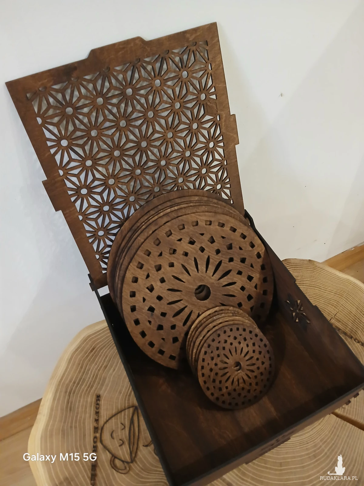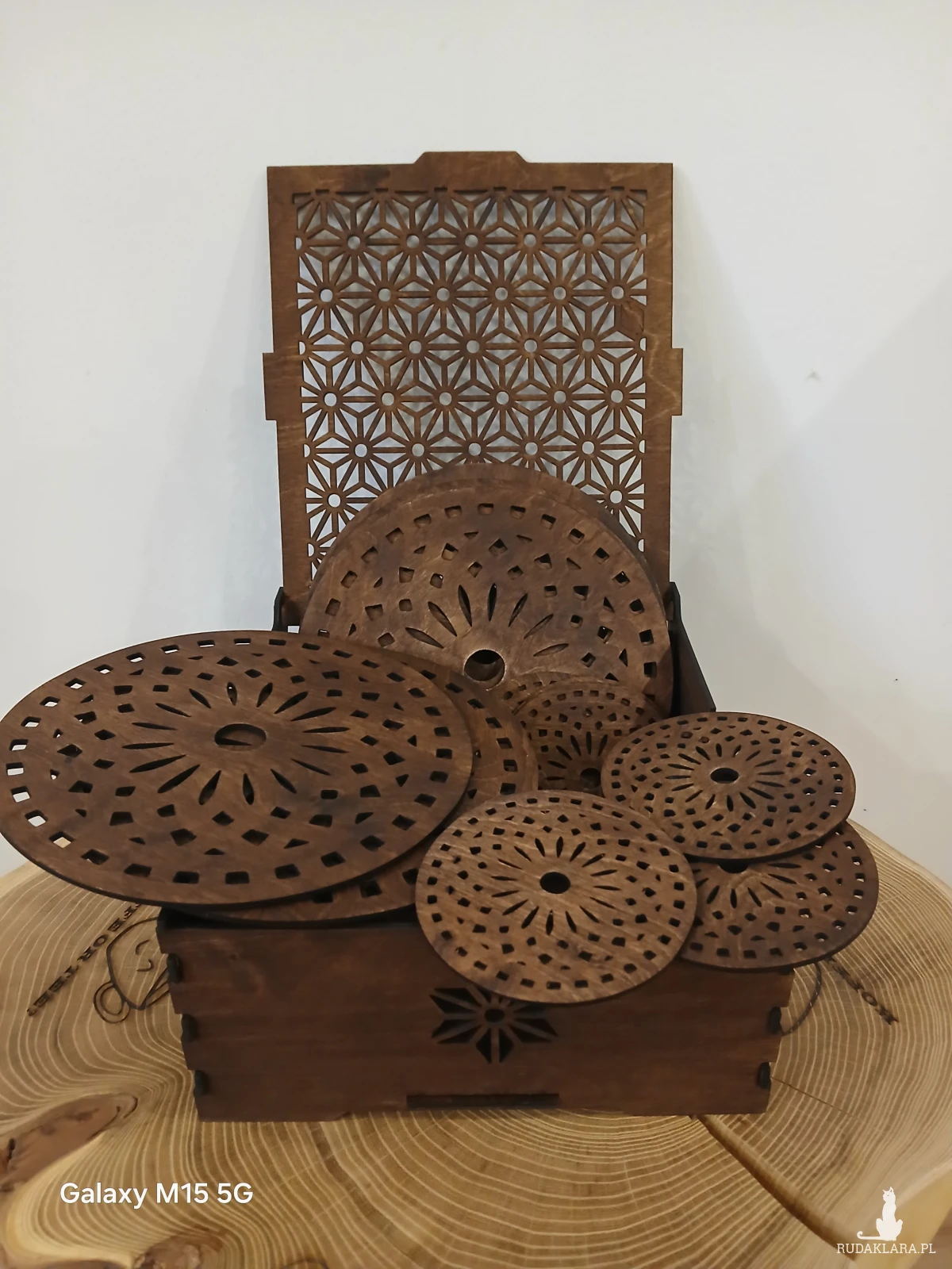 Podkładki pod talerze i kubki wycinane laserowo ze sklejki 3mm wraz ze skrzynką na te podkładki. Podkładki pod kubki 10cm,podkładki pod talerze 20cm Skrzynka wym:wys.10,5cm szer.25cm.Komplet zawiera sześć podkładek pod talerze i sześć podkładek pod kubki. Całość zabezpieczona bejcą w kolorze palisander, ale może być inny kolor jeśli go posiadam.