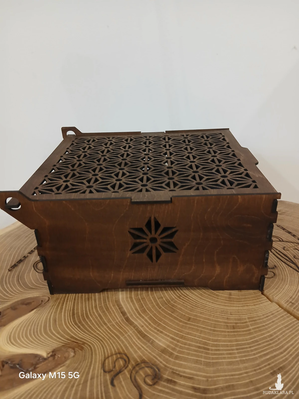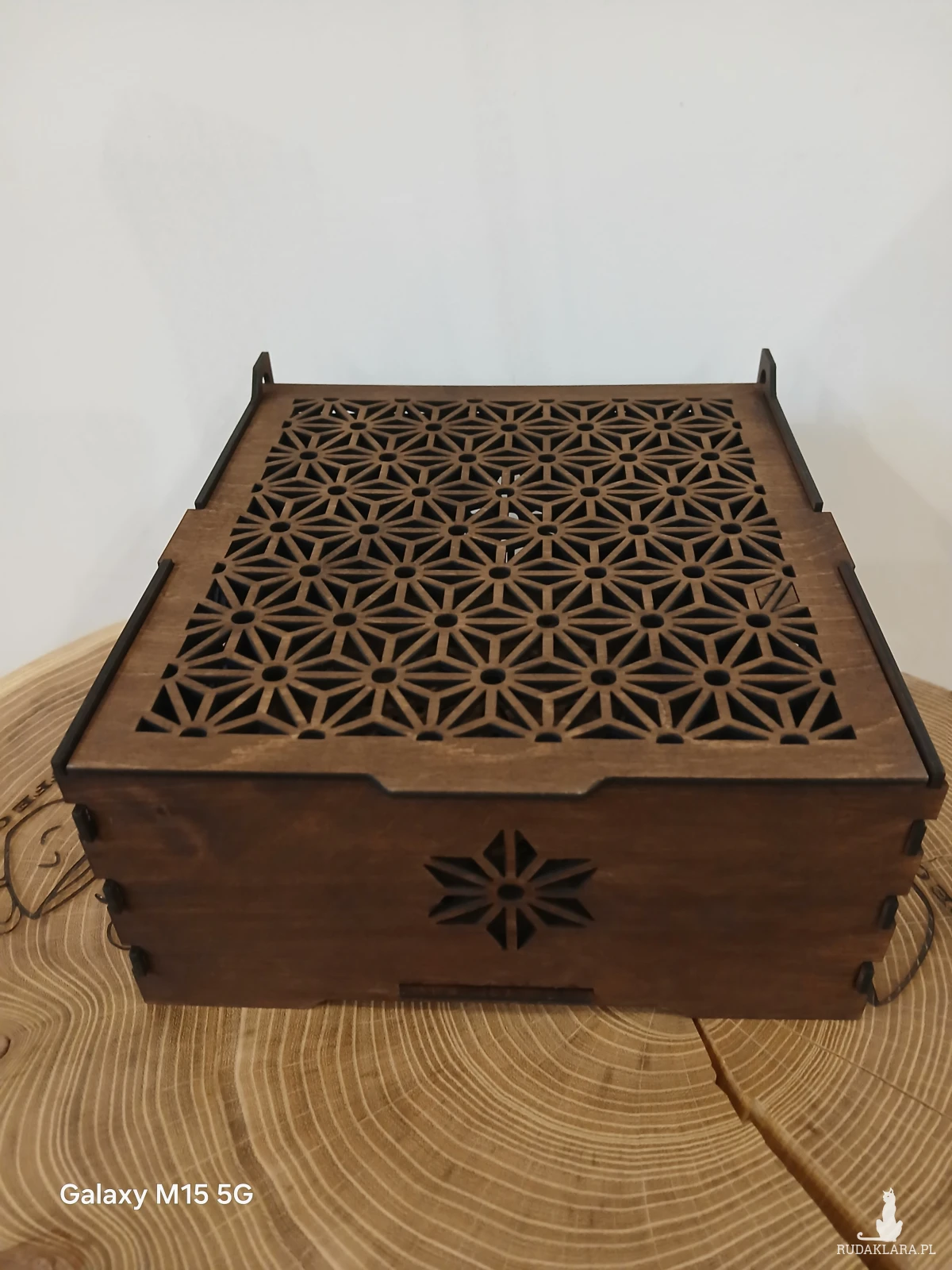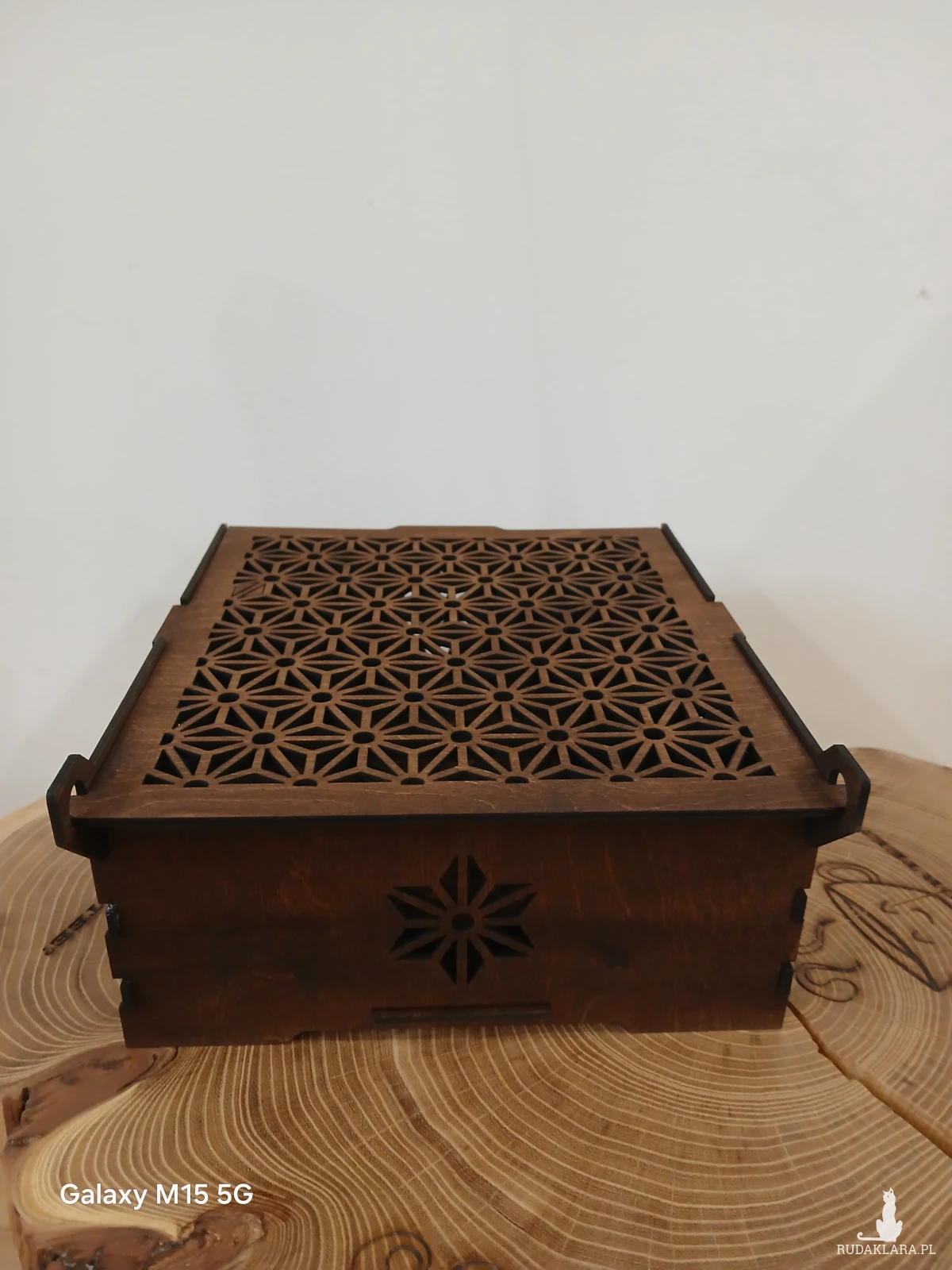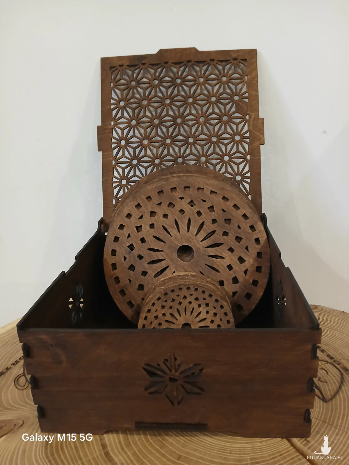 Podkładki pod talerze i kubki wycinane laserowo ze sklejki 3mm wraz ze skrzynką na te podkładki. Podkładki pod kubki 10cm,podkładki pod talerze 20cm Skrzynka wym:wys.10,5cm szer.25cm.Komplet zawiera sześć podkładek pod talerze i sześć podkładek pod kubki. Całość zabezpieczona bejcą w kolorze palisander, ale może być inny kolor jeśli go posiadam.
