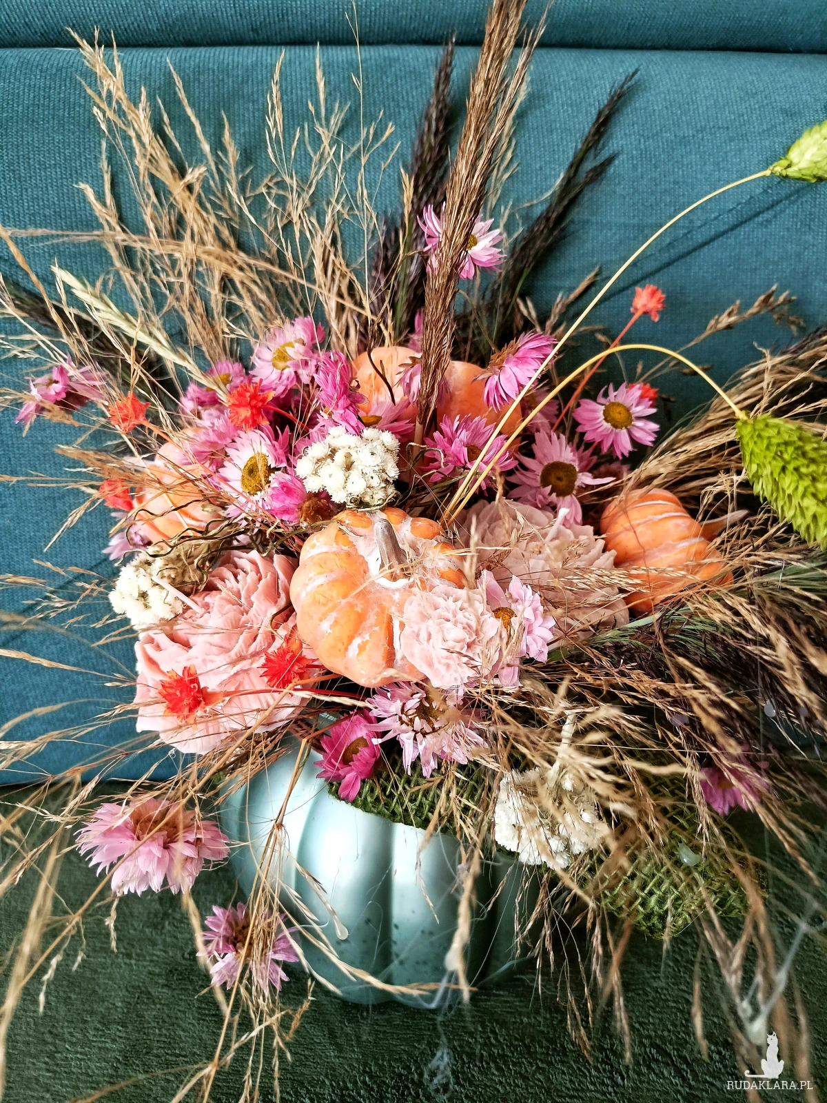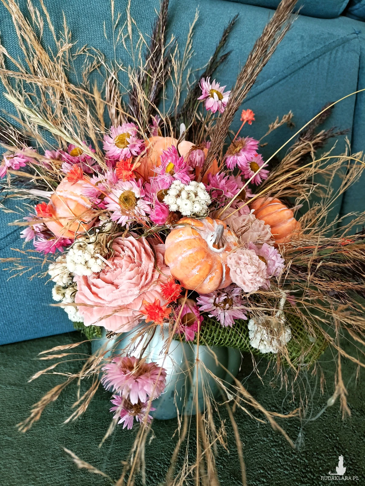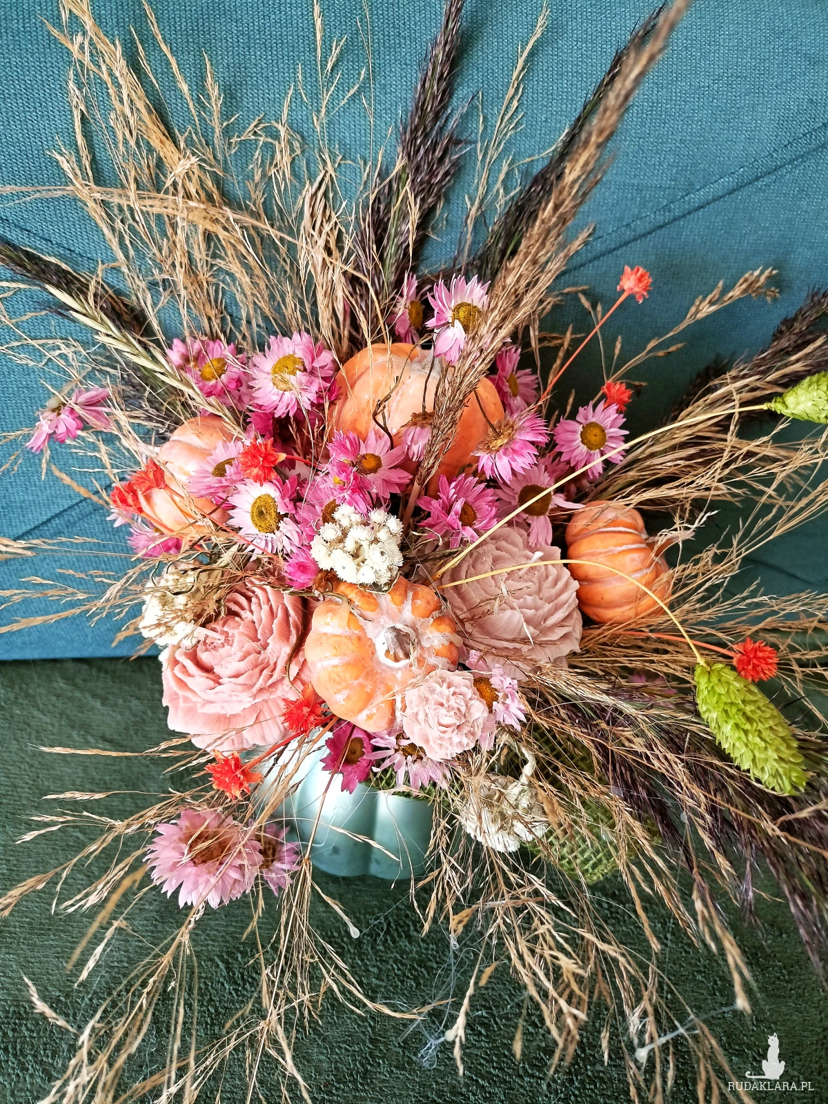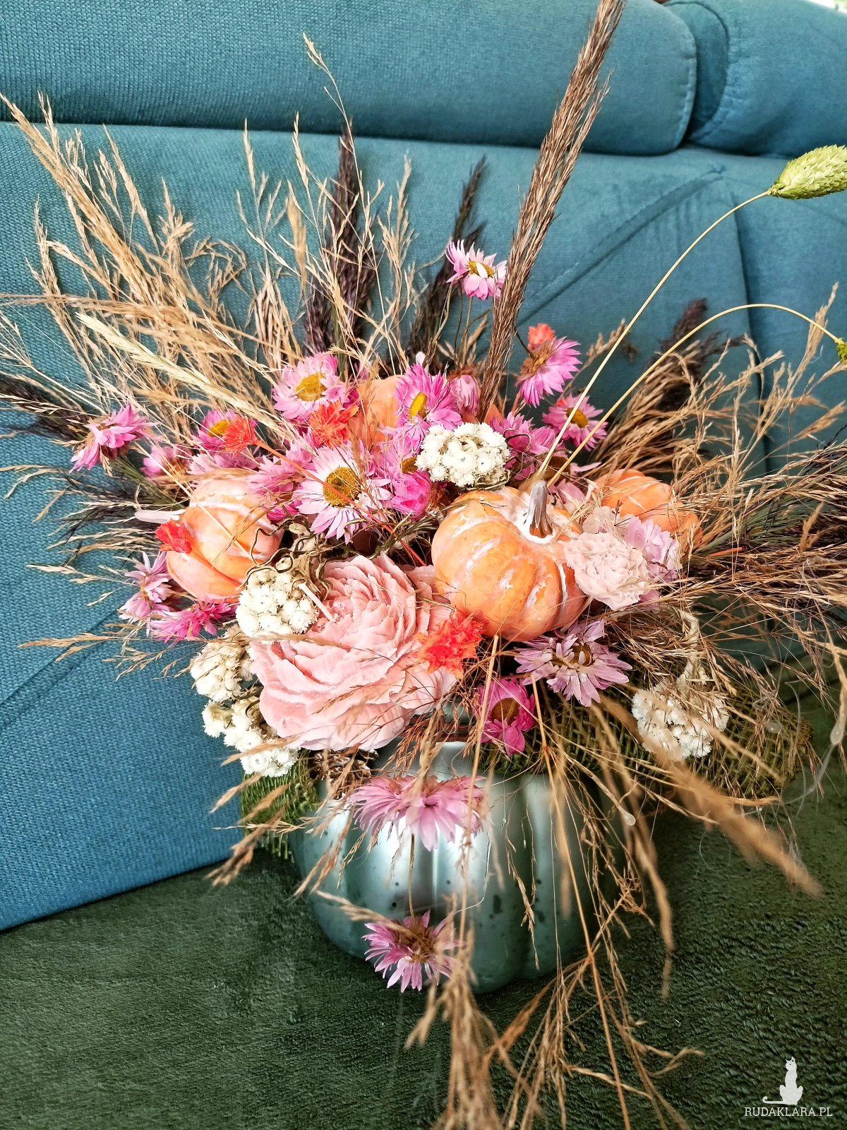 stroik jesienny handmade • dekoracja z suszonych kwiatów • bukiet w szklanym wazonie dynia • świeca sojowa z olejkami • stroik bez podlewania • jesienna dekoracja do salonu • kompozycja ze świecami • dekoracja stołu jesiennego • stroik lampion • prezent jesienny handmade
