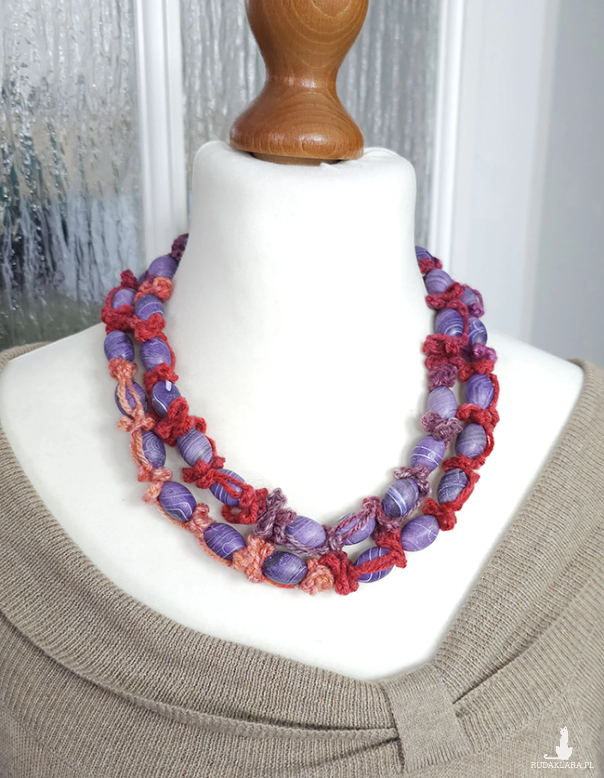 Wykonany z miękkiej włóczki akrylowej, wewnątrz której ukryliśmy fioletowe koraliki.