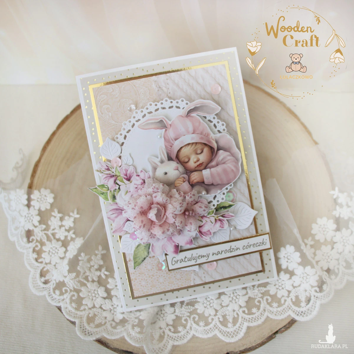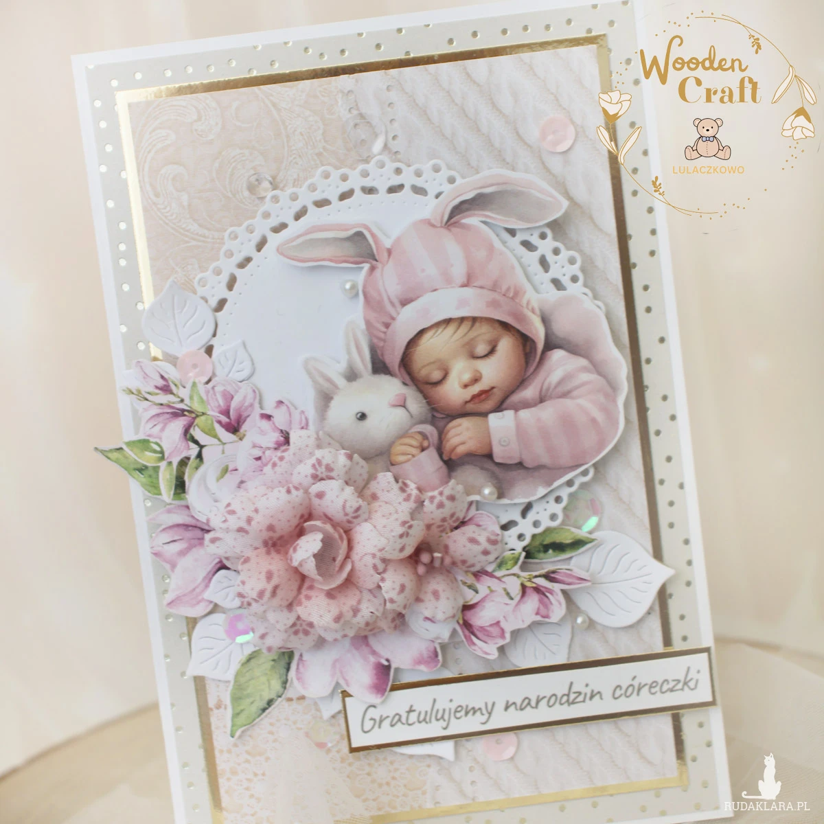 Przepiękna i delikatna kartka gratulacyjna z okazji narodzin maluszka, utrzymana w odcieniach oliwkowej zieleni, beżu i różu z dodatkiem złotych błyszczących akcentów. Kartka wykonana ręcznie z dbałością o każdy szczegół, z mixu kolekcji papierów. Na froncie znajduje się grafika uroczej śpiącej dziewczynki z króliczkiem, ozdobiona kompozycją kwiatową z materiałowych kwiatuszków, dodatkowo zdobiona cekinami, a także napisem "Gratulujemy narodzin córeczki" (na życzenie mogę wkleić na kartce również imię dziecka).