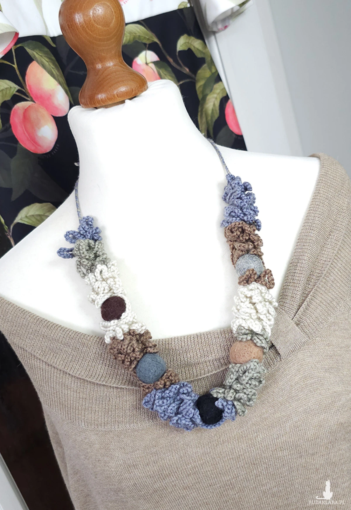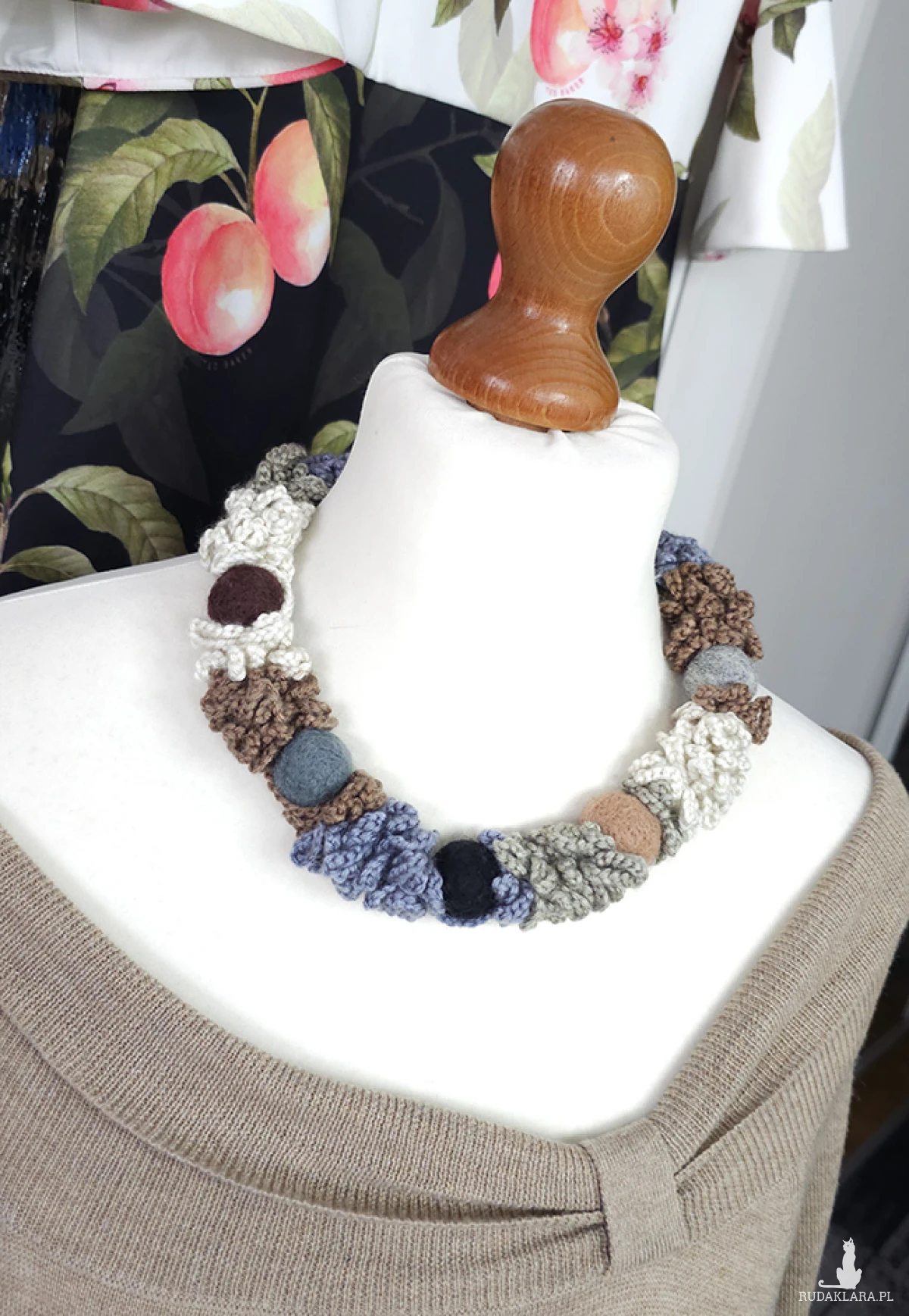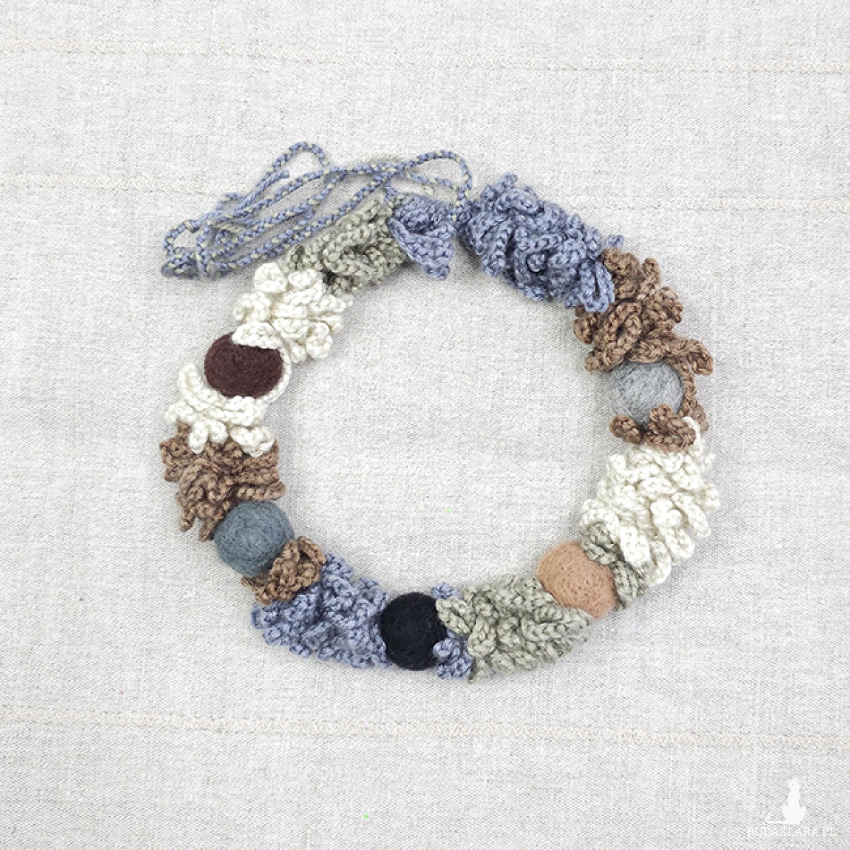 Wykonany z miękkiej włóczki, ozdobiony filcowymi koralami w naturalnych odcieniach, które kojarzą się z leśnym mchem, kamieniami i ziemią.