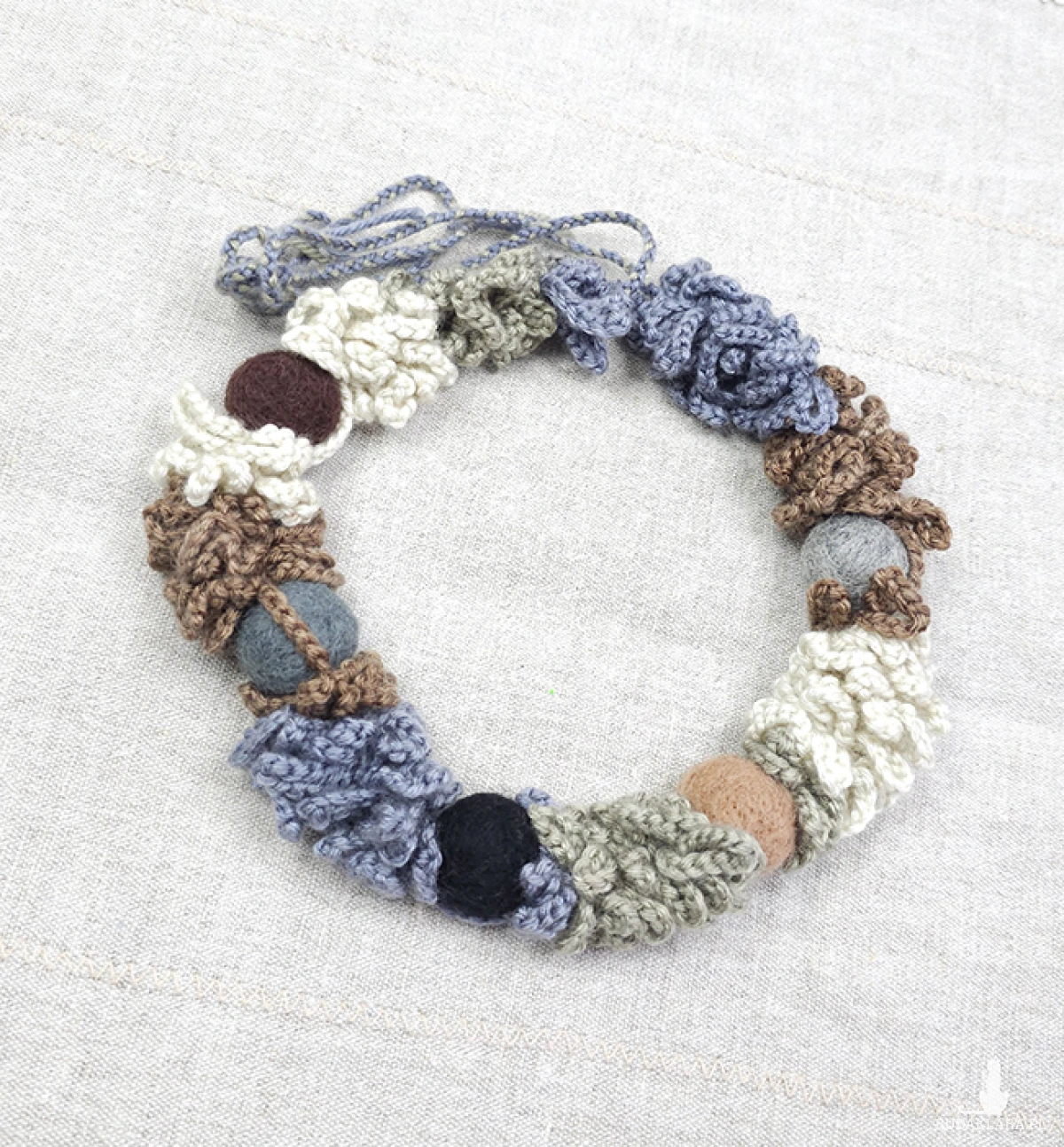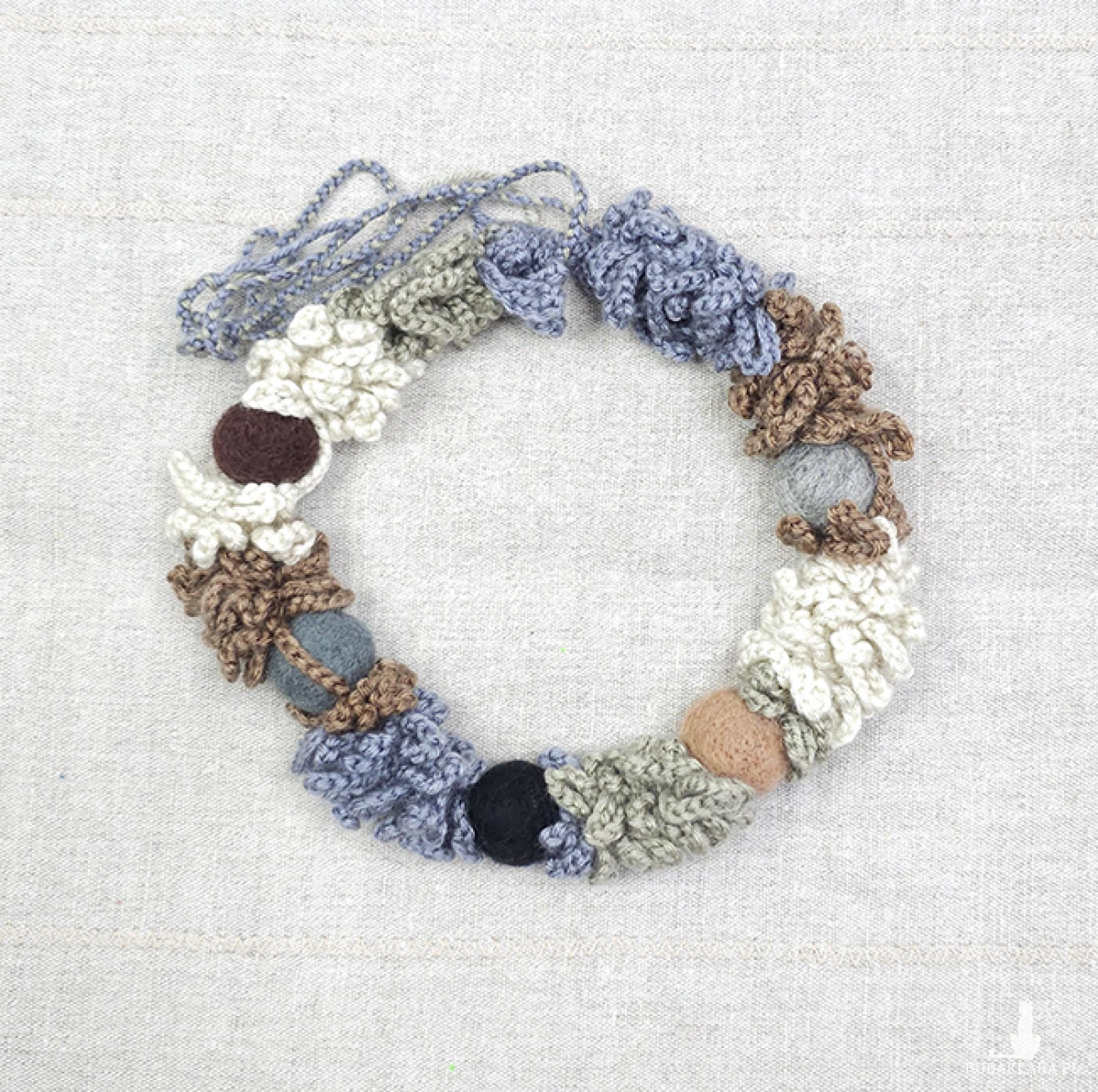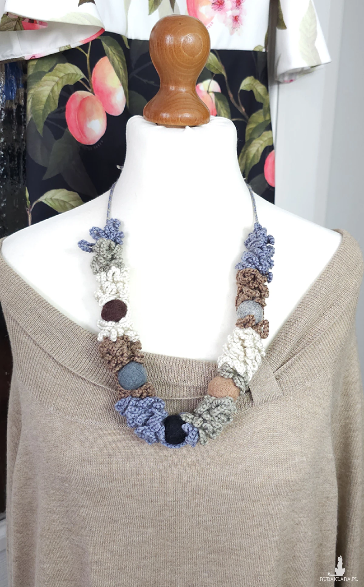 Wykonany z miękkiej włóczki, ozdobiony filcowymi koralami w naturalnych odcieniach, które kojarzą się z leśnym mchem, kamieniami i ziemią.