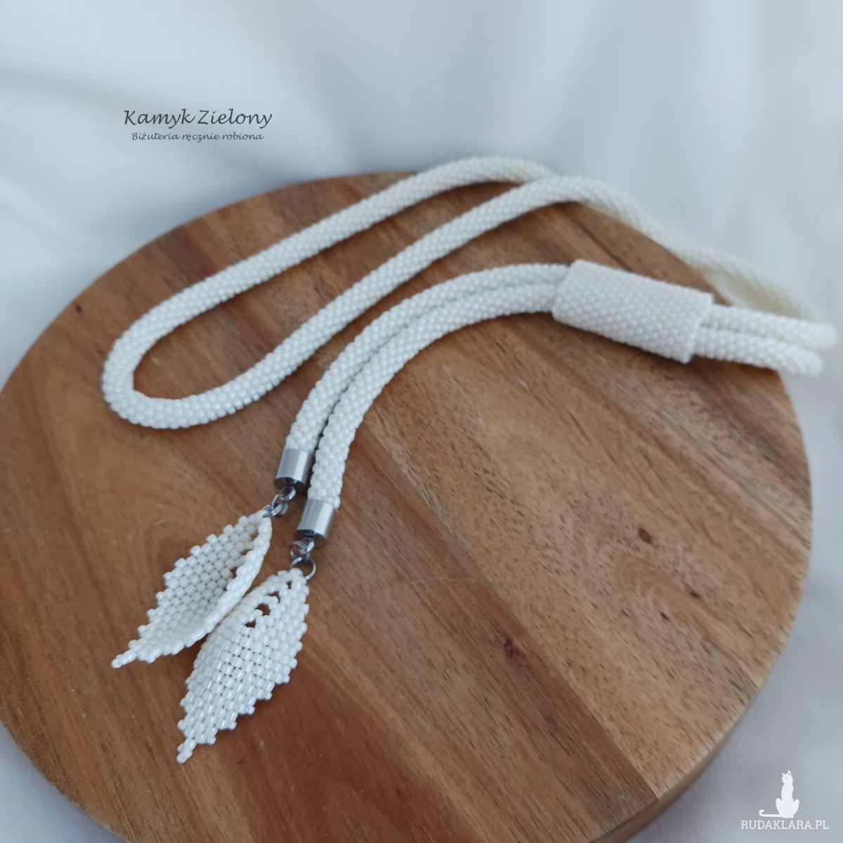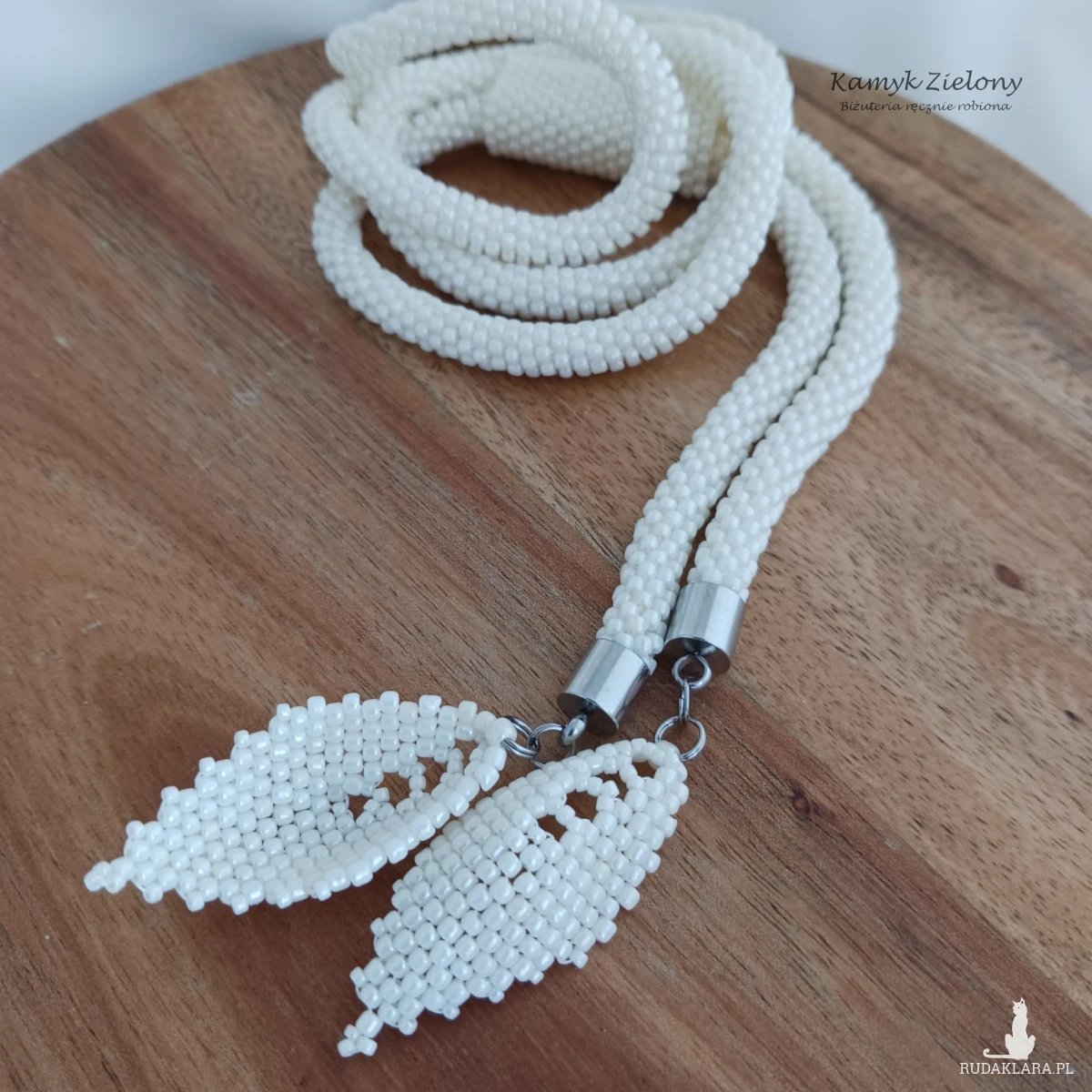Naszyjnik nie ma klasycznego zapięcia - ma formę długiego sznura koralikowego o końcach połączonych na stałe koralikową opaską (można ją przesuwać na dowolną wysokość). Został wykończony koralikowymi listeczkami. Długość listków wynosi ok. 4 cm.