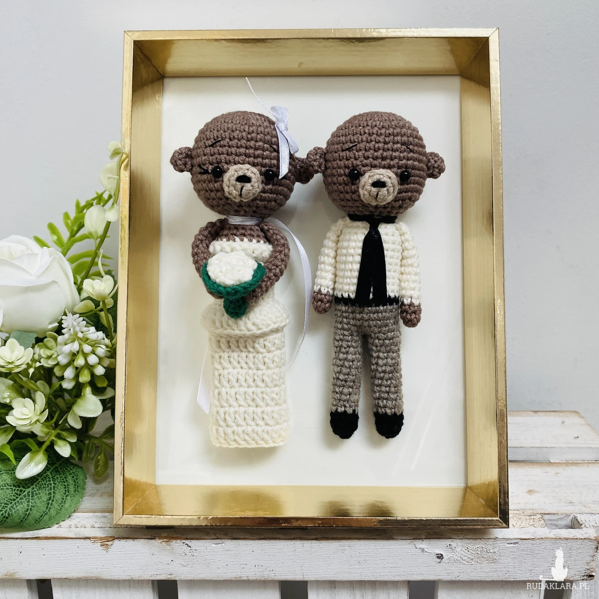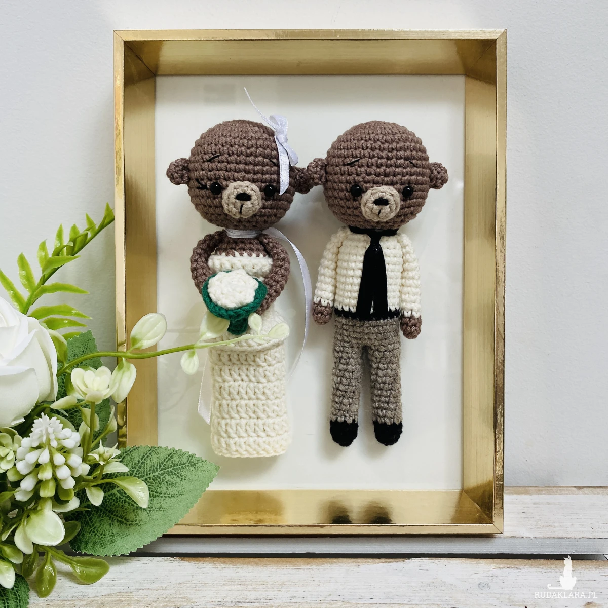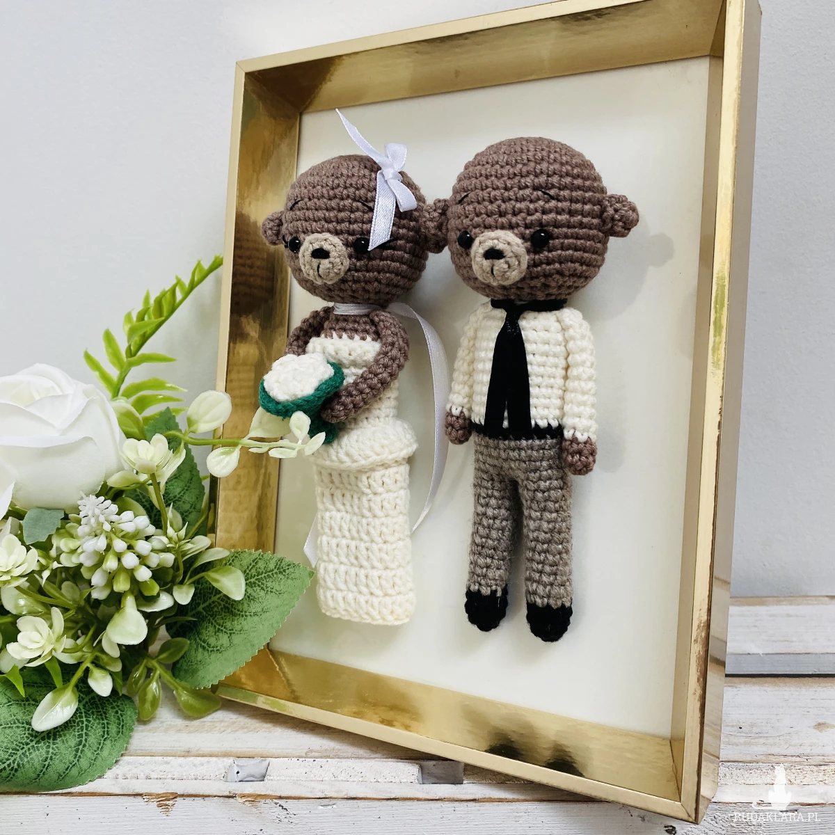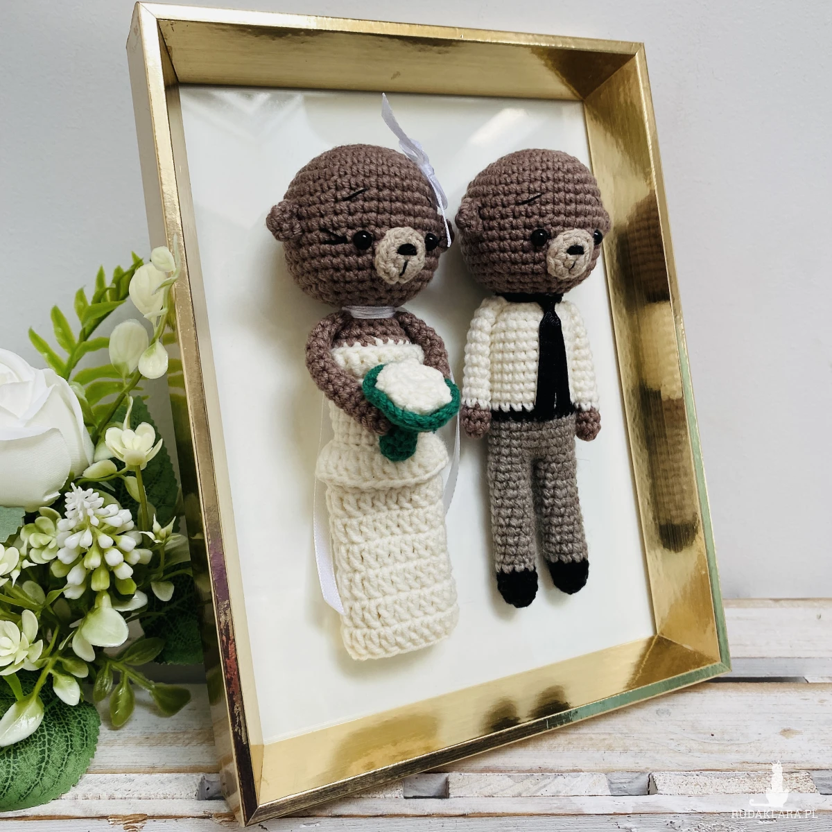 Młoda Para – misie maskotki w złotej ramce ręcznie robione na szydełku – idealny prezent ślubny