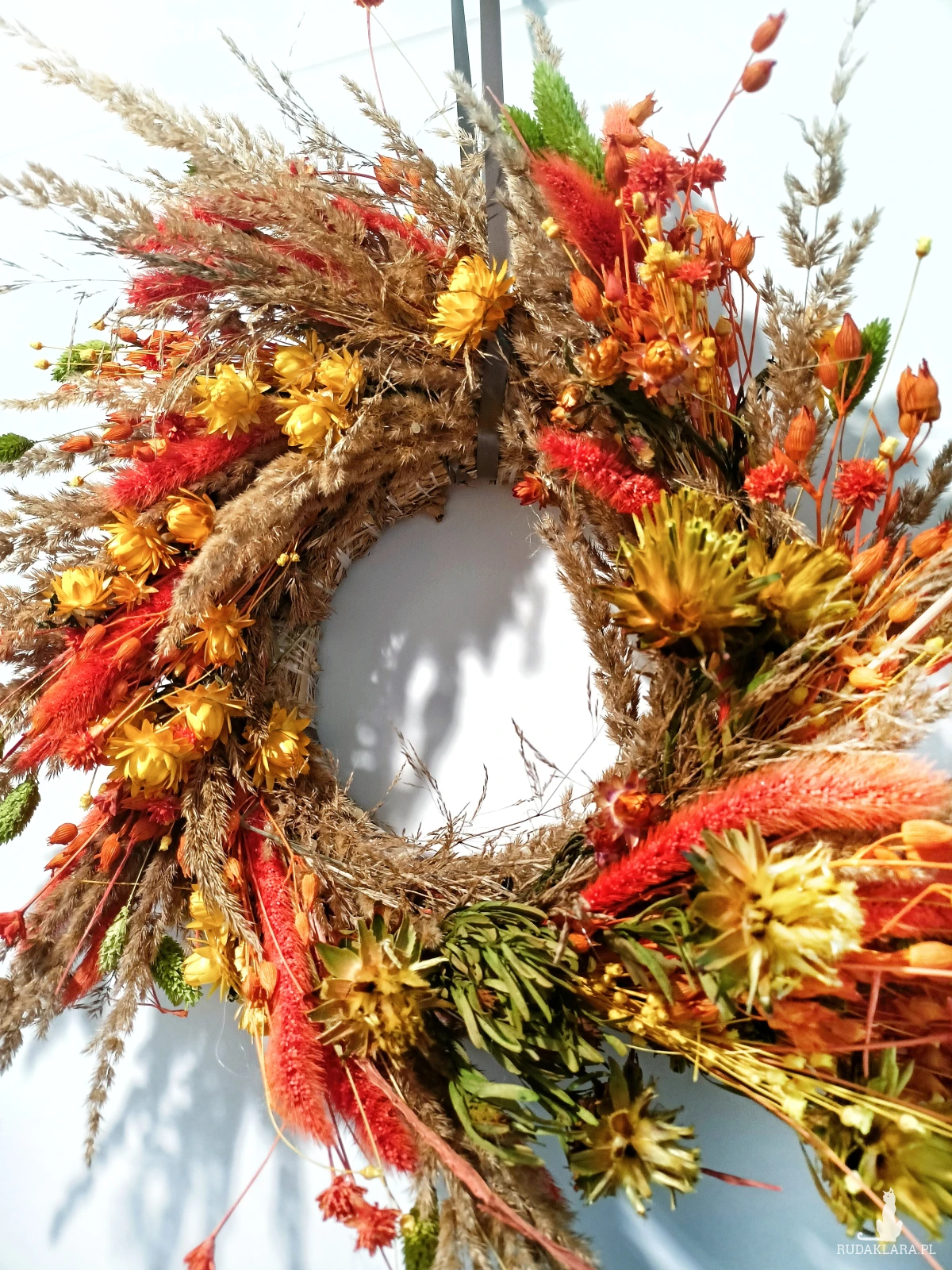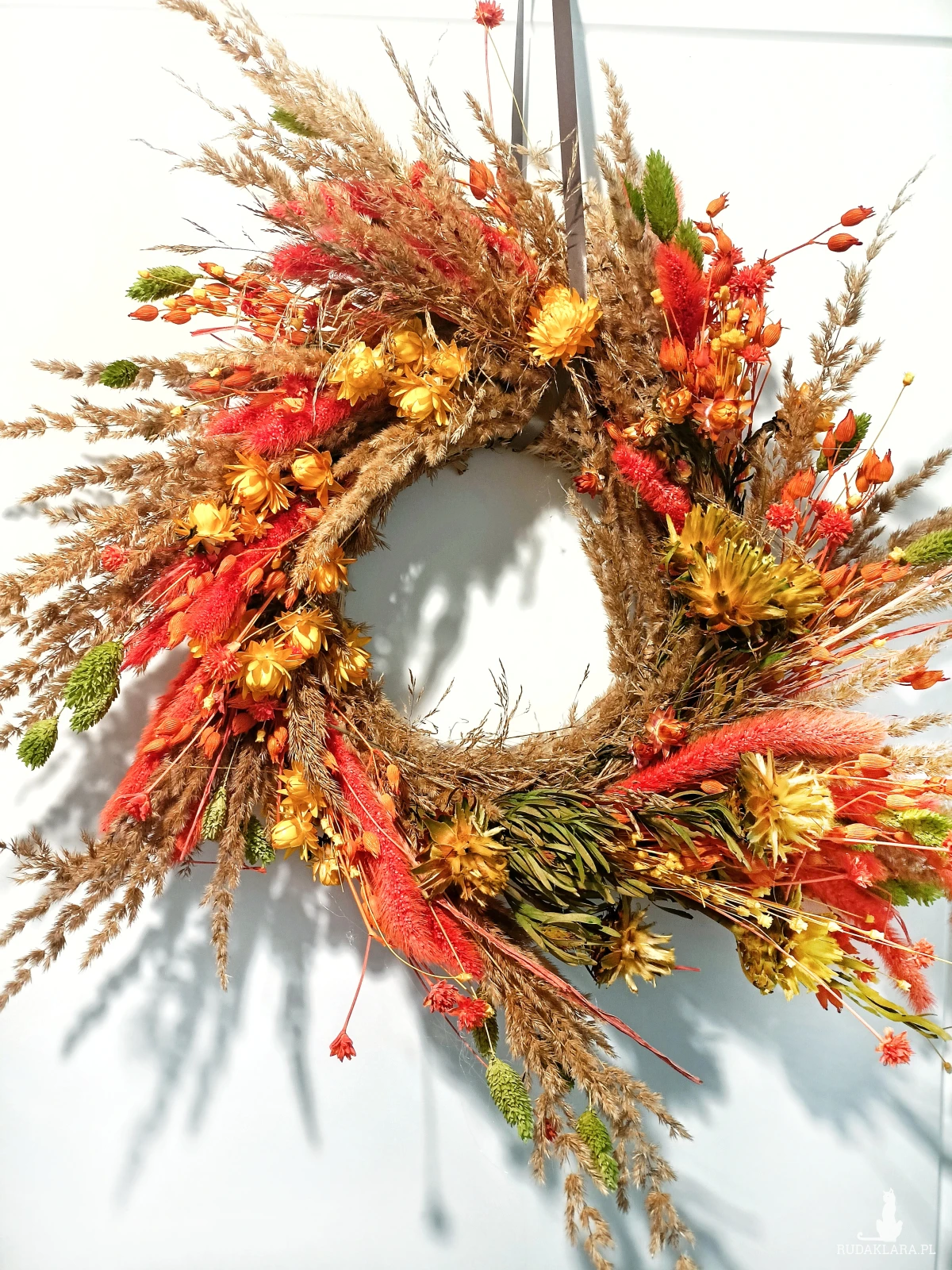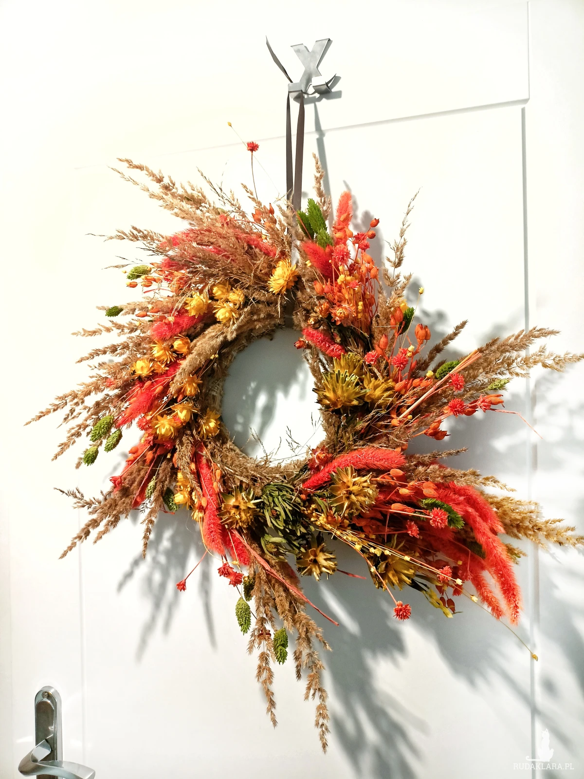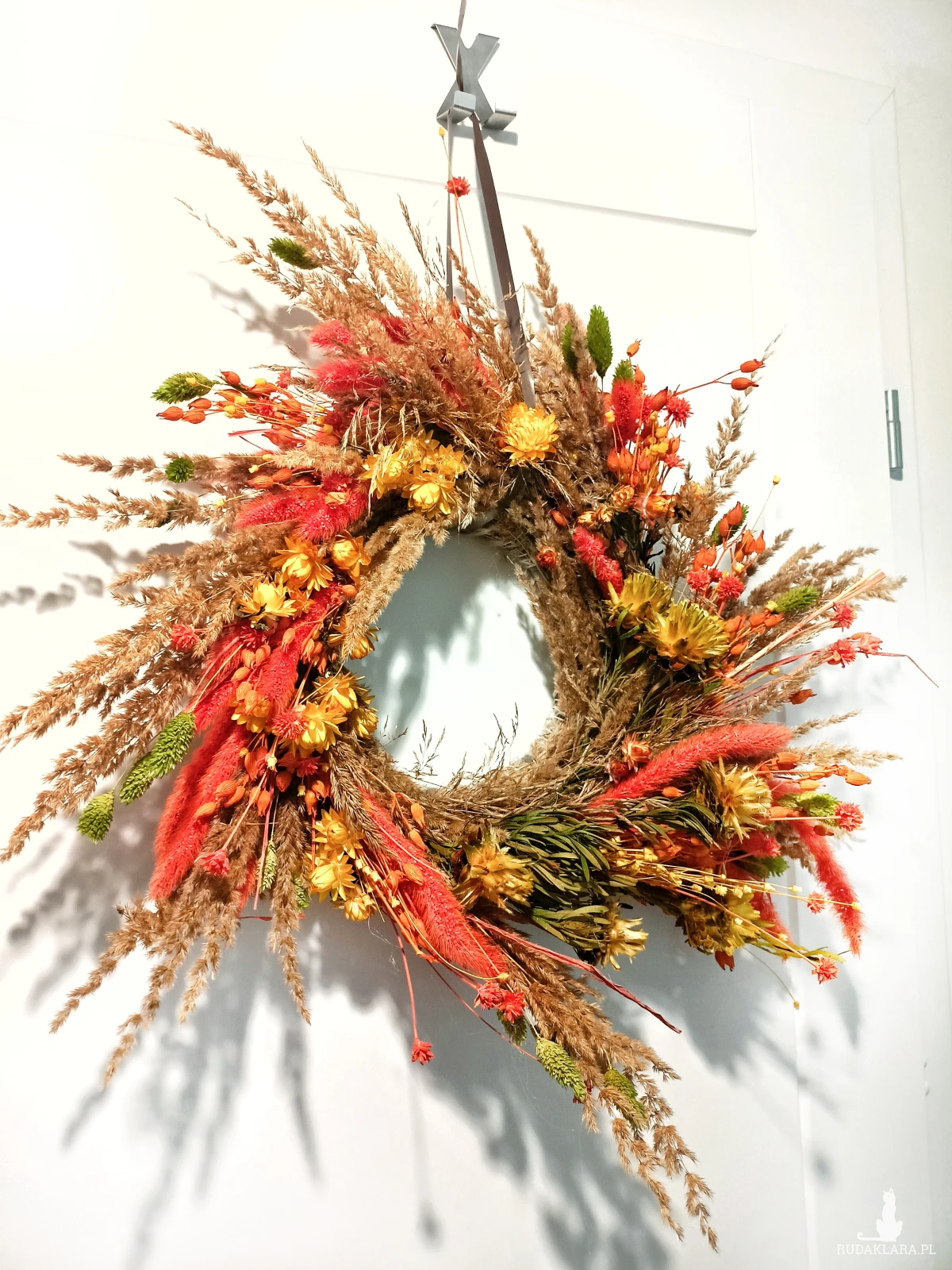 wianek jesienny • dekoracja jesienna na drzwi • wianek z suszonych roślin • wianek handmade • wianek na słomianej bazie • wianek z kwiatów stabilizowanych • ozdoba jesienna • wianek rustykalny • dekoracja boho jesień • wianek na ścianę • ozdoba stołu jesiennego